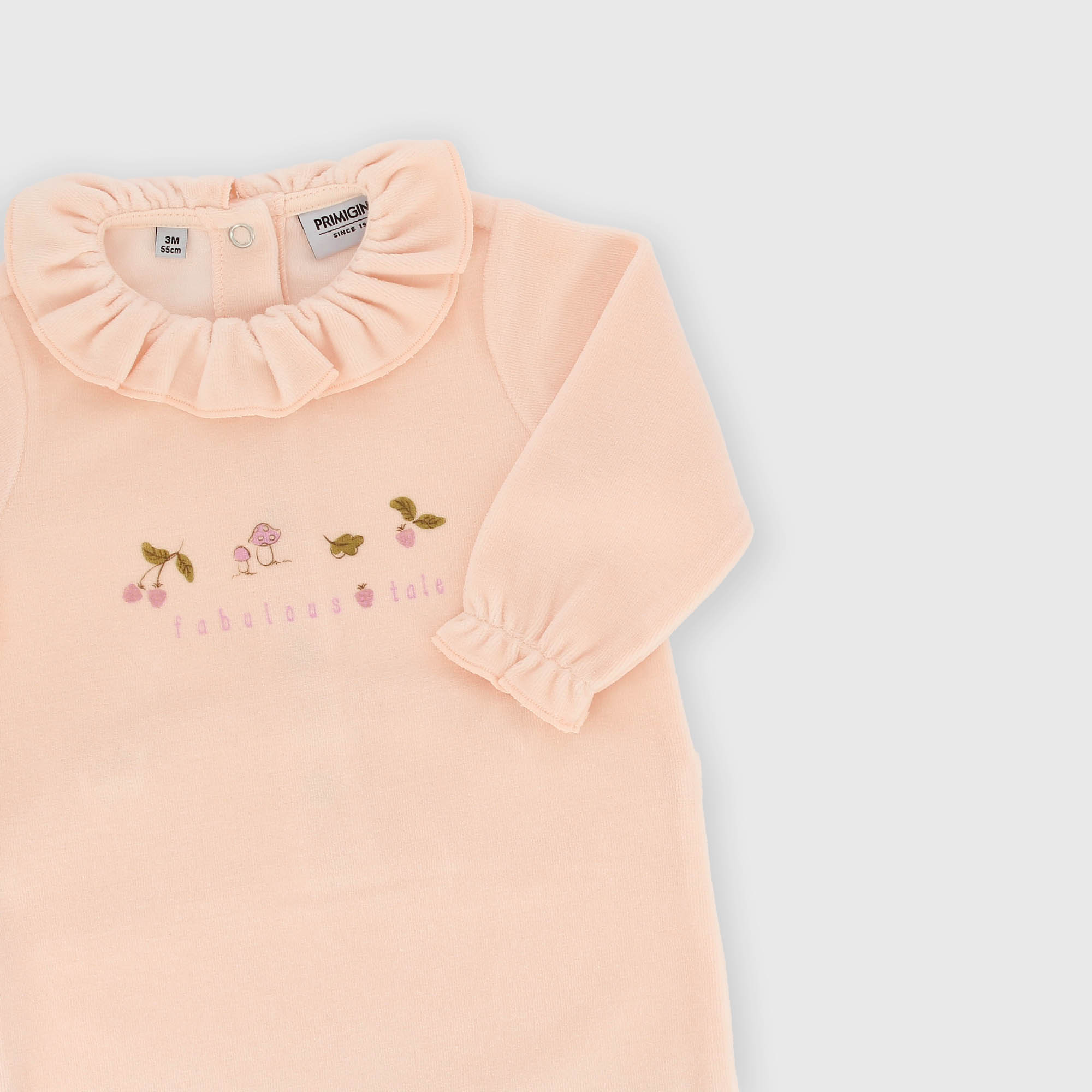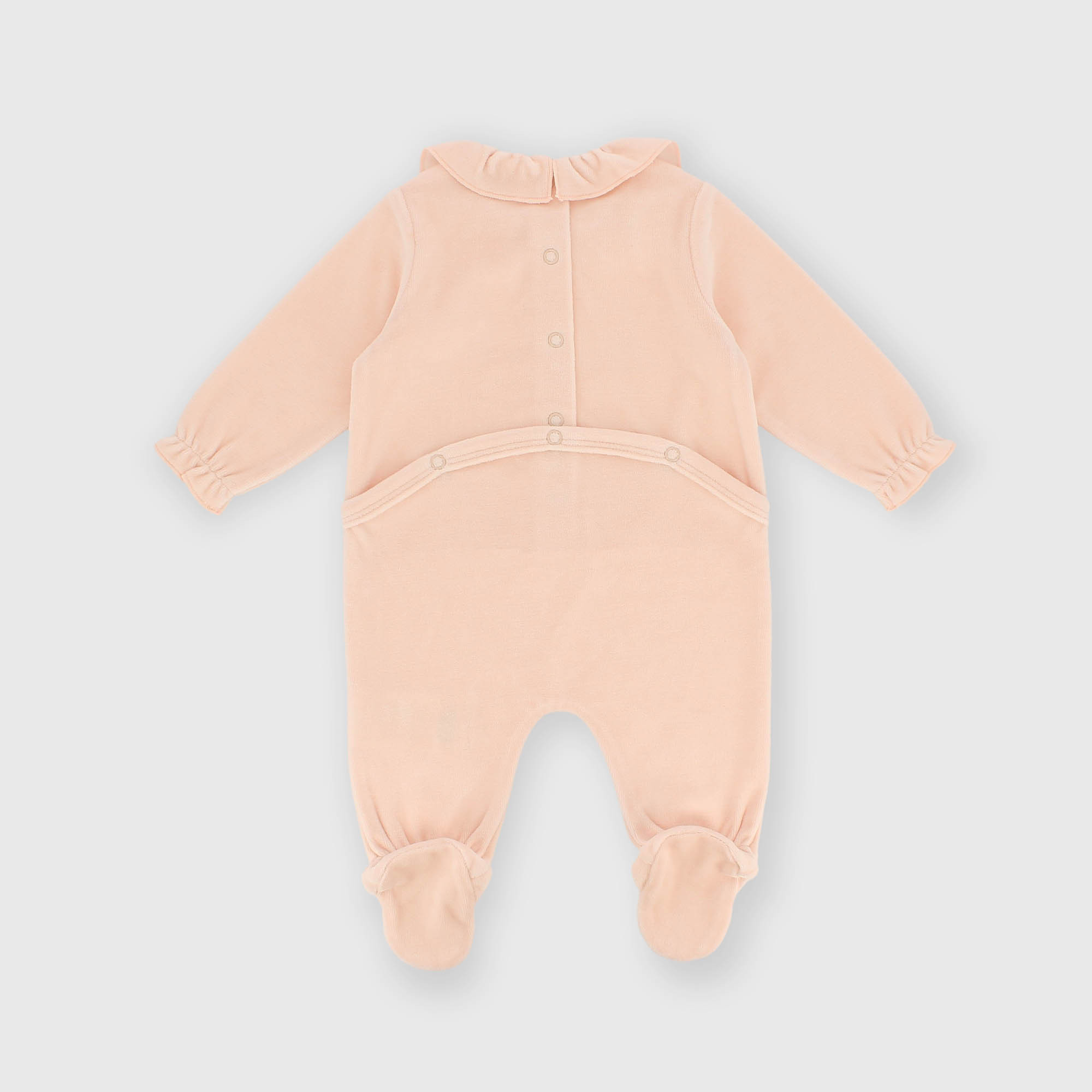 Chenille jumpsuit, with ruffled collar, long sleeves. Back closure with snap buttons. Print on the front. Elasticated cuffs.