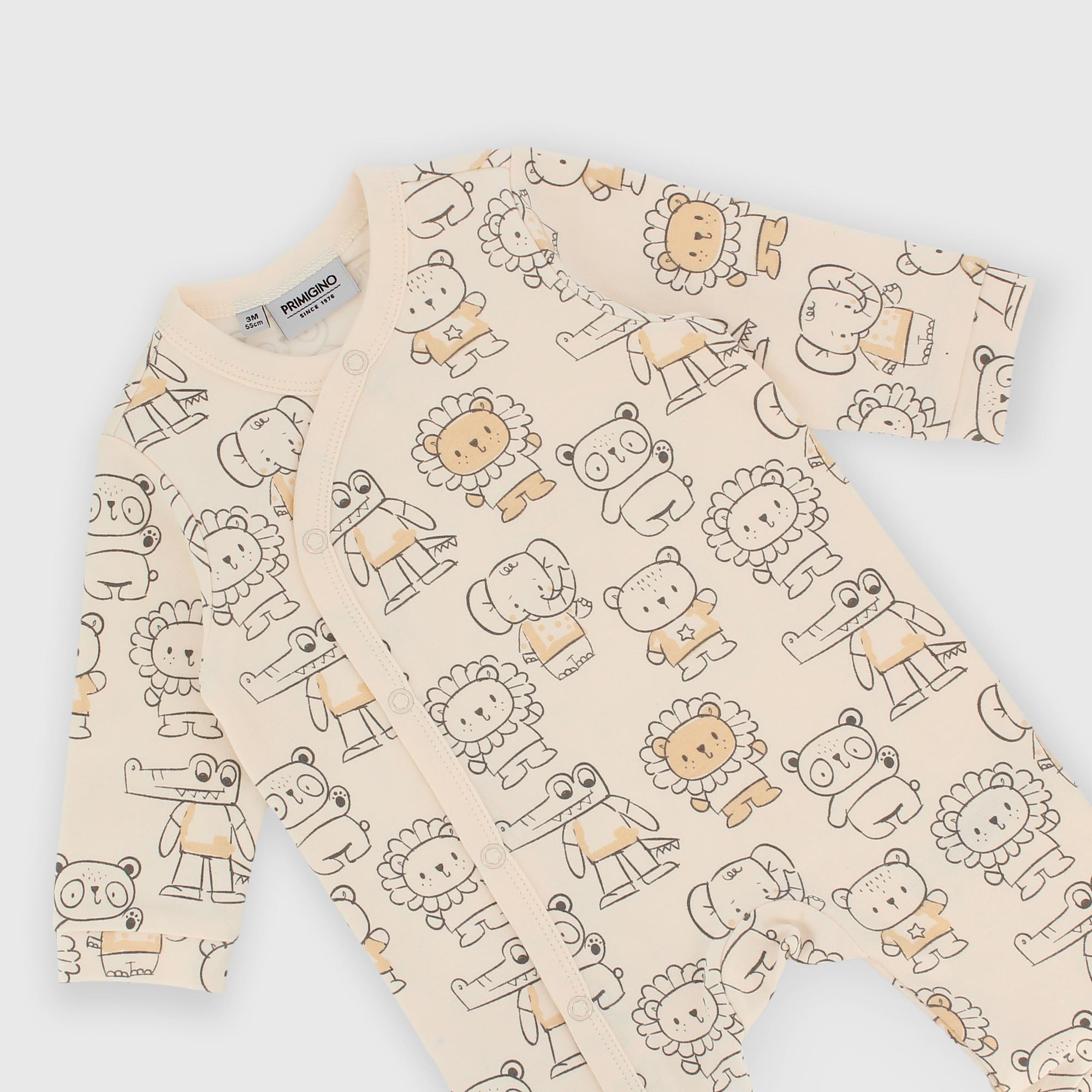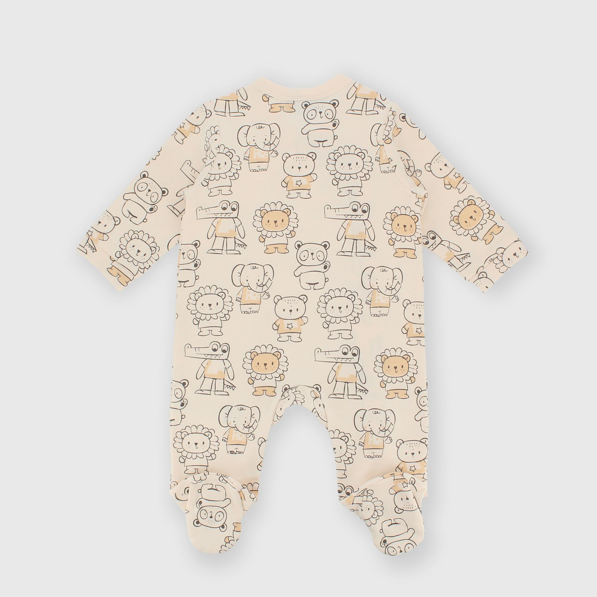 Crew-neck interlock playsuit with long sleeves. Kimono closure with automatic buttons. All-over animal print.