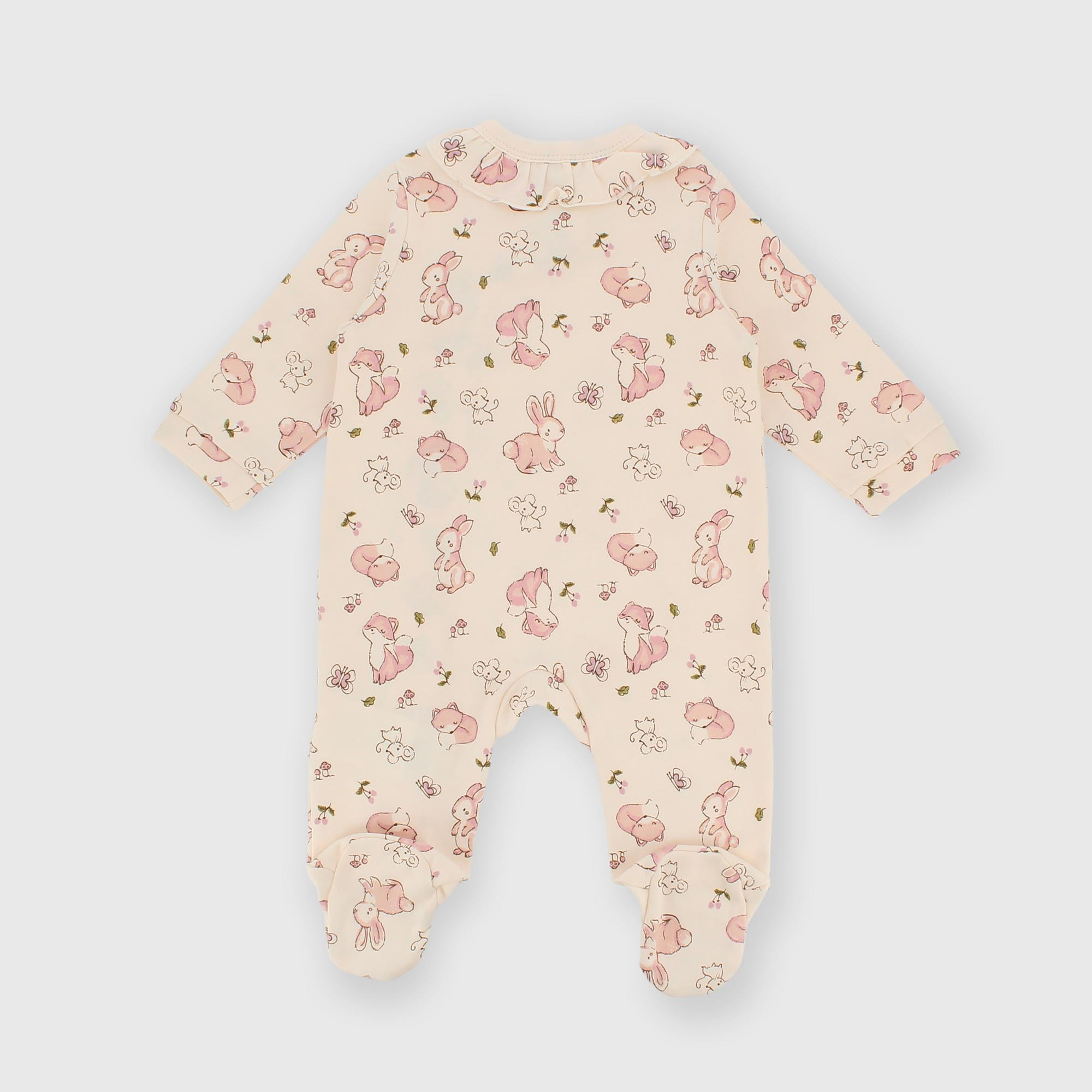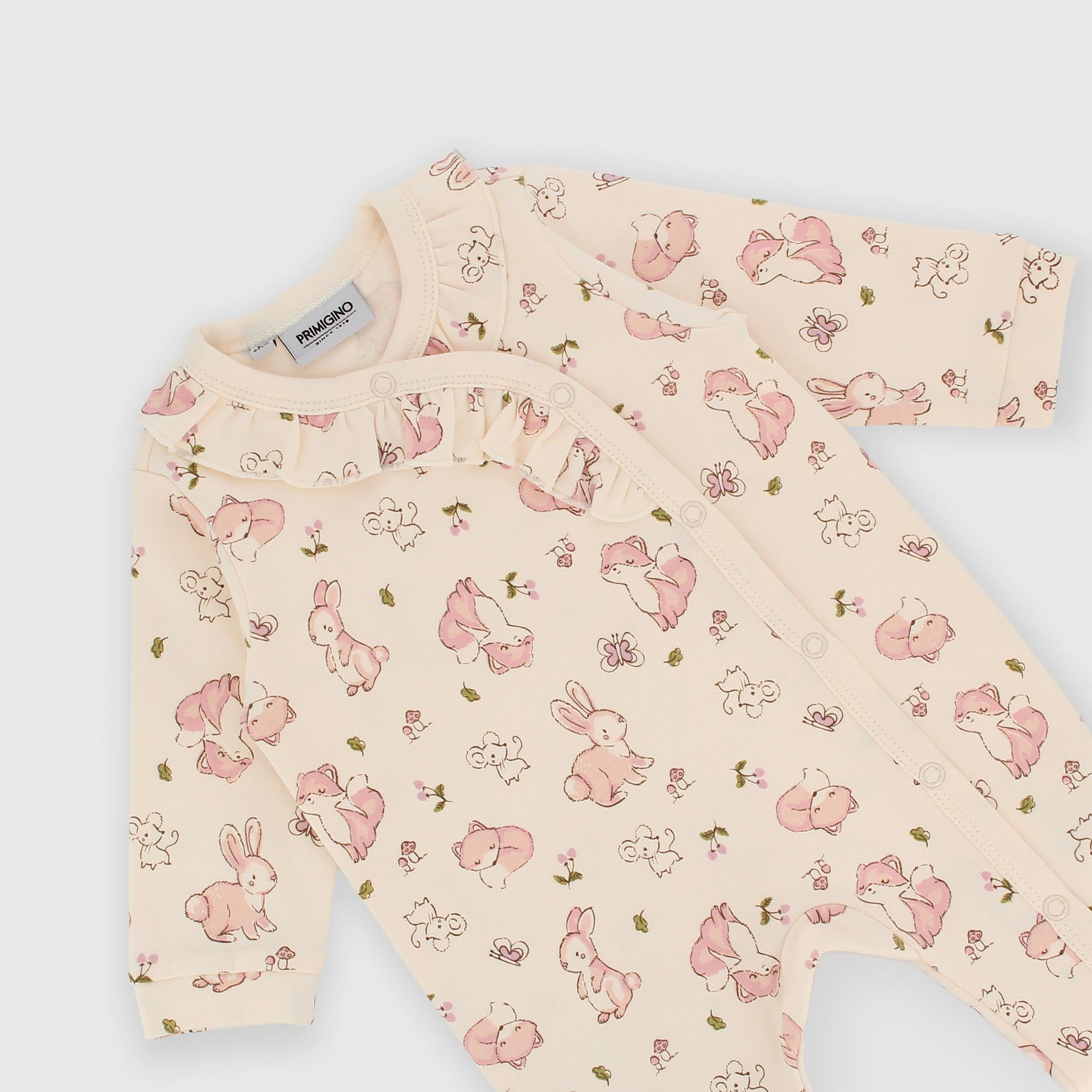 Interlock overall with a round neck and long sleeves. Kimono-style closure with snap buttons. Frills on the front. All-over print of rabbit, fox and a little mouse.