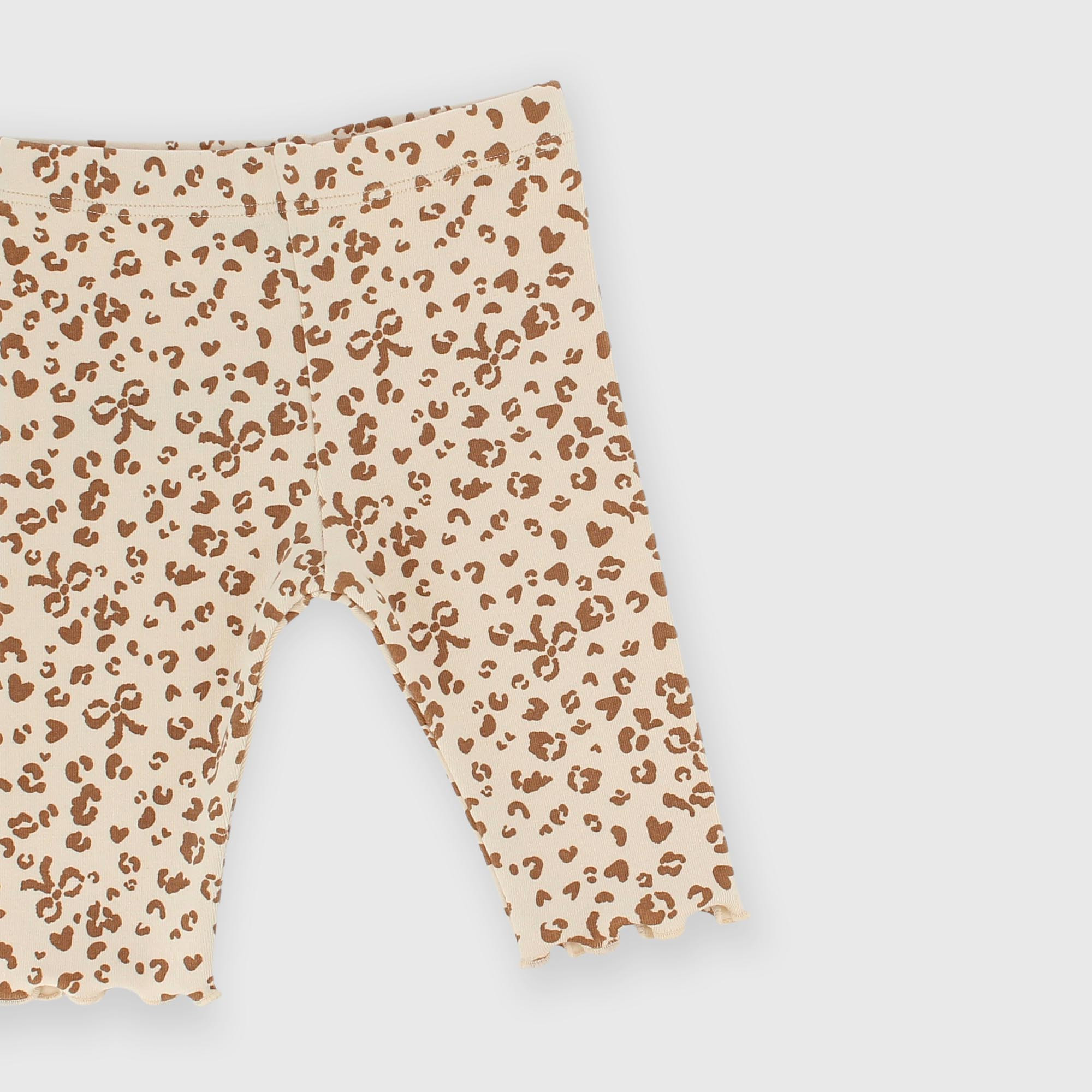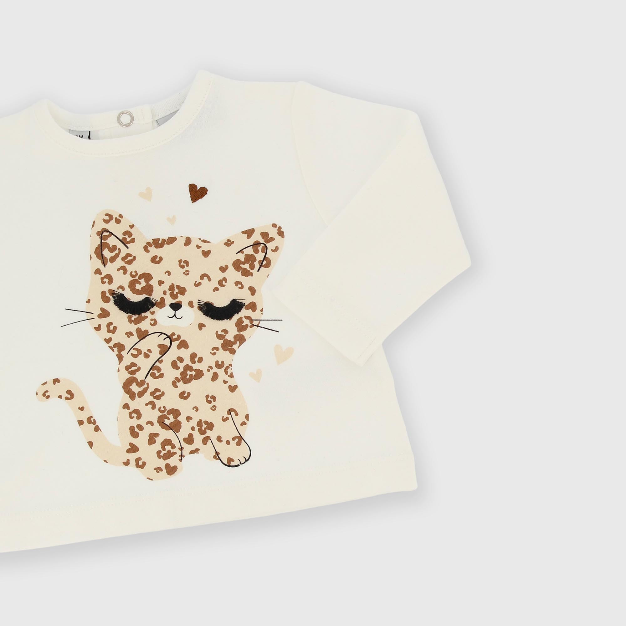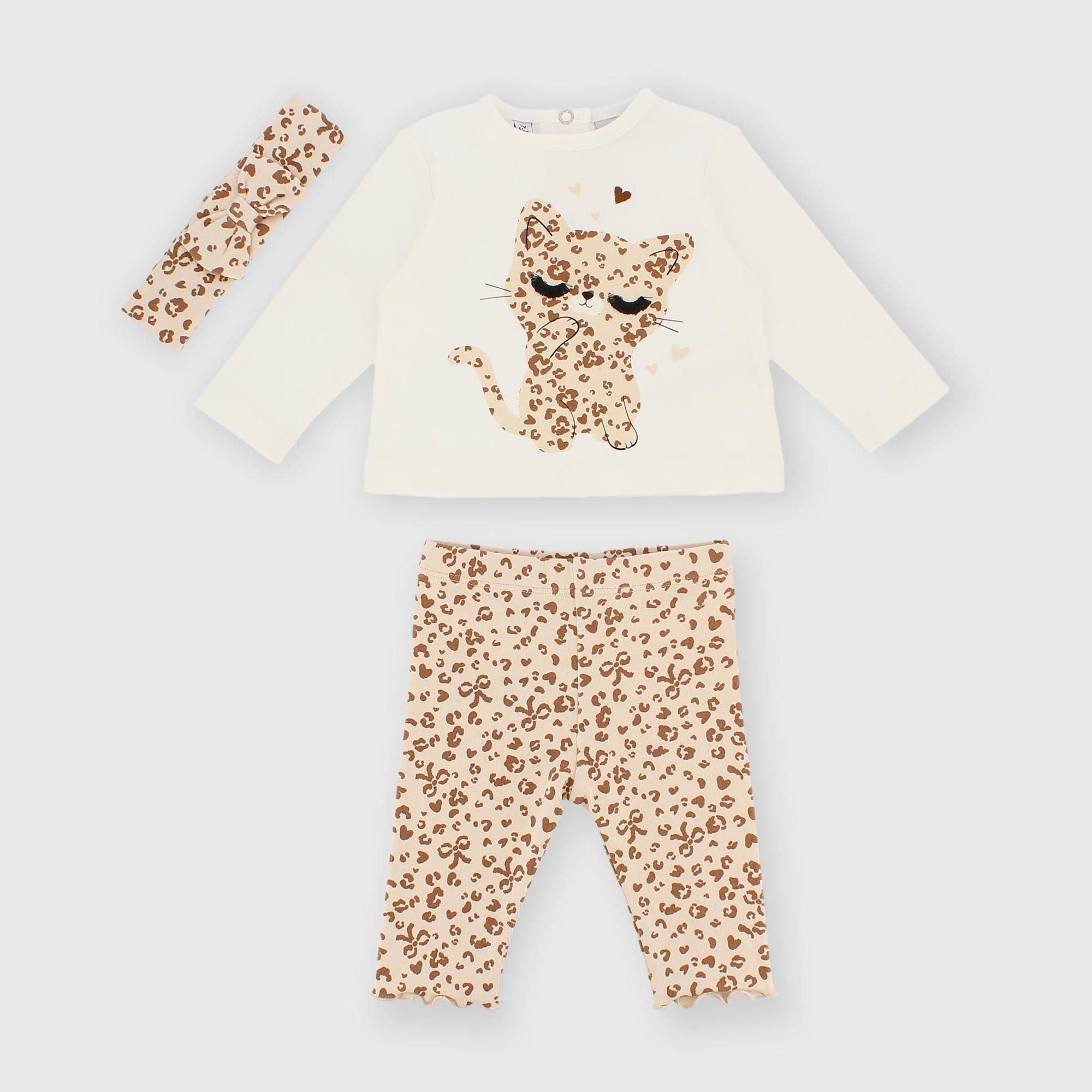 Complete set consisting of three pieces. Long-sleeve crew neck t-shirt made of warm cotton. Back closure with snap buttons. Print on the front. Leggings with elasticized waist, all-over animal print. Trimmed with doll point. Matching headband with animal print.