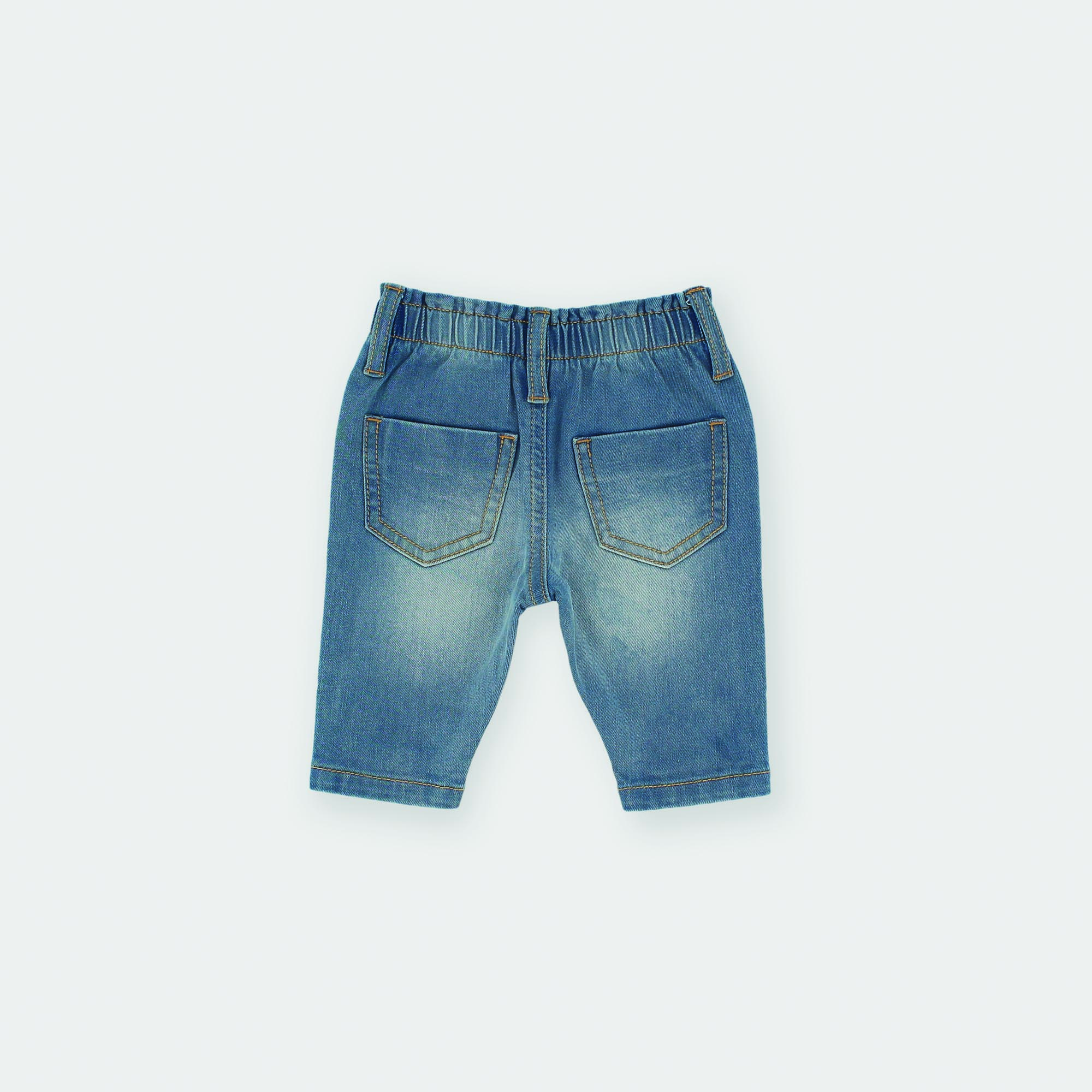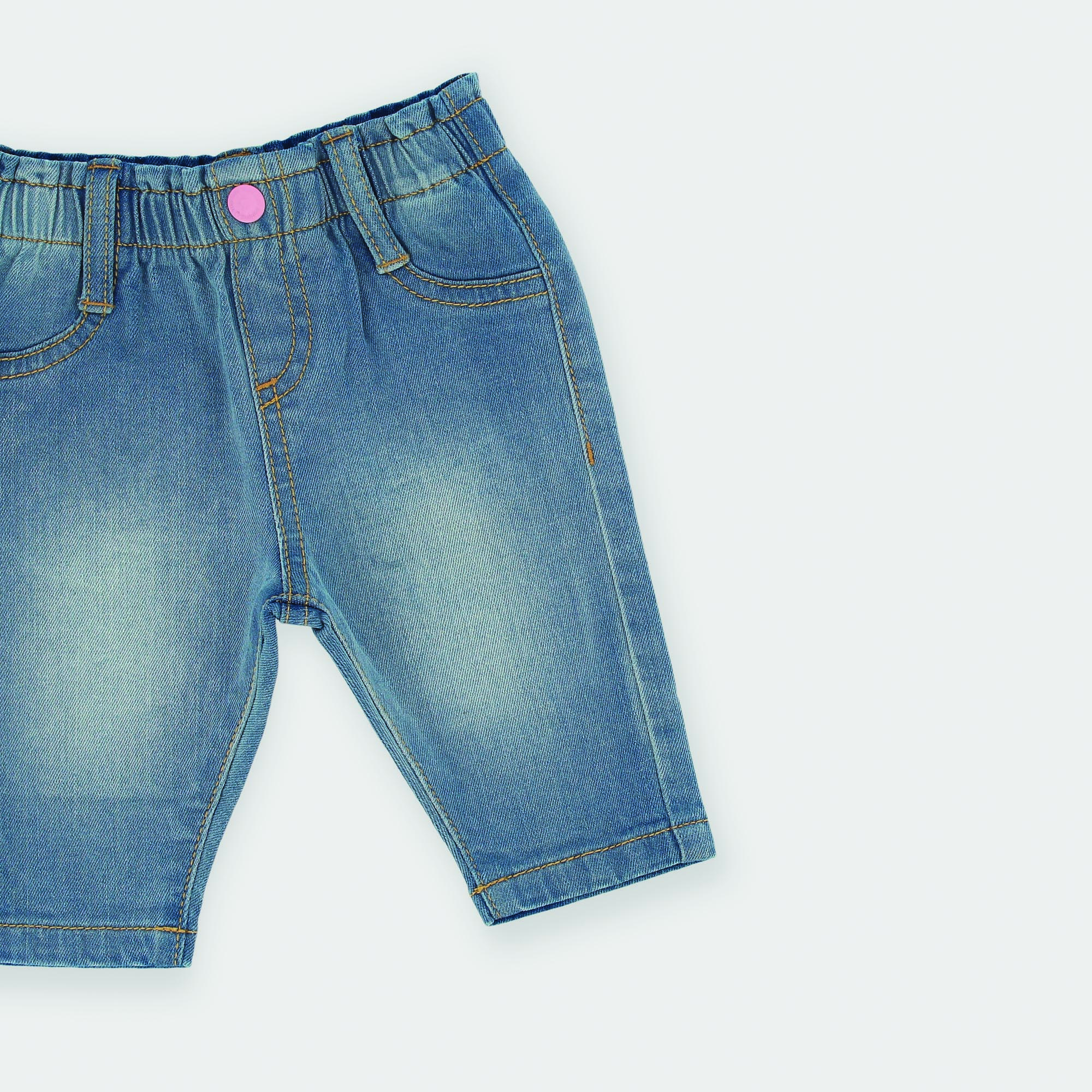 Denim trousers with elasticated waistband and button on the front. Fake front pockets and patch pockets on the back.