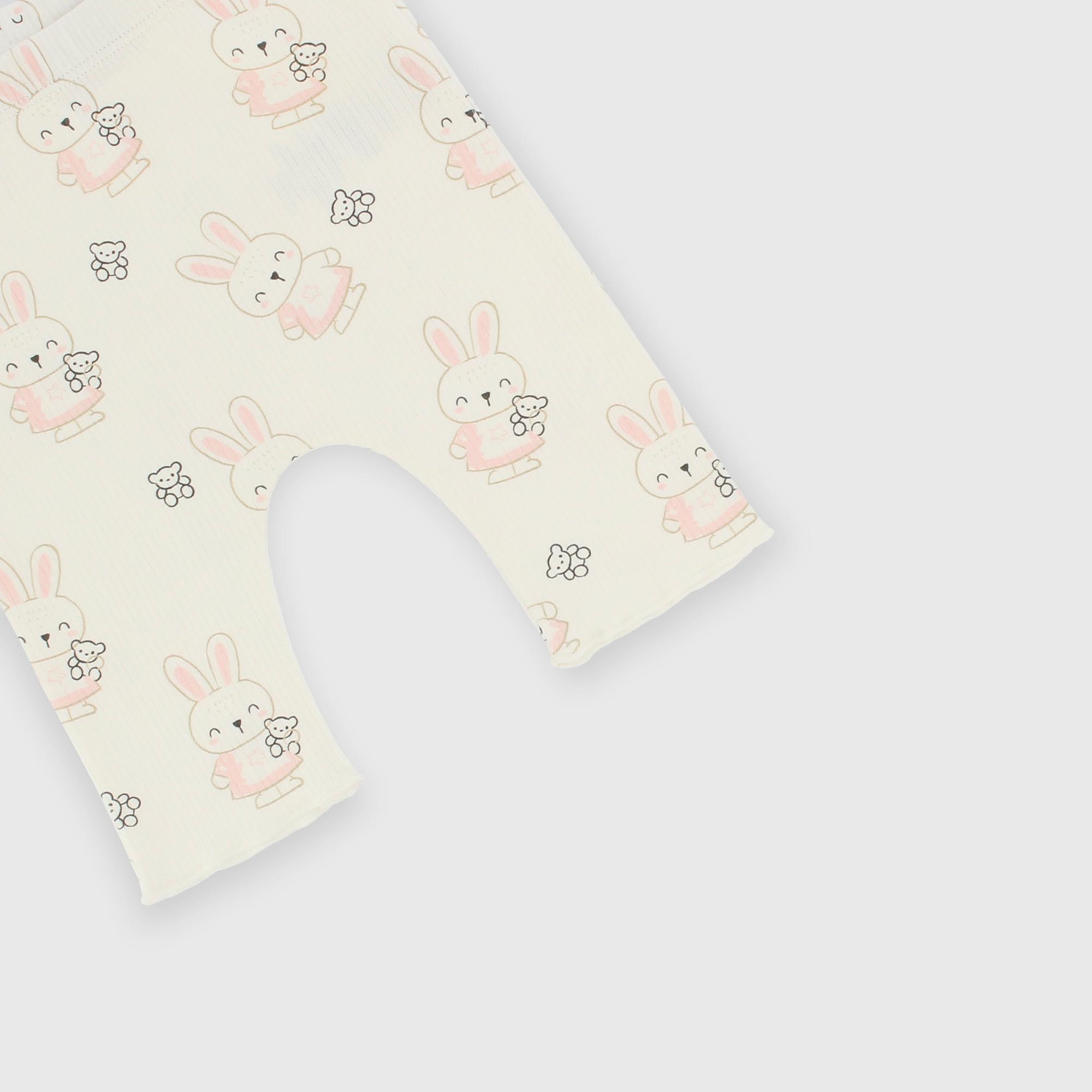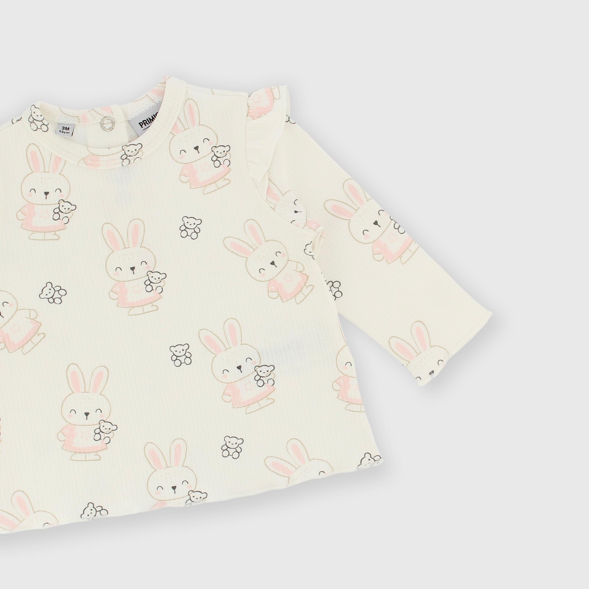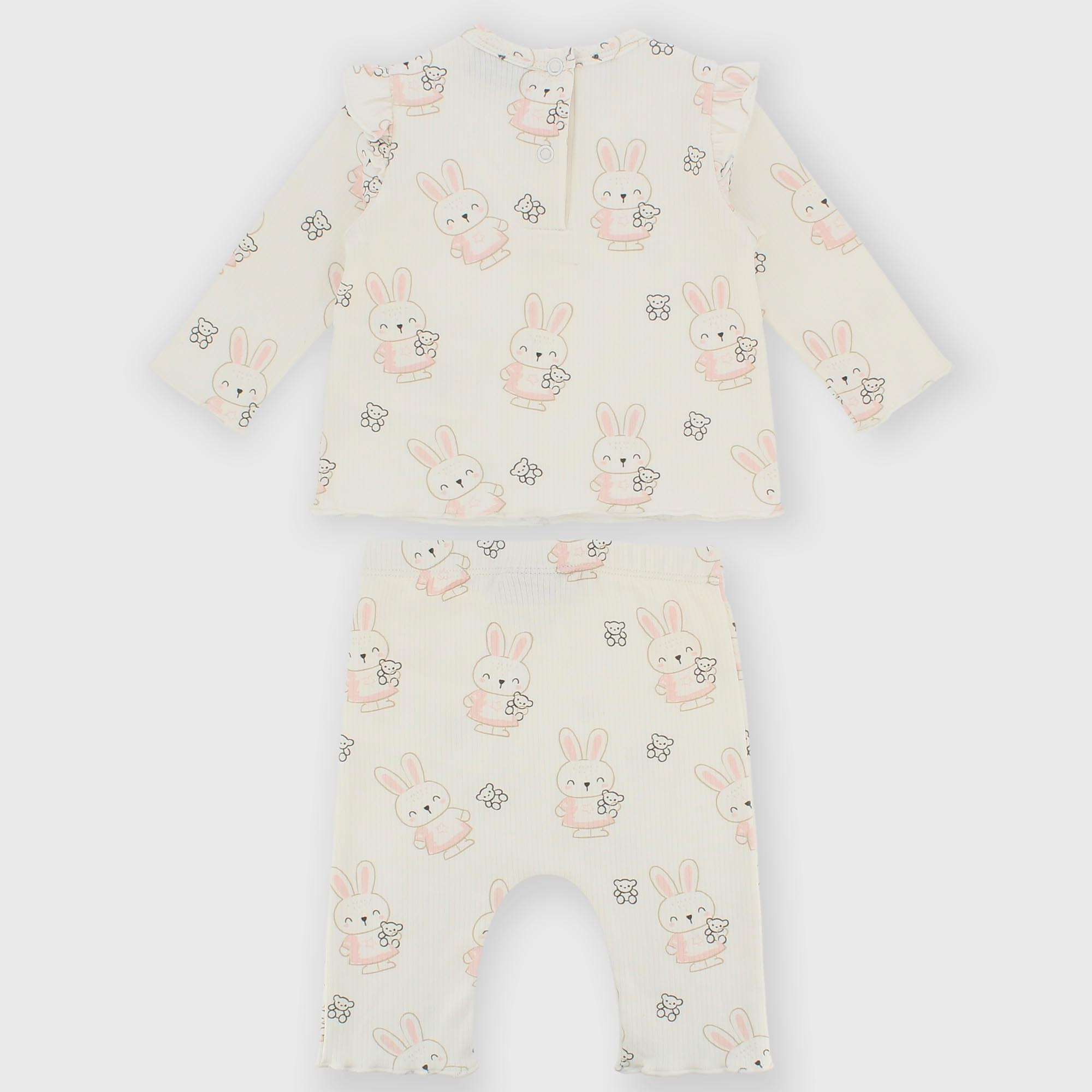 Complete in ribbed fabric made of two pieces, all-over print with bunnies and teddy bears. T-shirt, crew neck, with long sleeves. Snap button closure at the back. Ruffles on the shoulders. Leggings with elasticized waist. Doll stitch finishing.