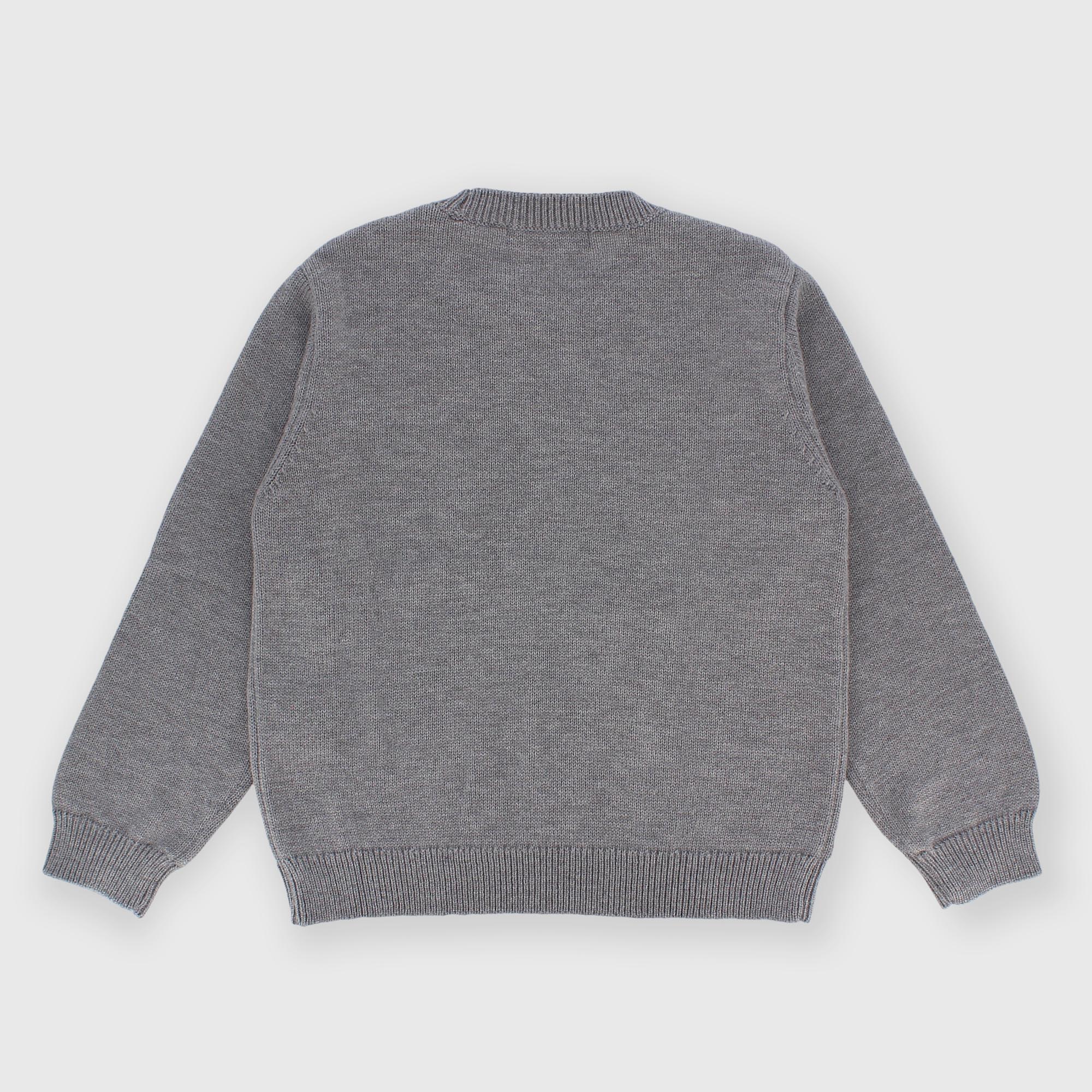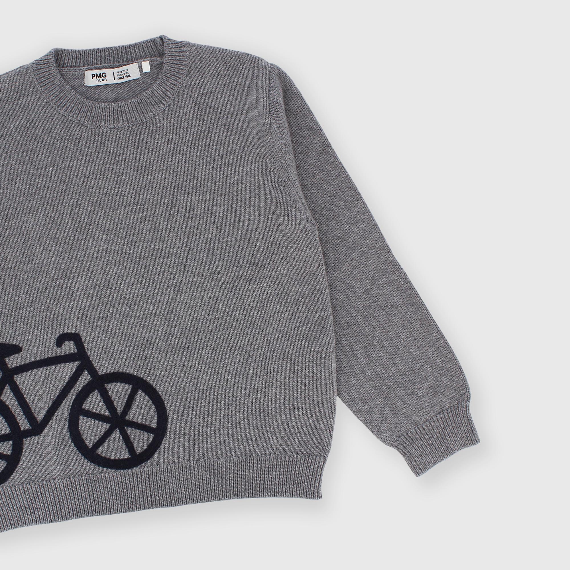 Soft knit pullover, crew neck, long sleeves. Embroidery in the shape of a bicycle on the front.