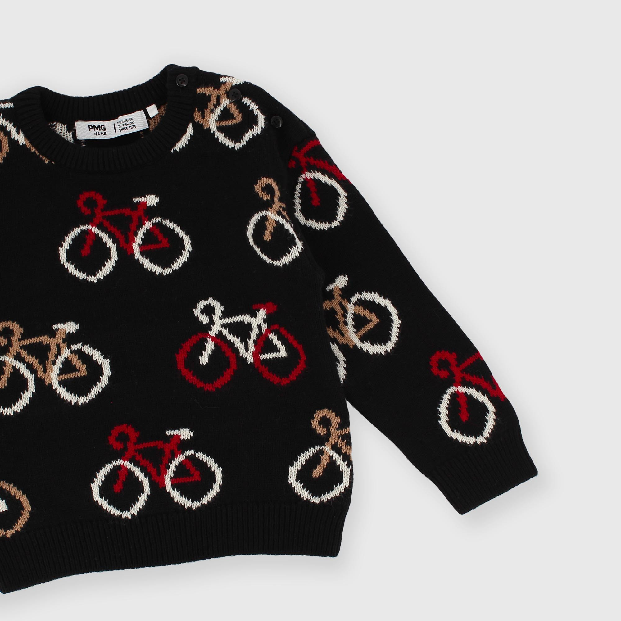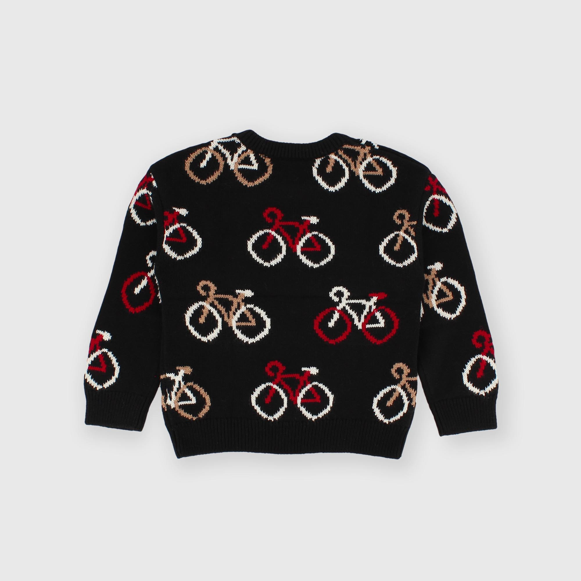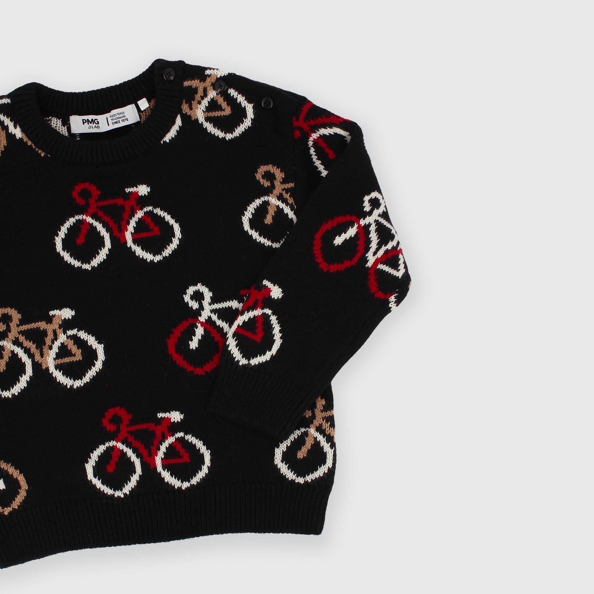 Soft knit sweater, crew neck, long sleeves. Button closure on the shoulder. Bicycle motif.