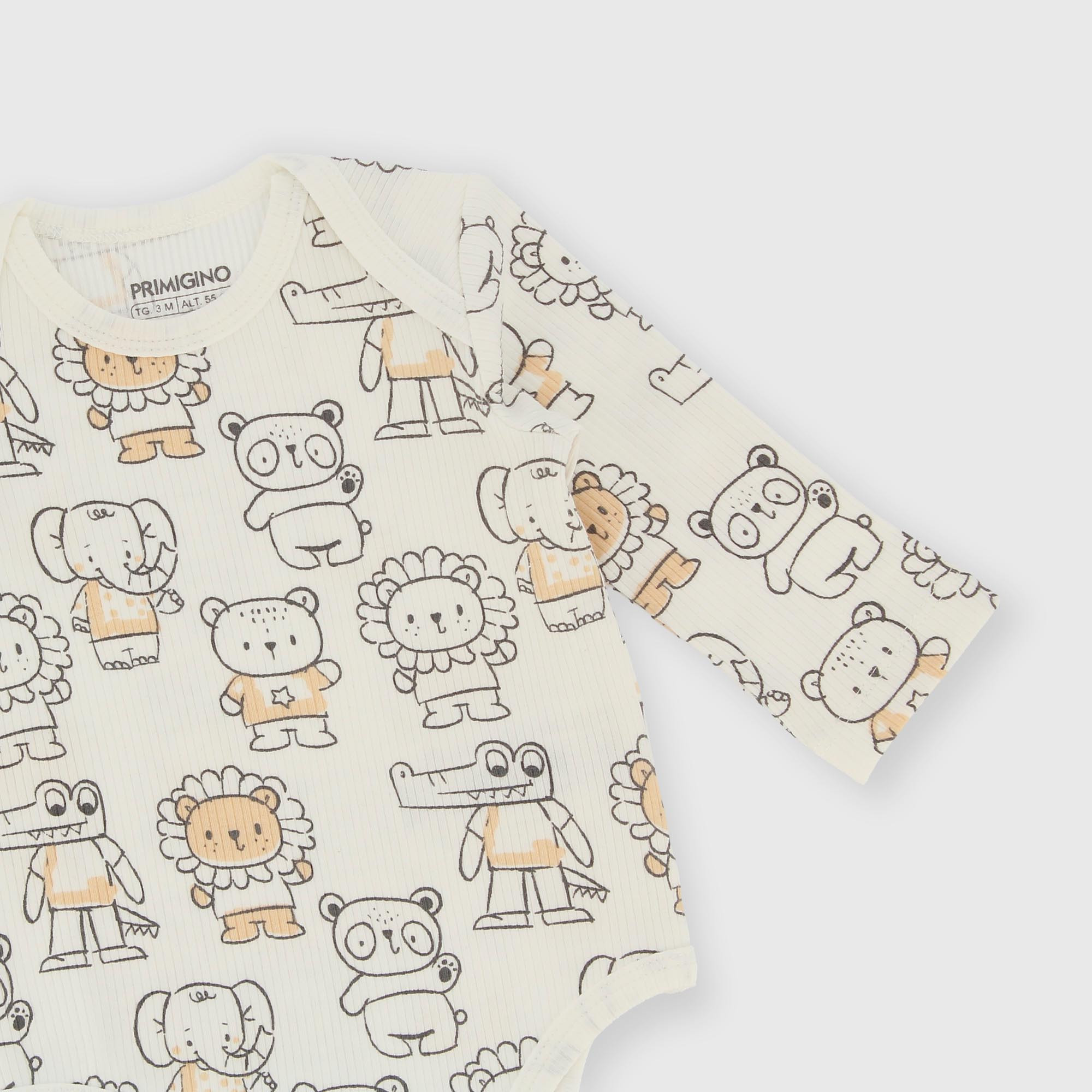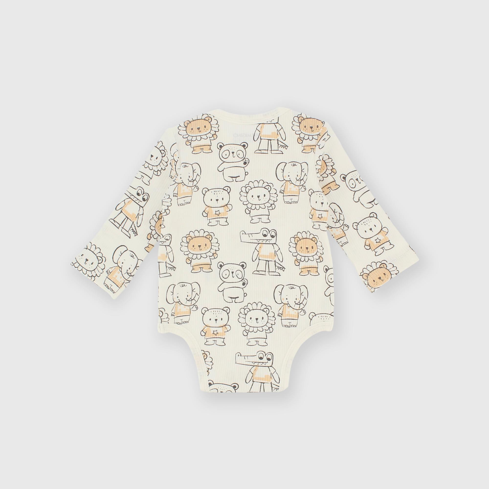 Body in warm coton with a round neck and long sleeves. Snap button closure at the bottom. All-over animal print.