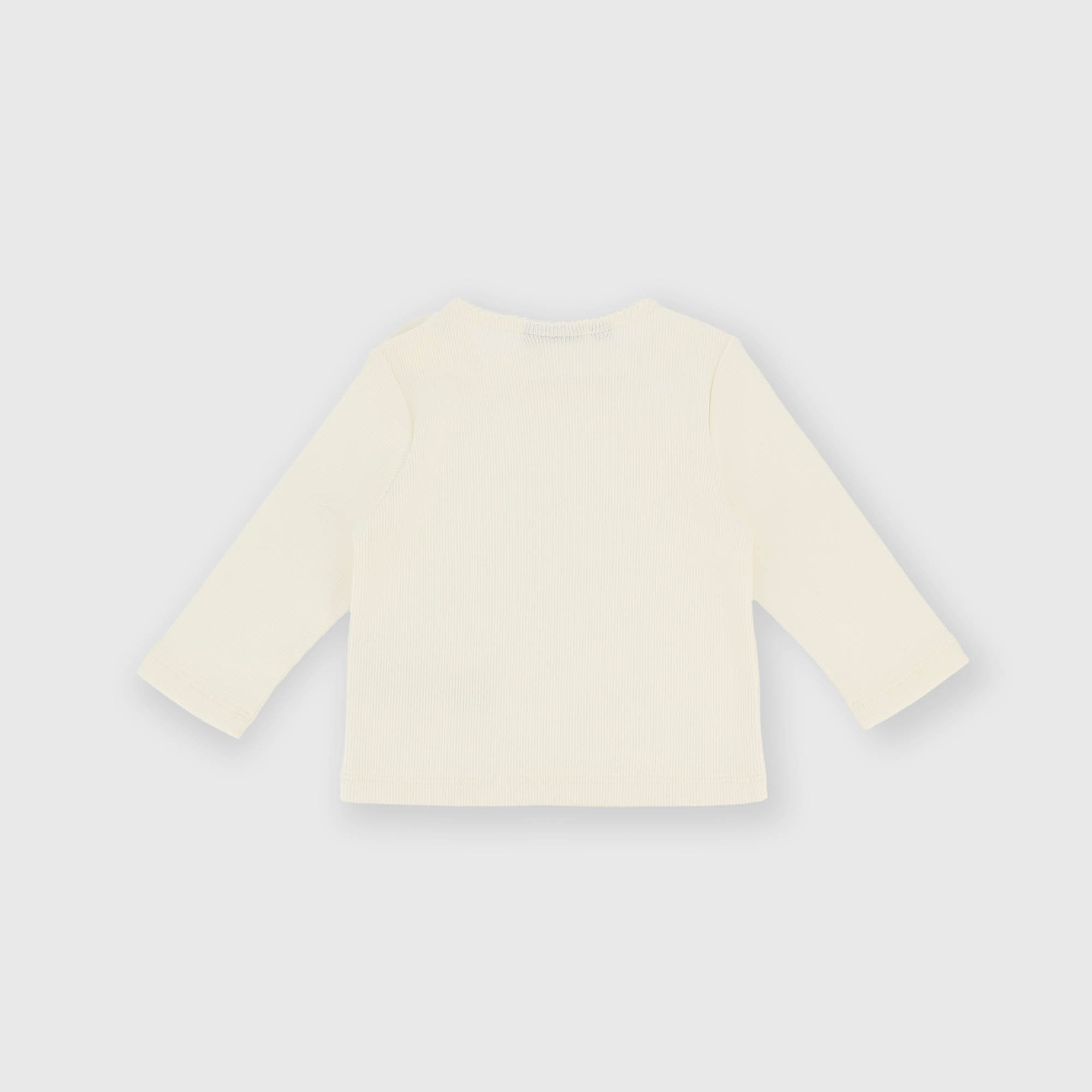 Ribbed T-shirt, crew neck, long sleeves. Closure with snap buttons on the back. Ruffles inserted at the neckline. Finishings with doll stitch.