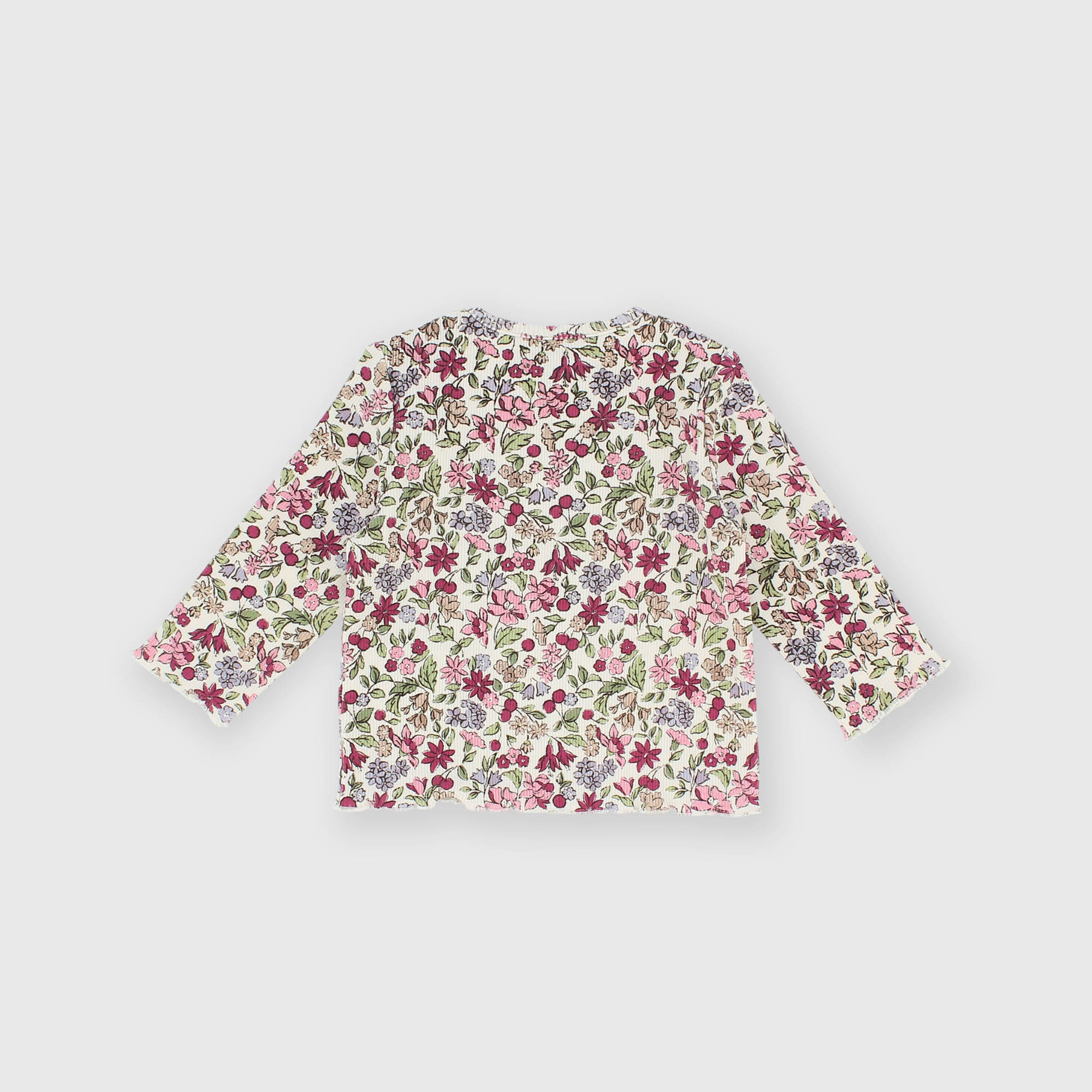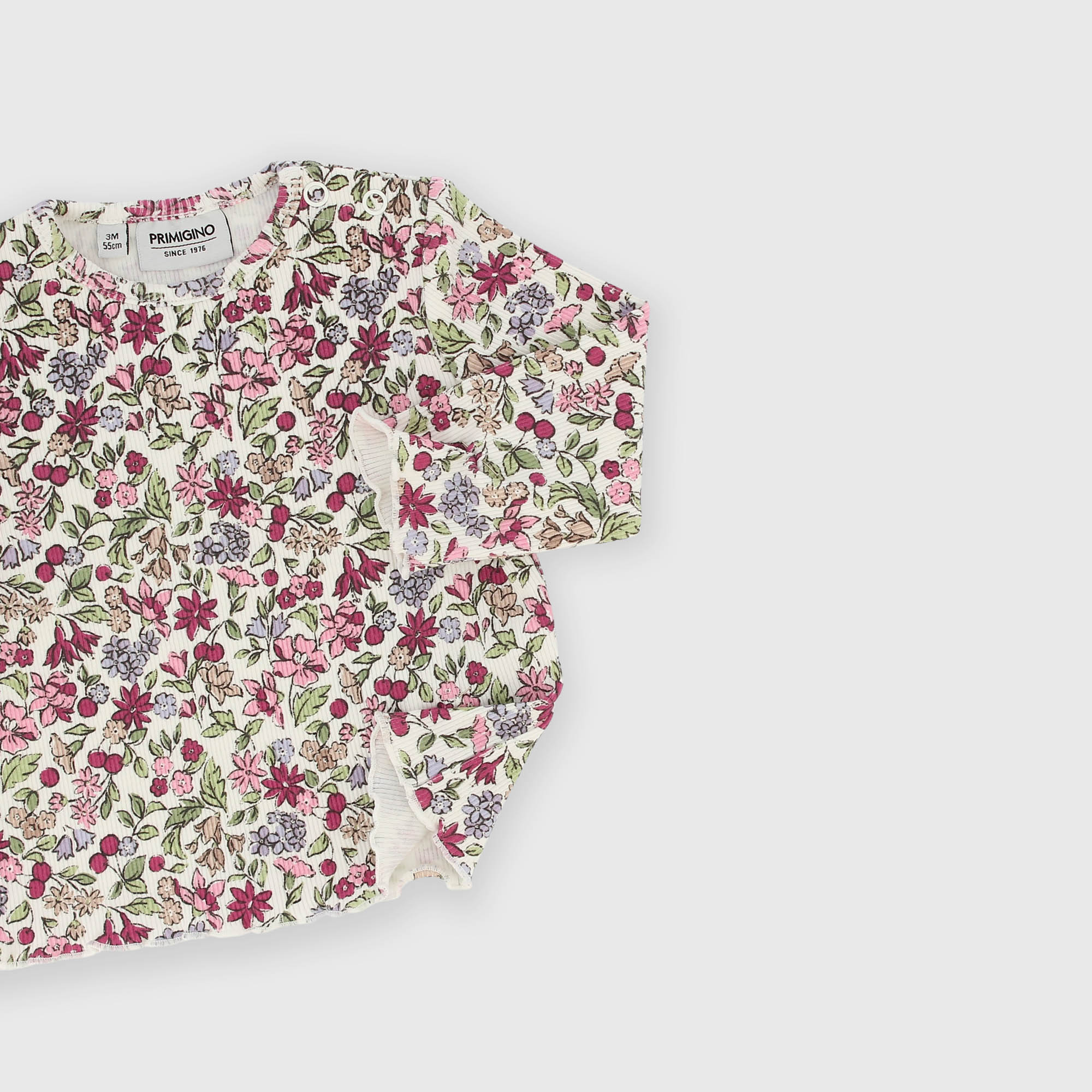 Ribbed t-shirt, crew neck, long sleeves. Closure with snap buttons on the back. All-over animal print. Finished with doll stitch.