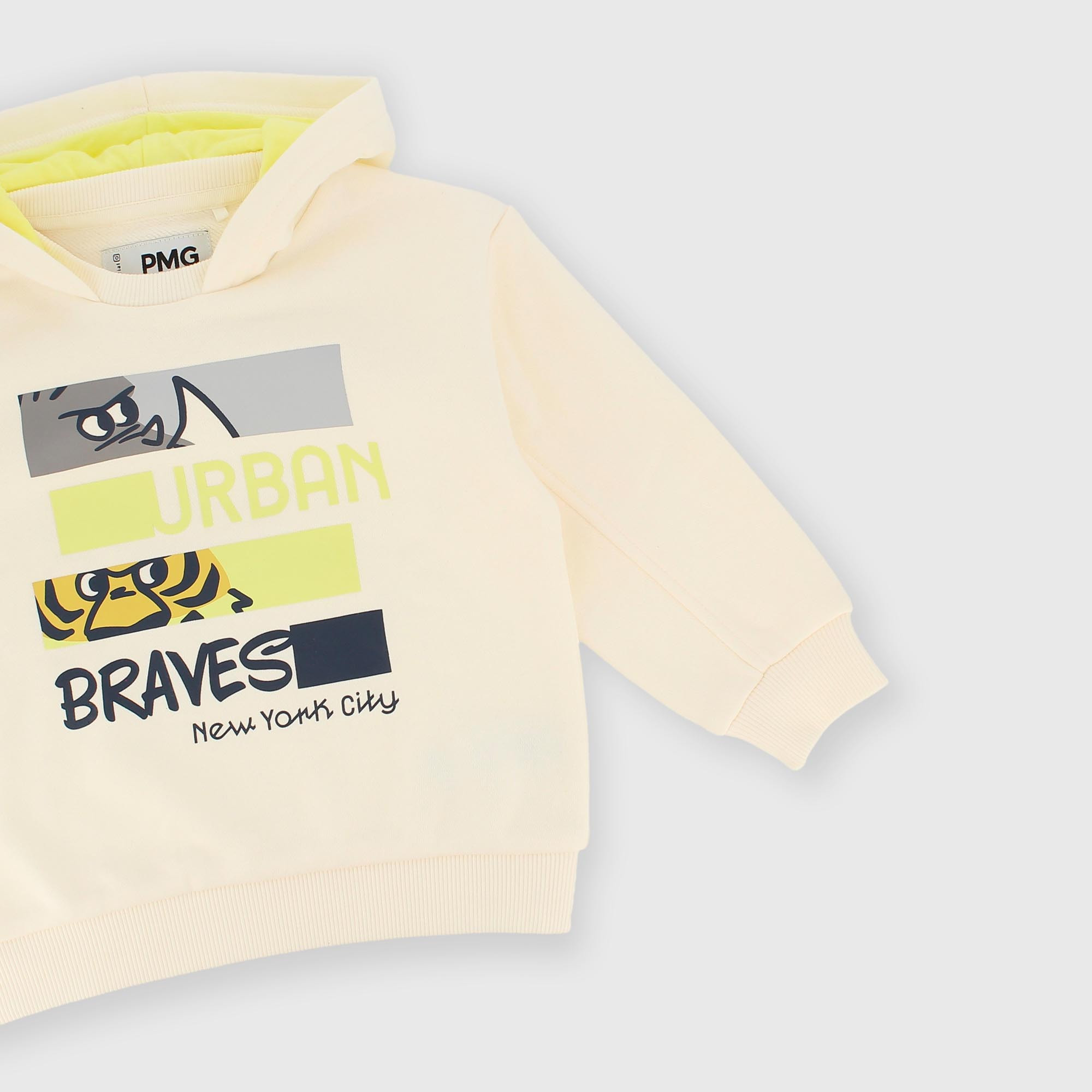Hooded sweatshirt with long sleeves. Print on the front. Ribbed neckline, cuffs, and bottom.