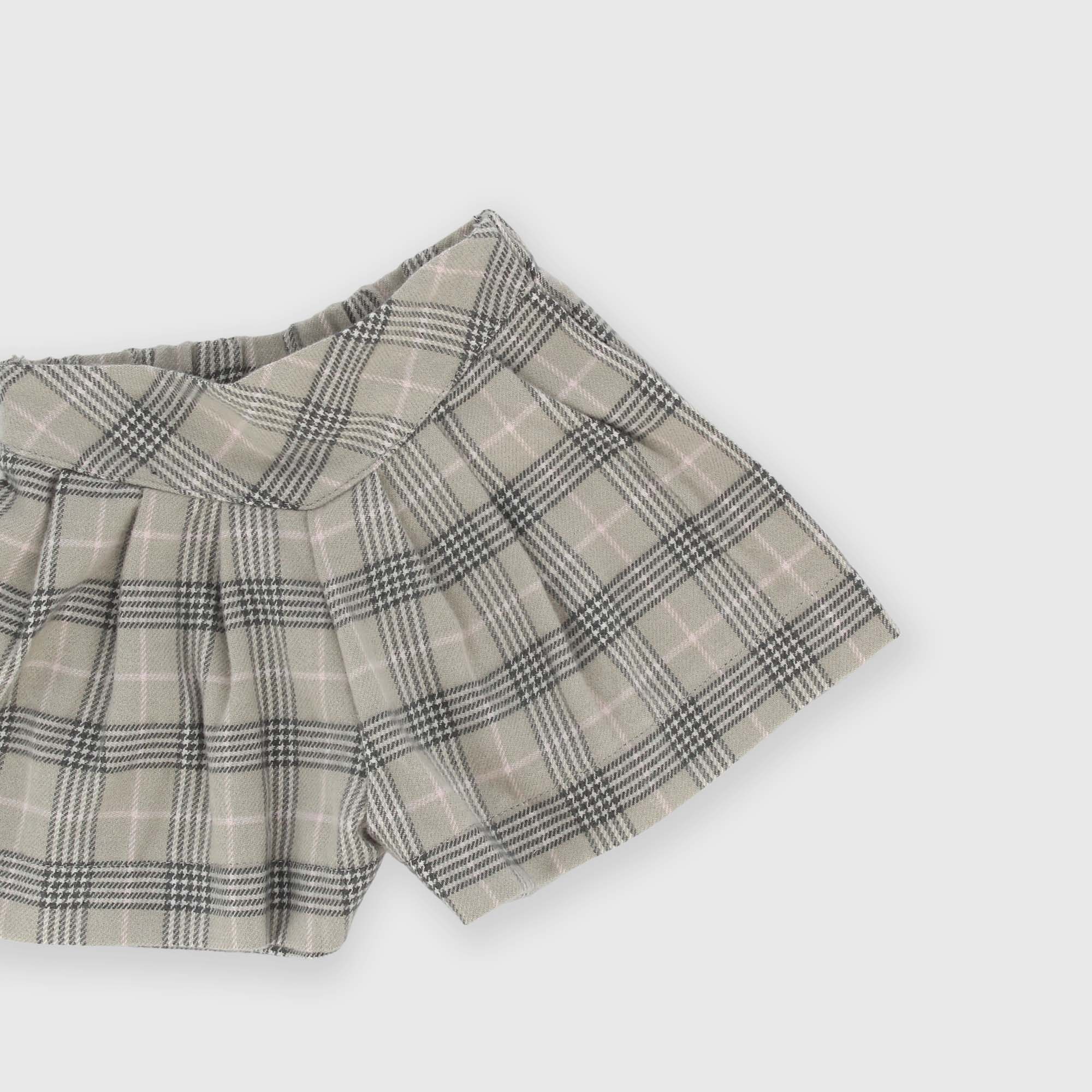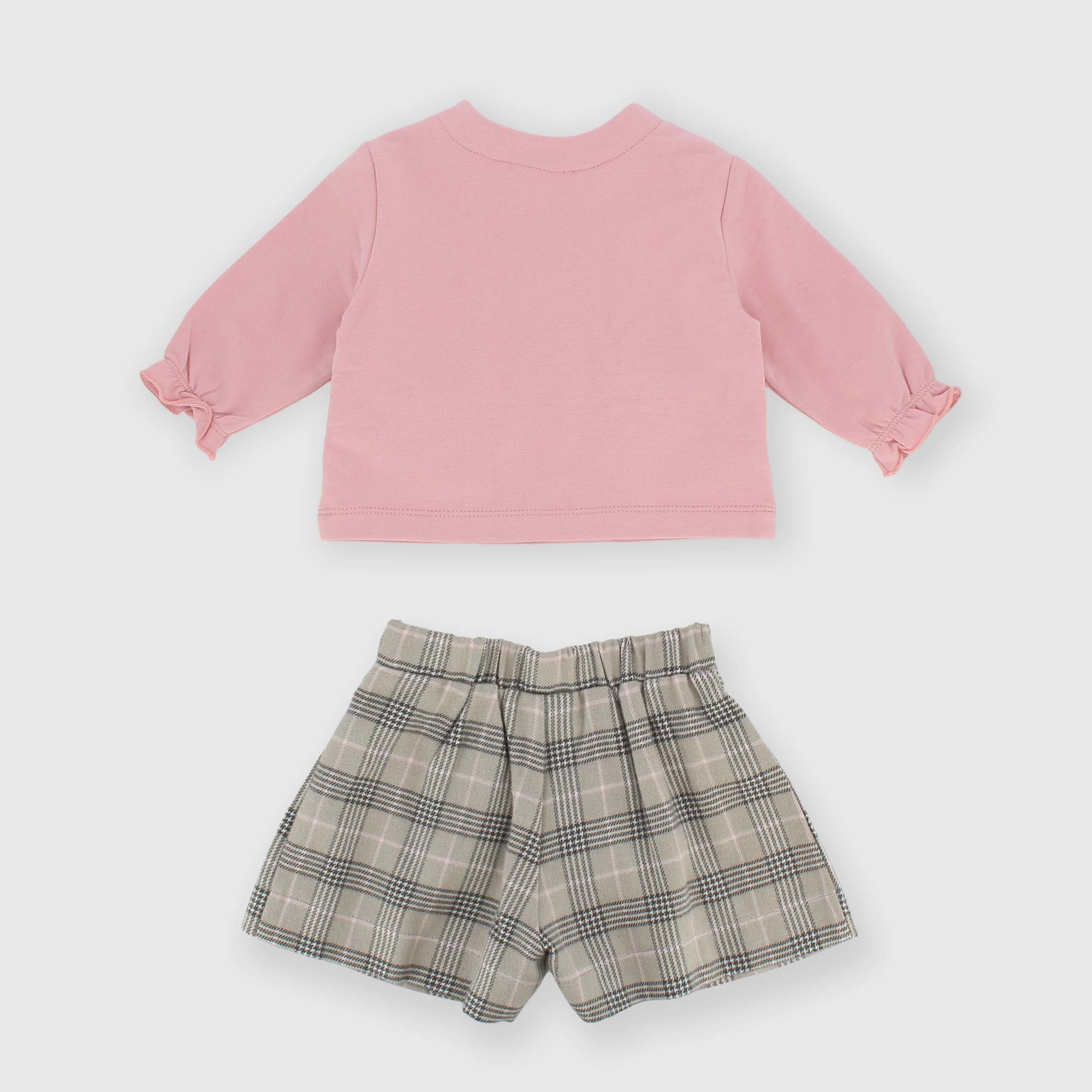 Set made of two pieces. Sweatshirt with soft brushed interior, round neck, long sleeves. Closure with snap buttons on the shoulder. Patch pockets with applied bows. Checked shorts with an elastic waistband.