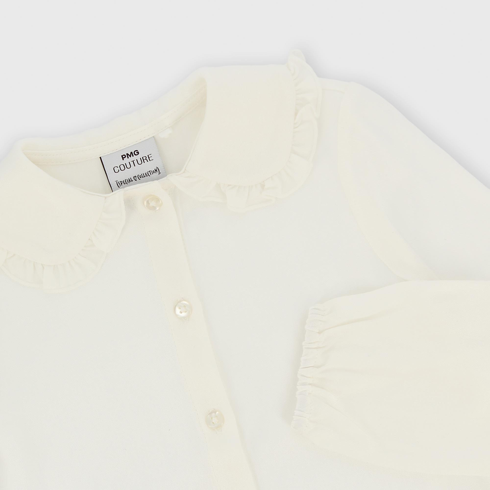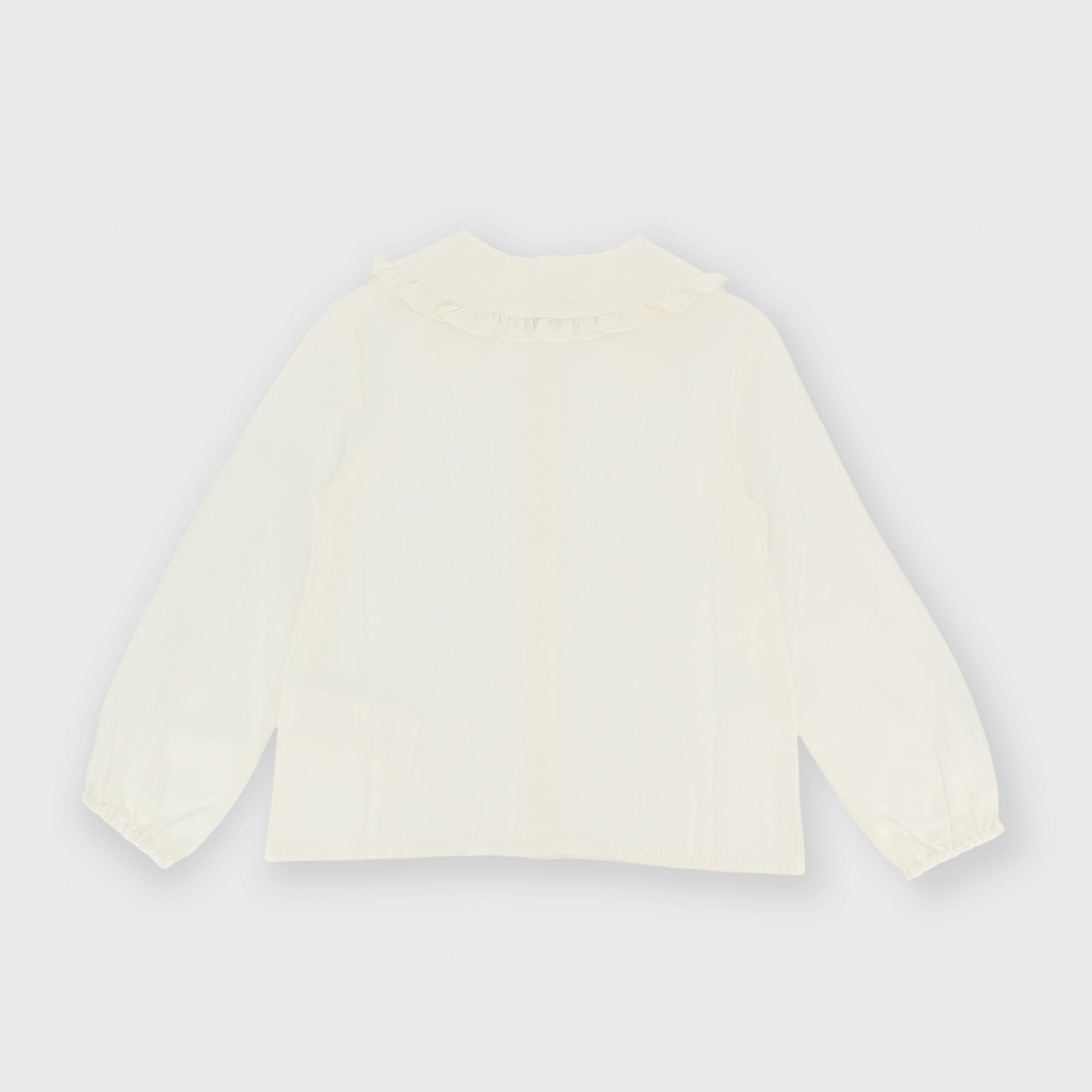 Long-sleeved poplin shirt. Button closure at the front. Wide collar with ruffles on the edge. Elasticated cuffs.