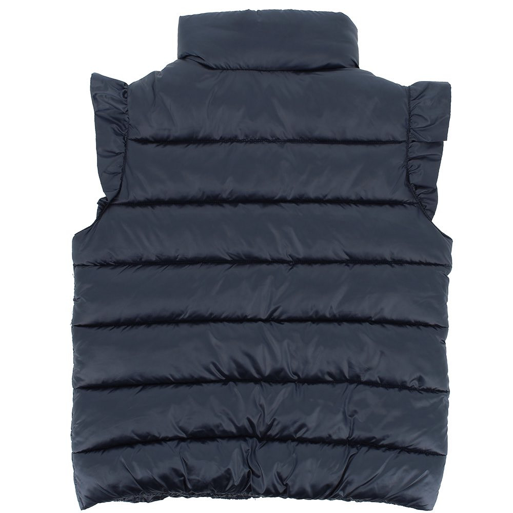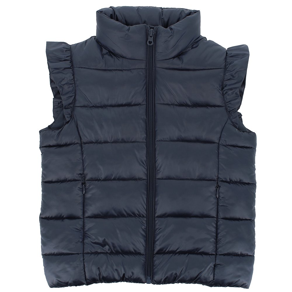 Chaleco de nylon, cuello alto. Cierre frontal de cremallera. Bolsillos de cremallera en la parte delantera. Hombros con volantes.