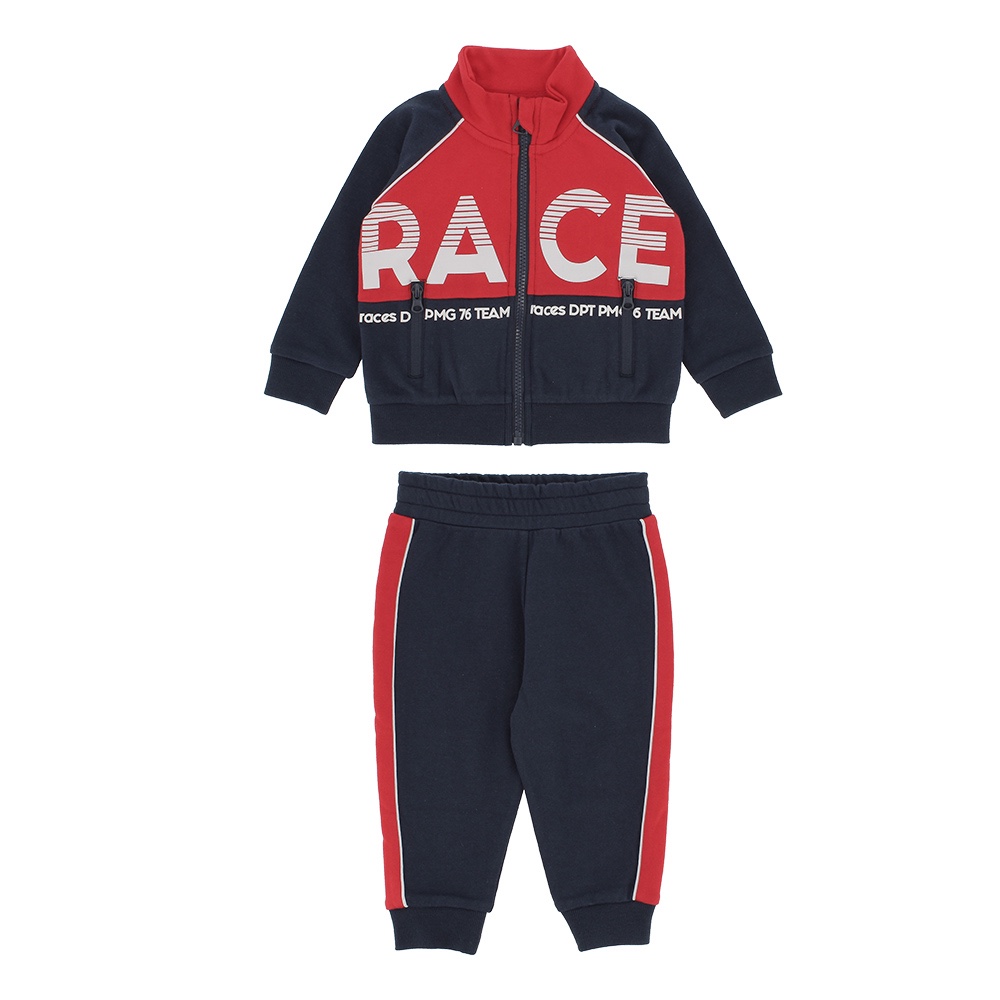 Chándal de dos piezas. Sudadera abierta con capucha, mangas largas. Cierre de cremallera frontal. Escritas en relieve y bolsillos laterales de cremallera. Pantalón de tejido sudadera con cintura elástica y bandas laterales en contraste.