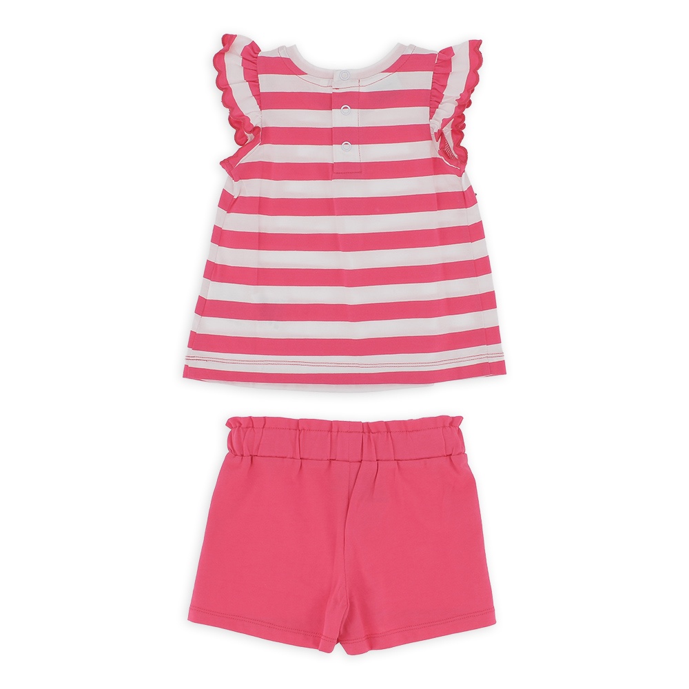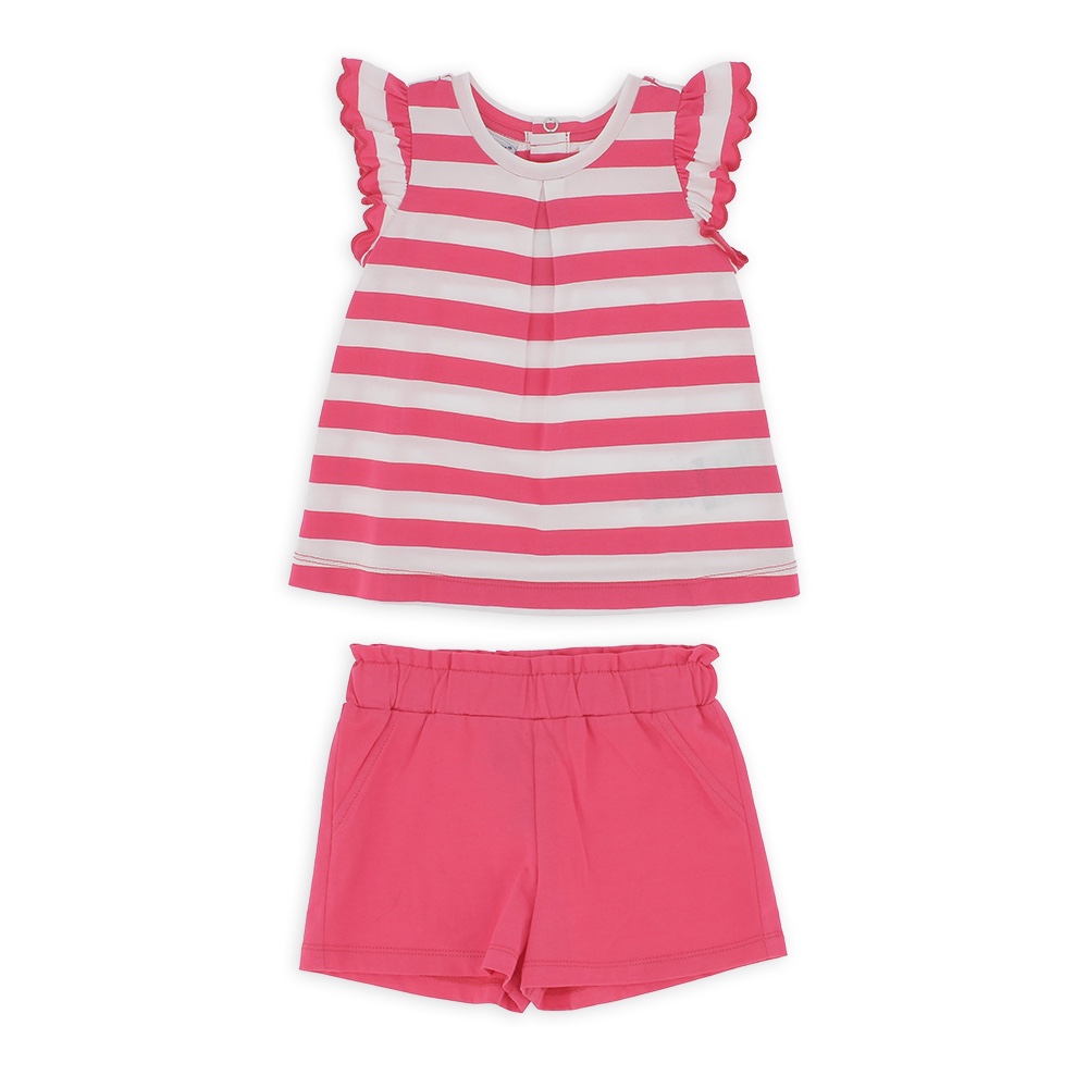 Conjunto de dos piezas. Camiseta de tejido jersey de cuello redondo, mangas cortas con borde elaborado. Cierre posterior con botnes de presión. Pantalones cortos de tejido jersey con cintura elástica.