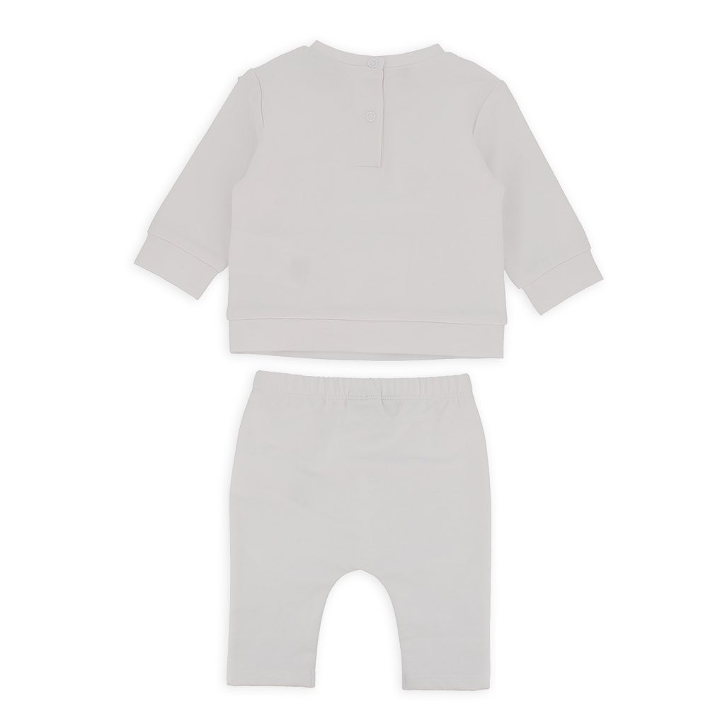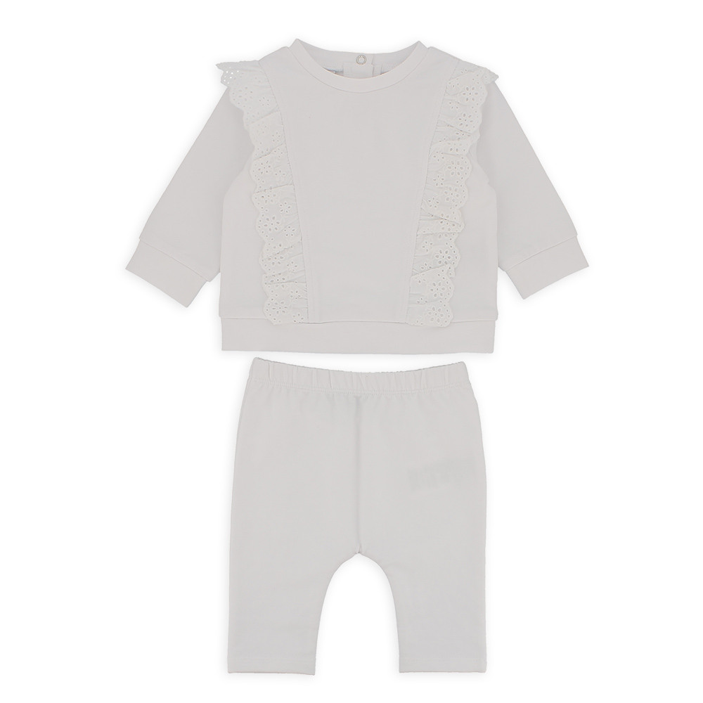 Conjunto de dos piezas. Sudadera de cuello redondo, de mangas largas. Cierre posterior de botones de presión. Adornos de volantes de encaje Sankt Gallen en la parte delantera. Pantalón de tejido sudadera con cintura elástica.