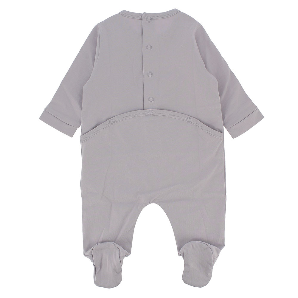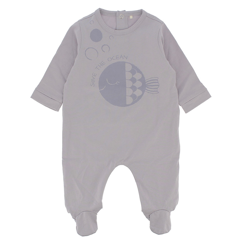 Mono de tejido jersey con cuello redondo y mangas largas. Cierre posterior de botones de presión. Pez estampado en la parte delantera. Esta prenda es eco-sostenible porque está fabricada con algodón 100% natural.