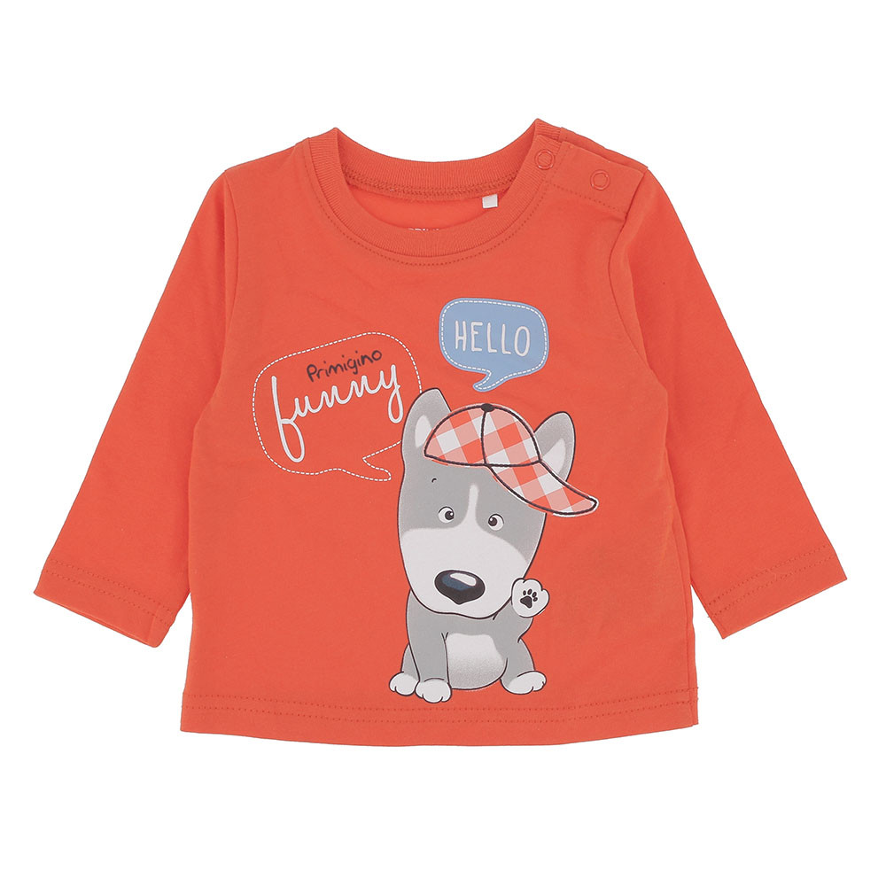 Camiseta de tejido jersey, cuello redondo, mangas largas. Cierre de botones de presión en el hombro. Parte delantera estampada.