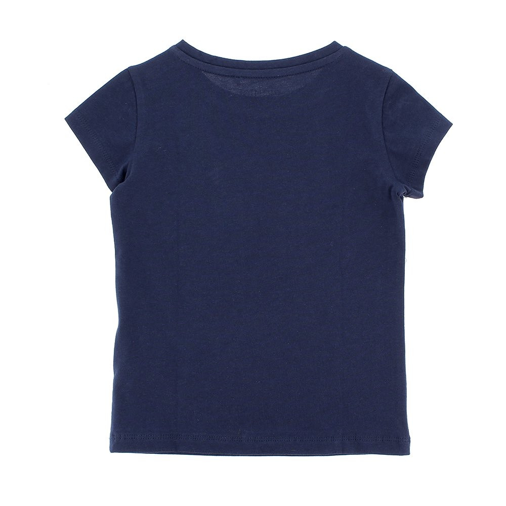 Camiseta de tejido jersey, cuello redondo, mangas cortas. Parte delantera con escritas impresas y adornos brillantes.