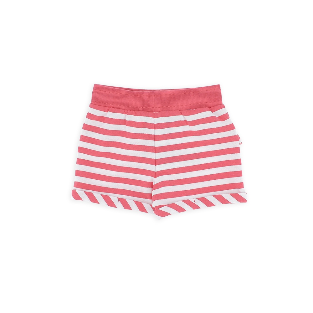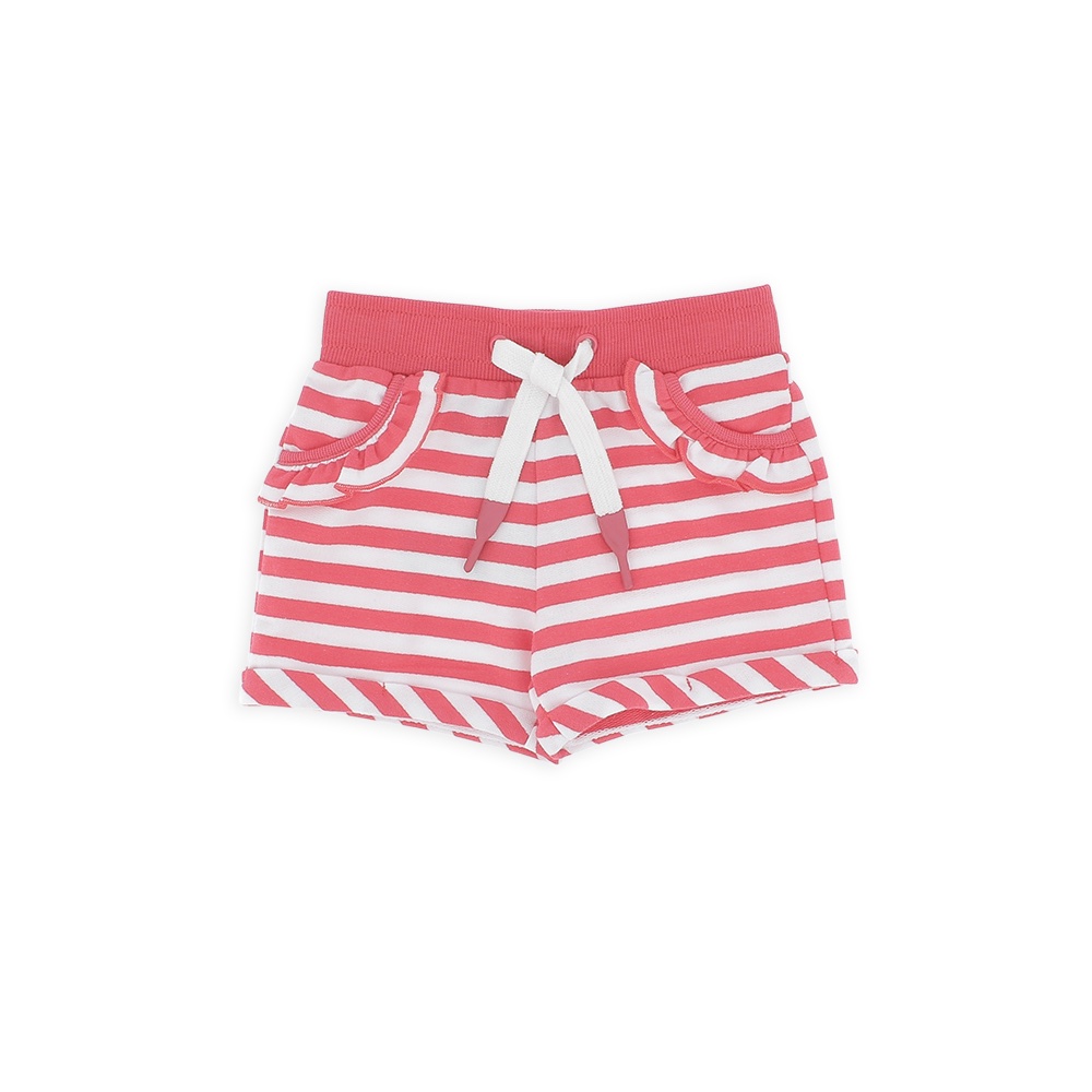 Bermuda de tejido sudadera ligero de rayas con cintura elástica y cordones forntales. Bolsillos con pequeños volantes y parte inferior con solapa.