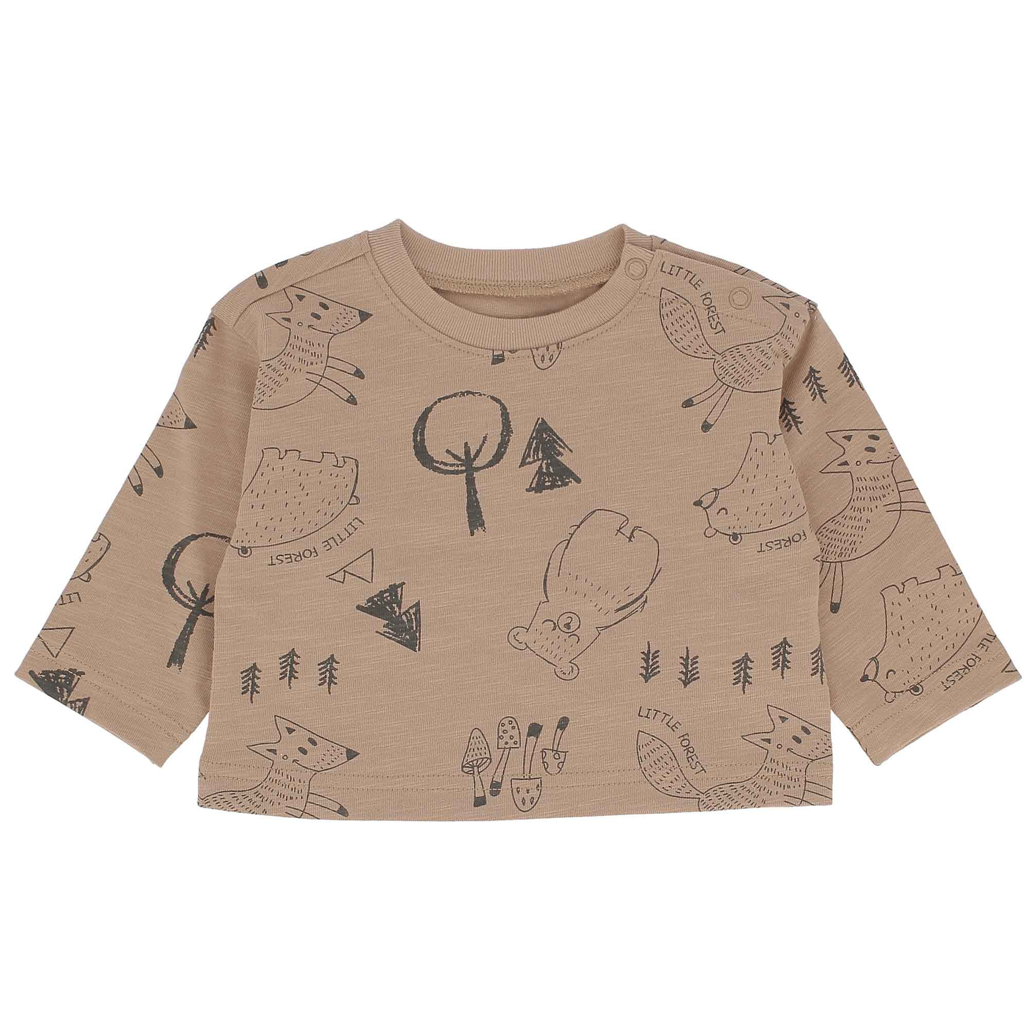 Camiseta de tejido jersey, cuello redondo, mangas largas. Cierre con botones automáticos en el hombro. Estampada all over. Esta prenda es sostenible porque realizada principalmente con algodón 100% natural.