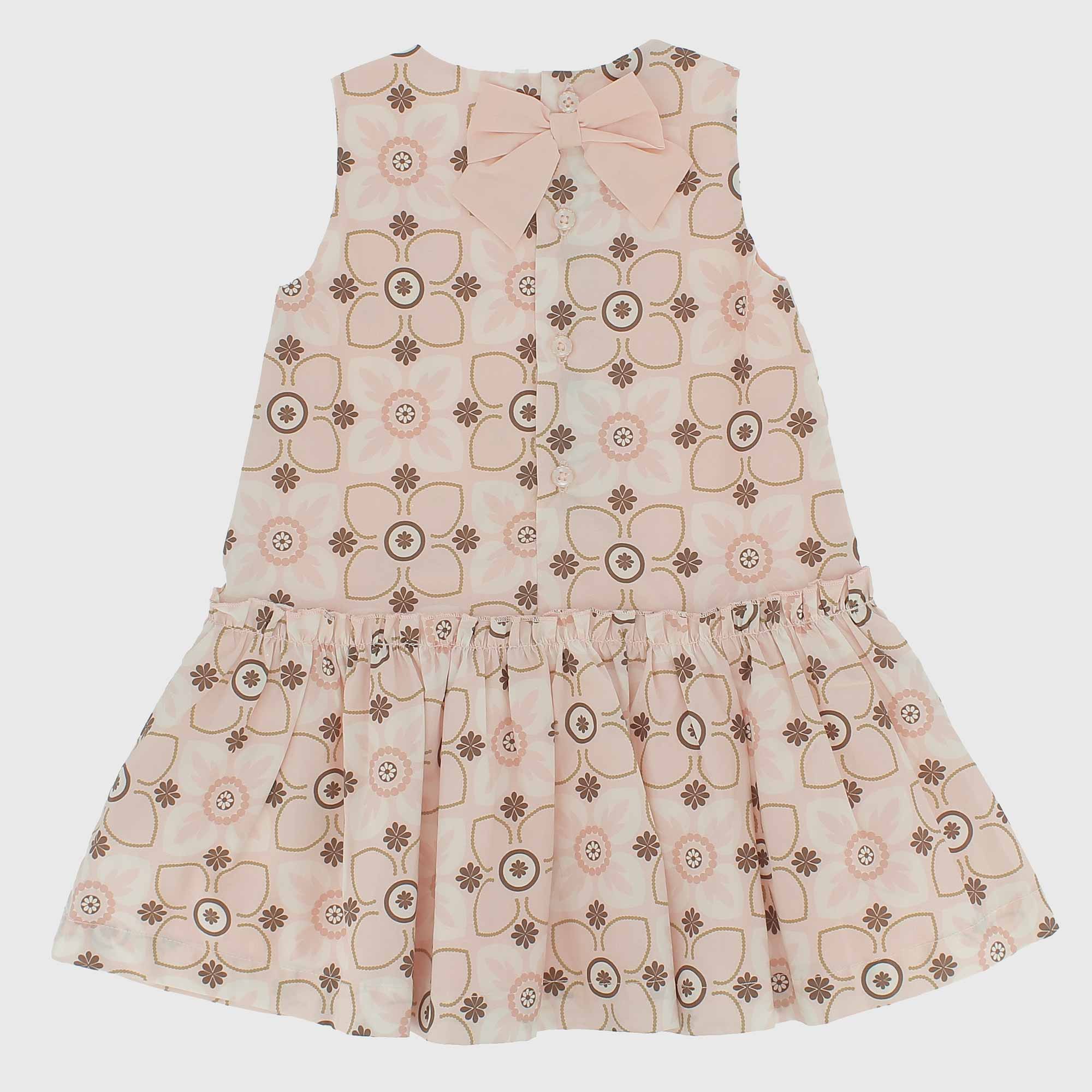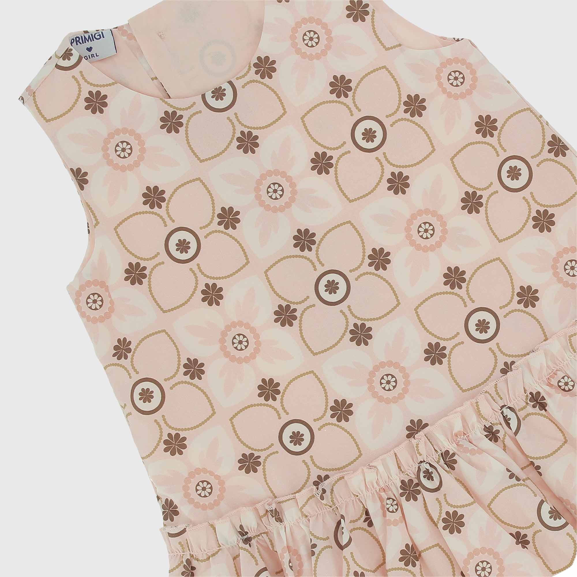 Vestido de algodón estampado con volante, cuello redondo, sin mangas. Cierre con botón en la parte trasera. Adorno de lazo en la parte trasera. Parte interior forrada.