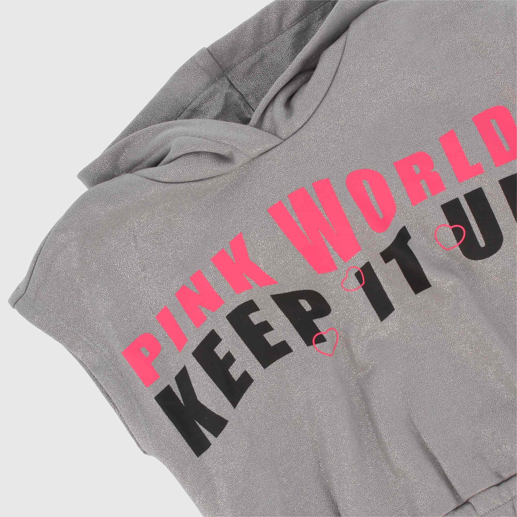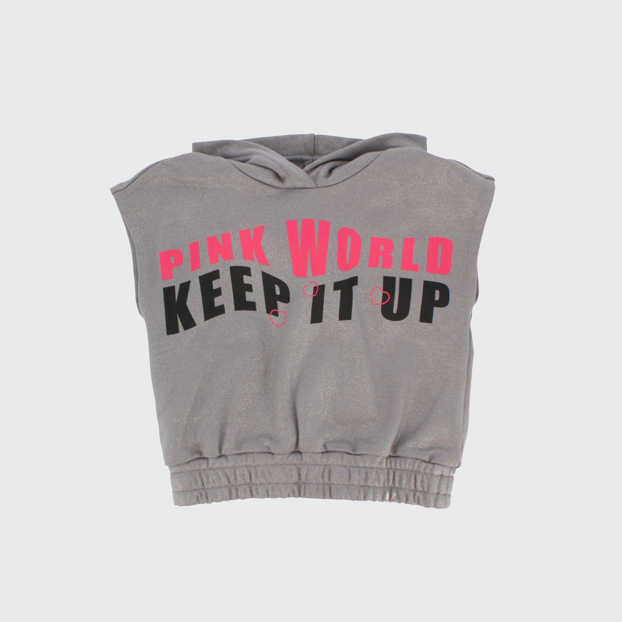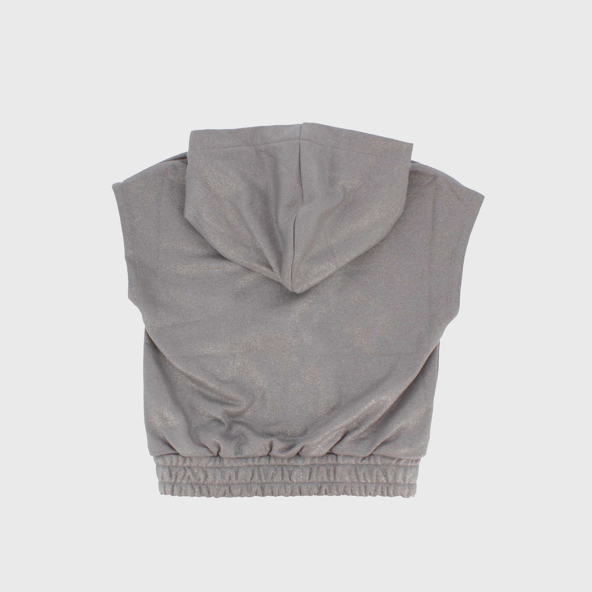 Chaleco de tejido tipo sudadera recubierto efecto lurex con capucha. Parte delantera con ecritas impresas y parte inferior elástica.