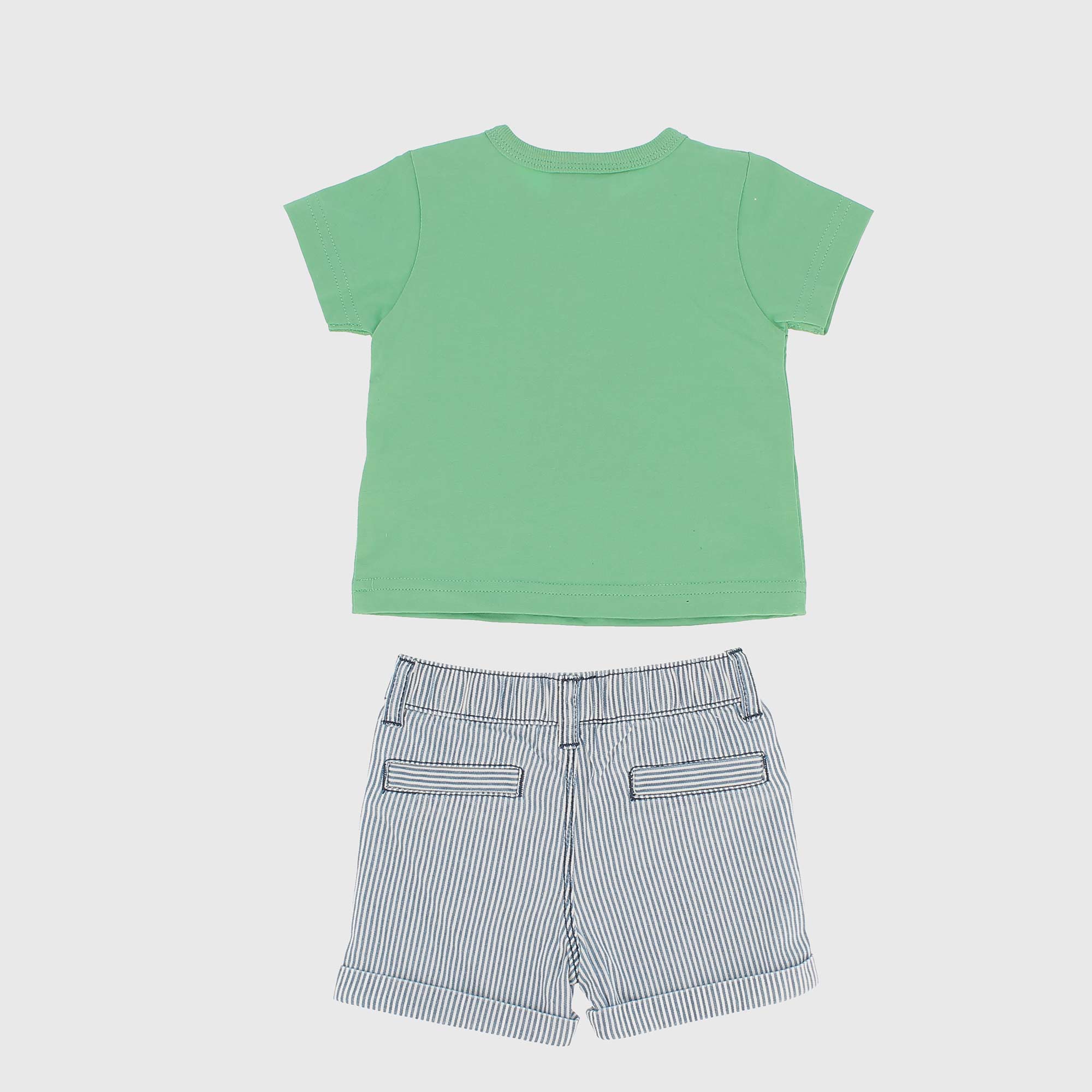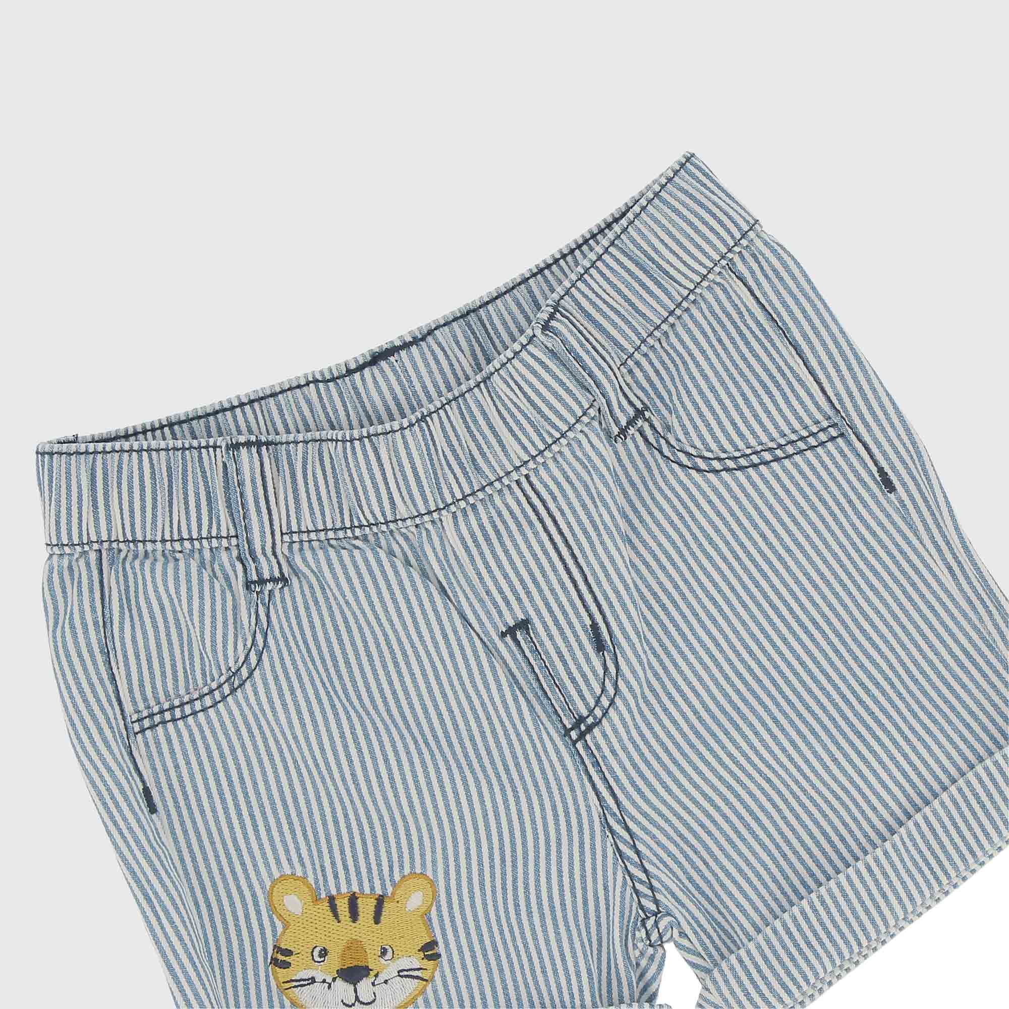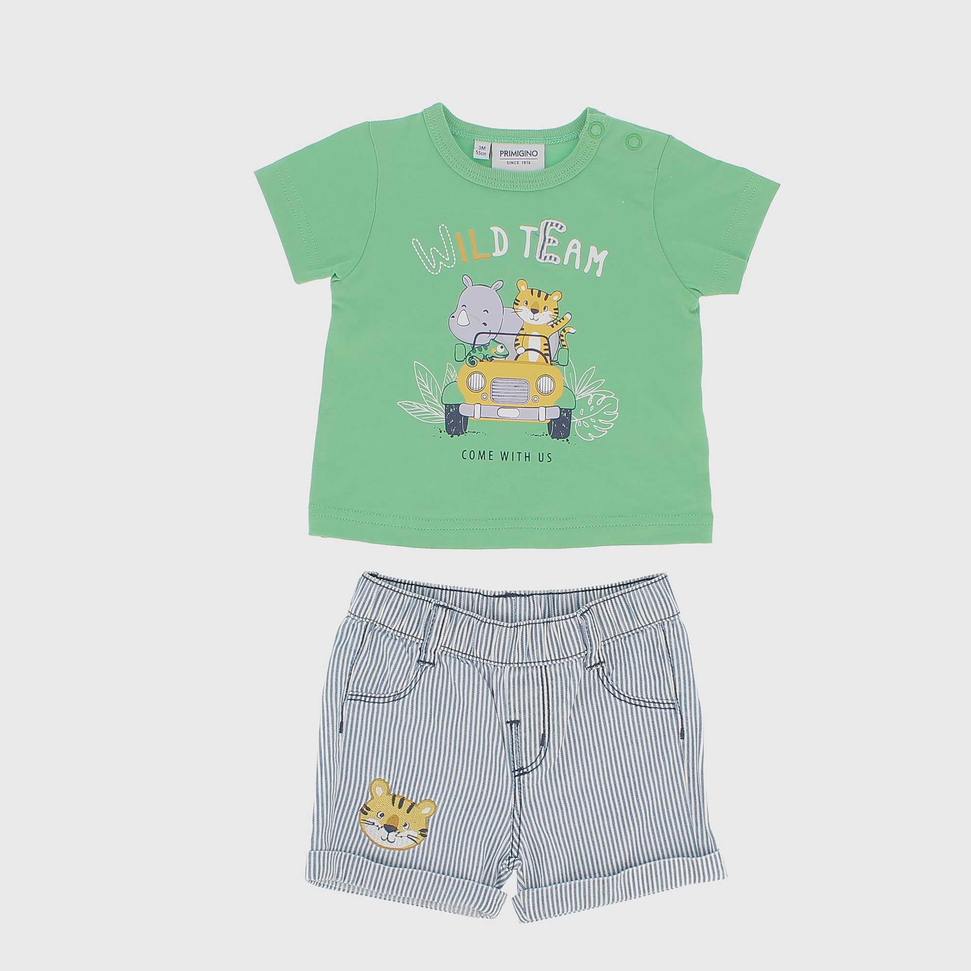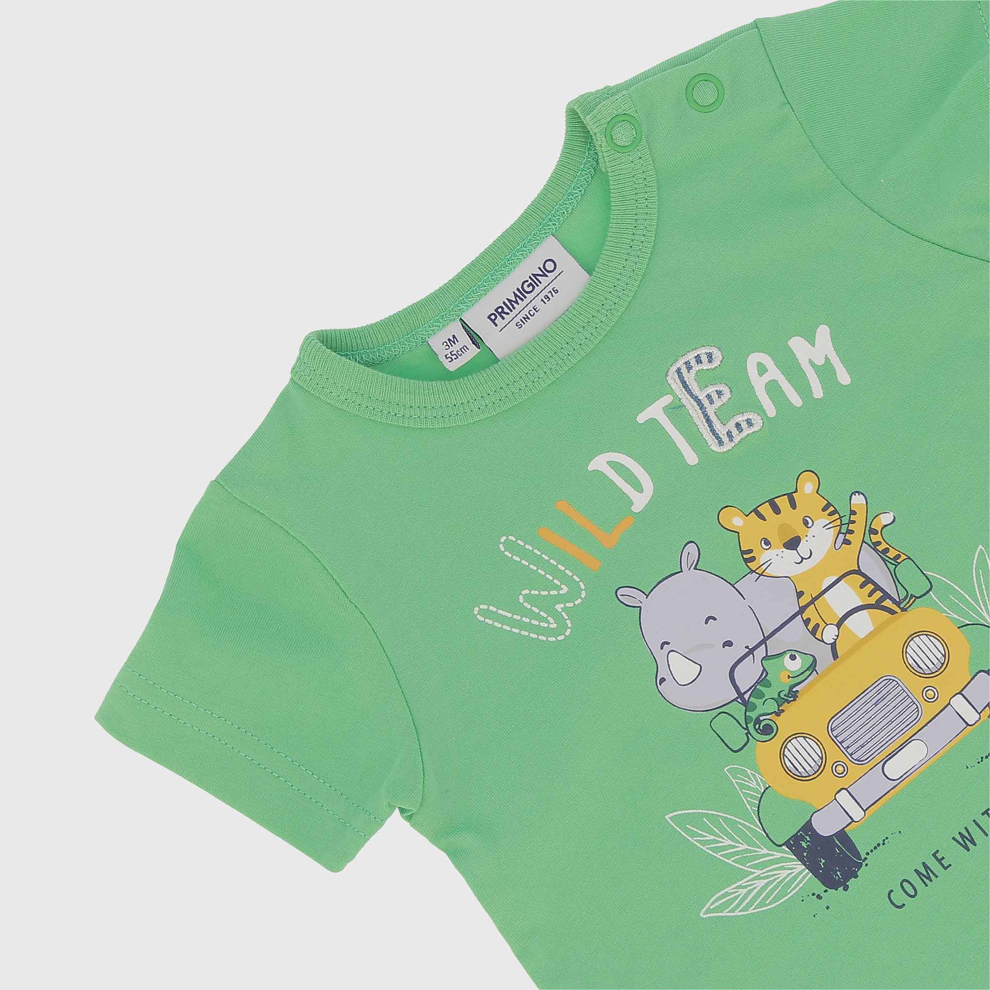 Conjunto de dos piezas. Camiseta de tejido tipo jersey de cuello redondo, de mangas cortas. Cierre con botones automáticos en el hombro. Tema jungla estampado en la parte delantera. Pantalón vaquero elástico de rayas con patch de cachorro de tigre.