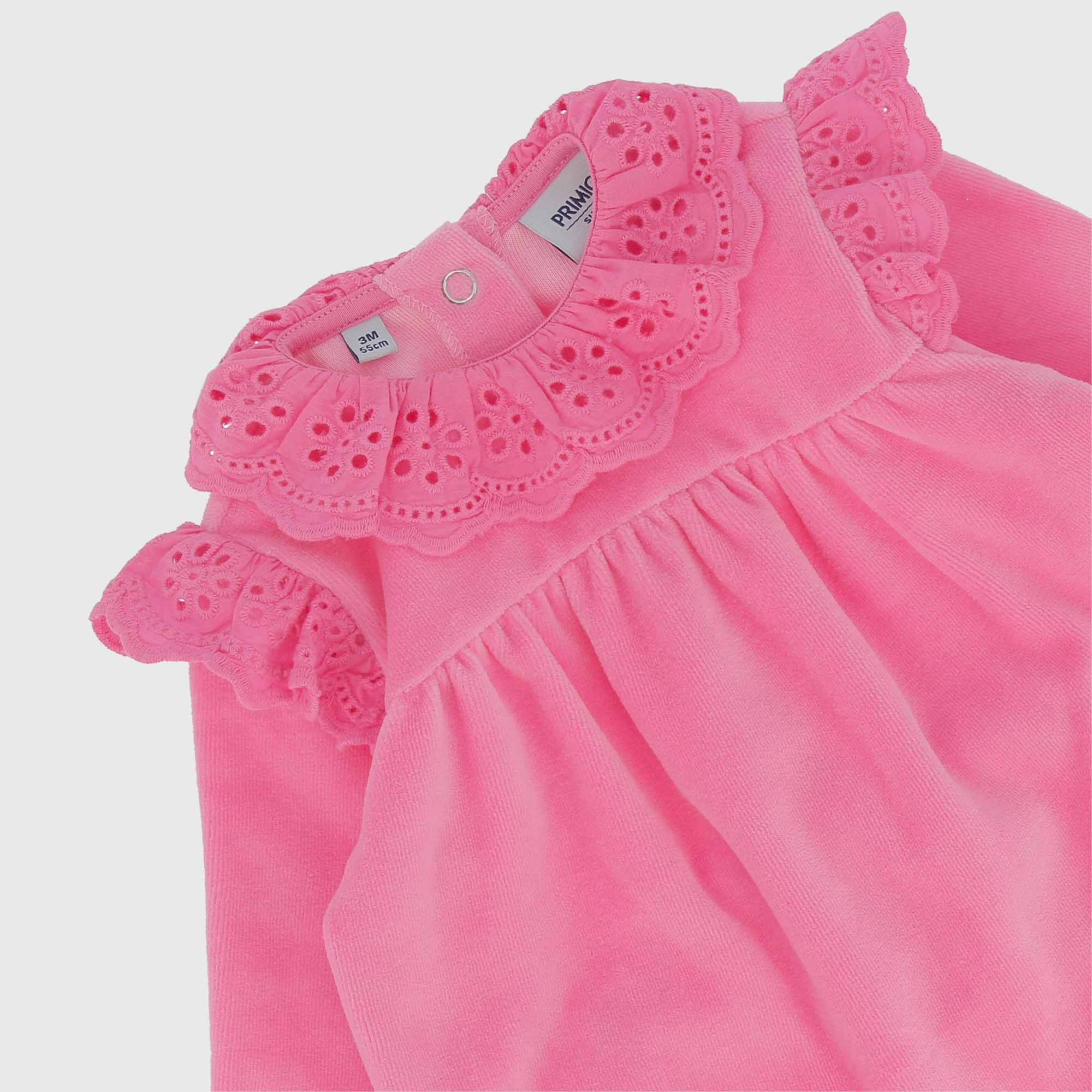 Mono de felpilla con cuello de encaje de Sankt Gallen, mangas lagas. Cierre con botones en la parte trasera. Volantes de encaje de Sankt Gallen en los hombros.