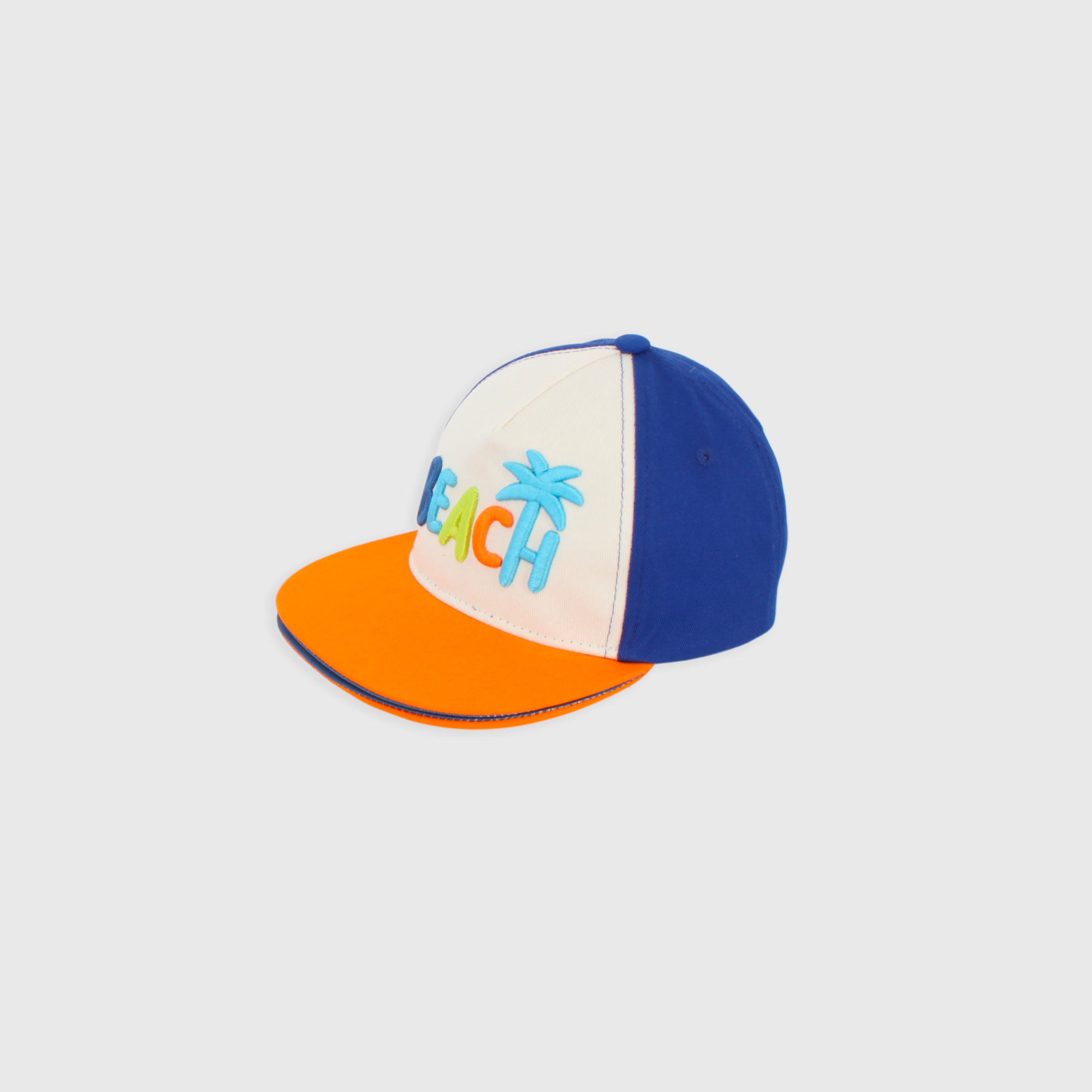 Gorro baseball de algodón con escrita bordada Beach. Elástico en la parte trasera.