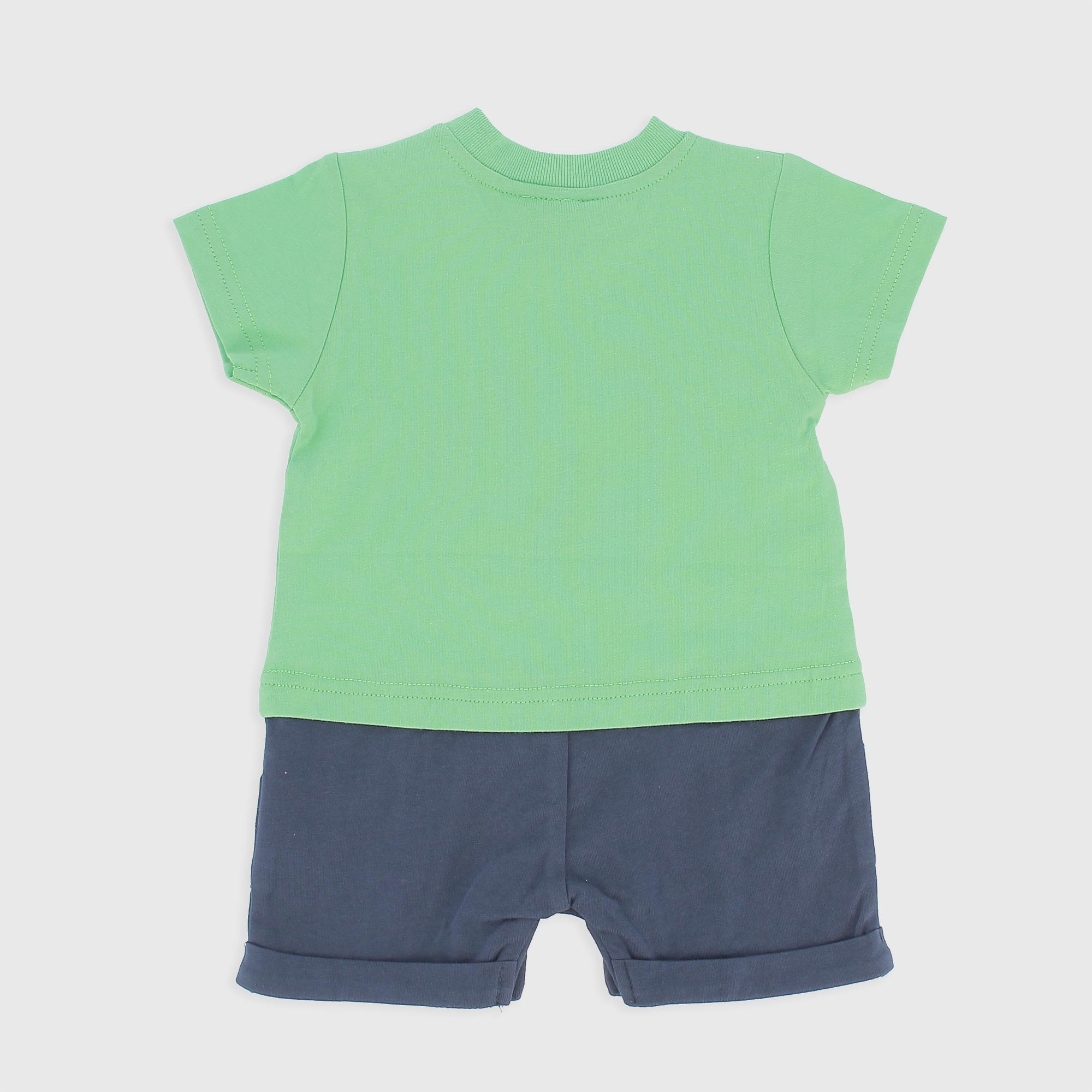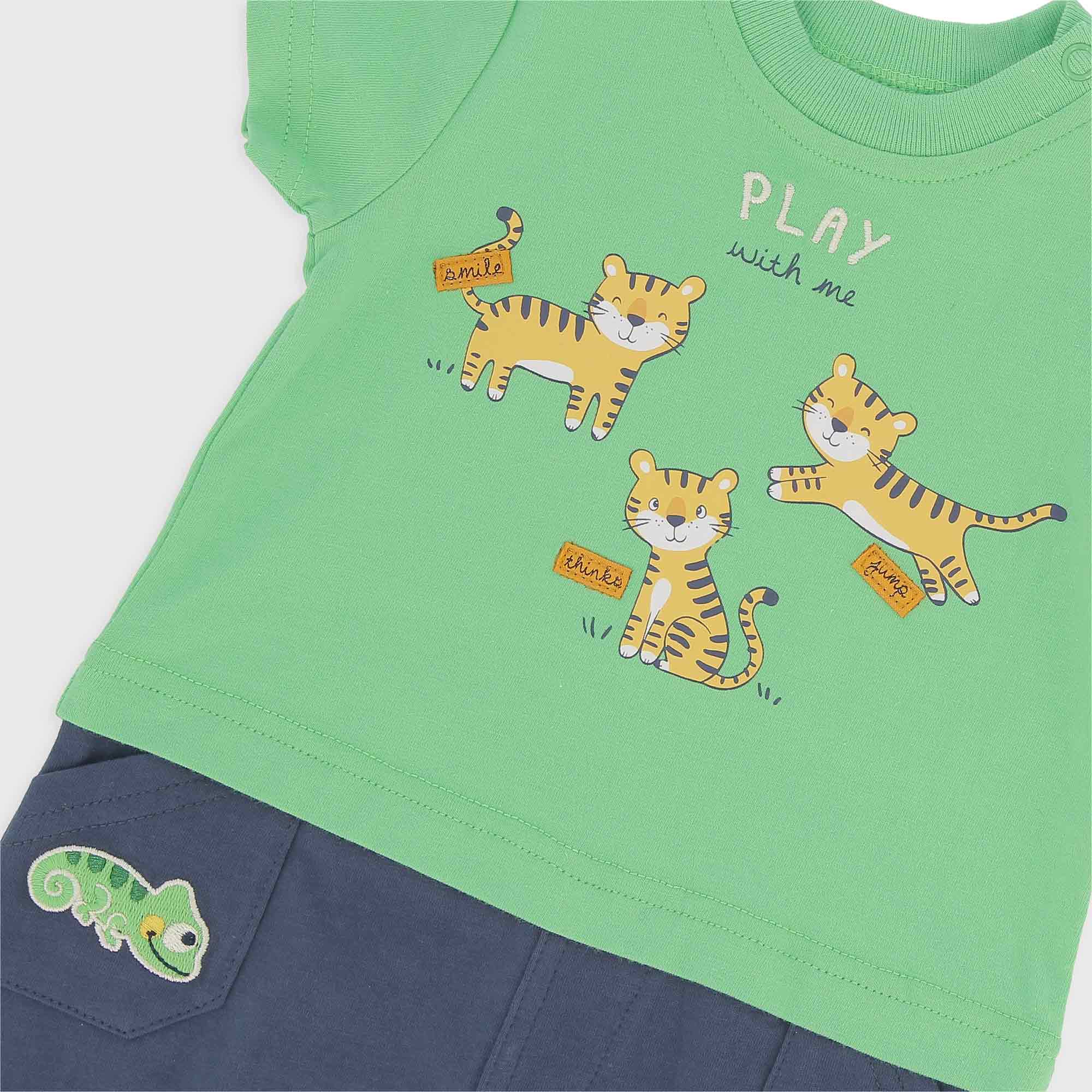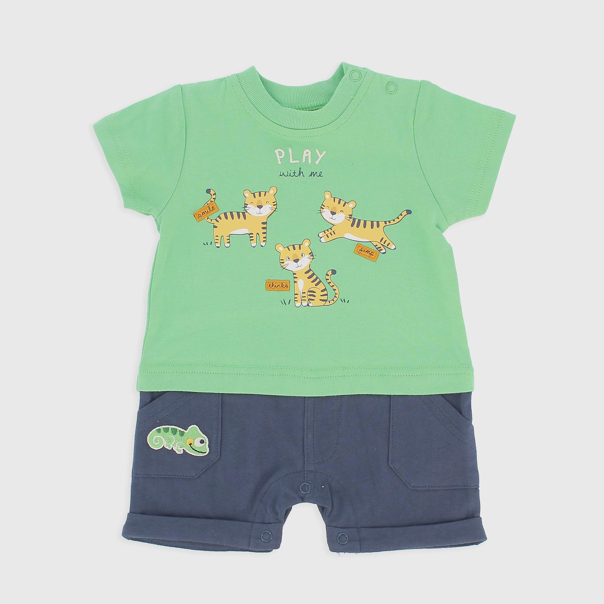 Pelele de tejido tipo jersey, cuello redondo, mangas cortas. Cierre con botones automáticos en el hombro y tiro. Bolsillos laterales y parte delantera bordada y estampada.