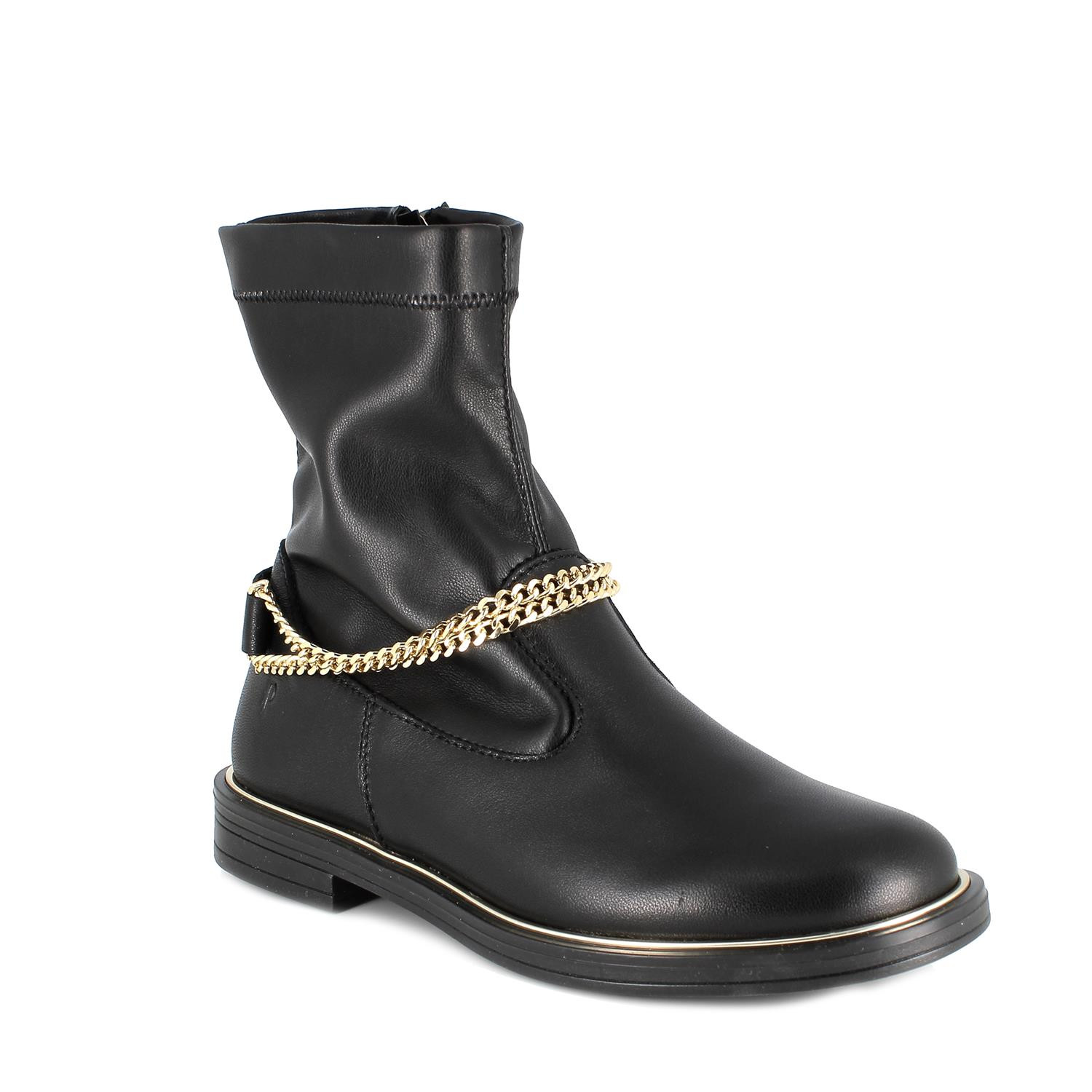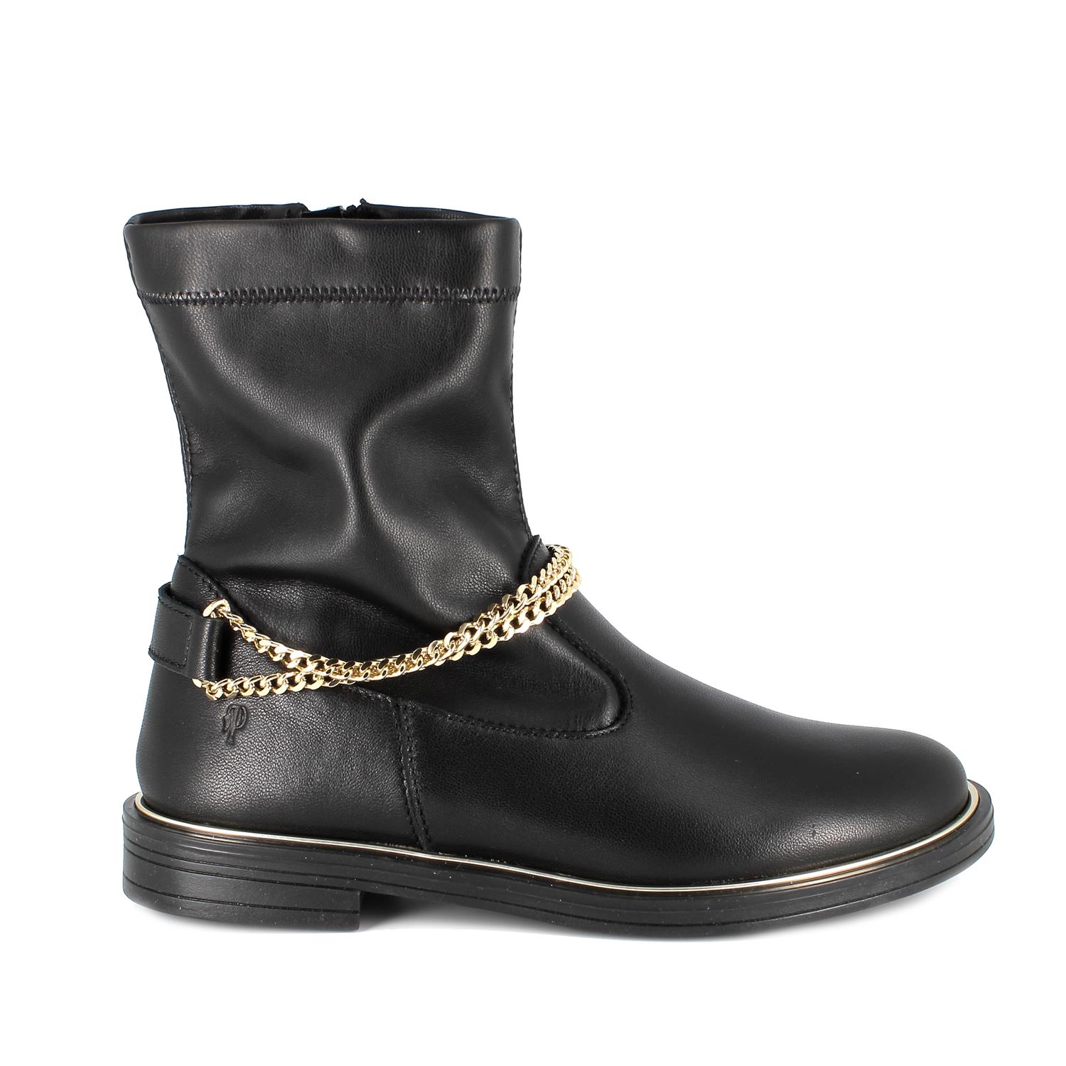 Estos elegantes botines de niña son modelos únicos y a la moda para un look contemporáneo. Están fabricados con charol y tiene una caña elástica muy cómoda para ajustarse a cualquier niña.El adorno de cadena dona un toque atrevido. La cómoda cremallera interna permite un calce fácil. La plantilla anatómica es extraíble y está recubierta de piel para asegurar transpirabilidad e higiene.