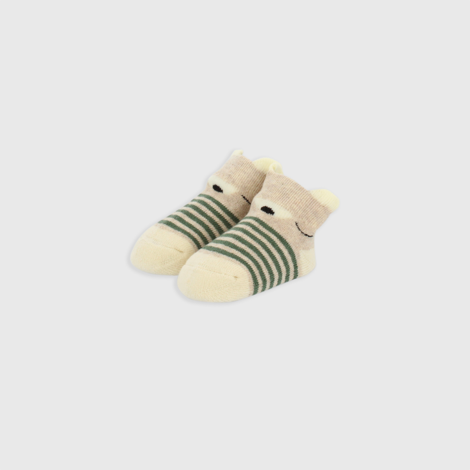 Calcetines de recién nacido con animal y rayas, con goma antideslizante. Borde elástico.