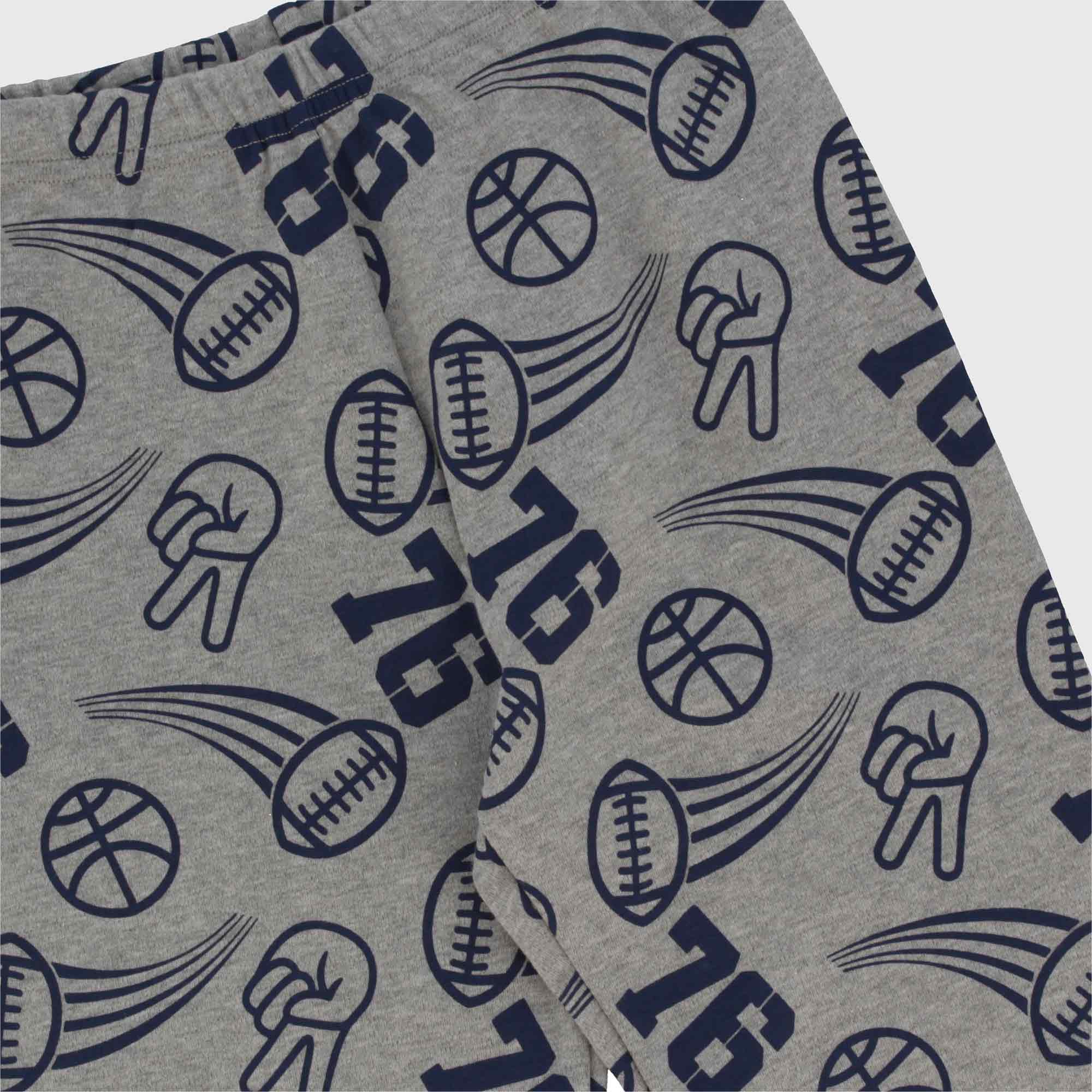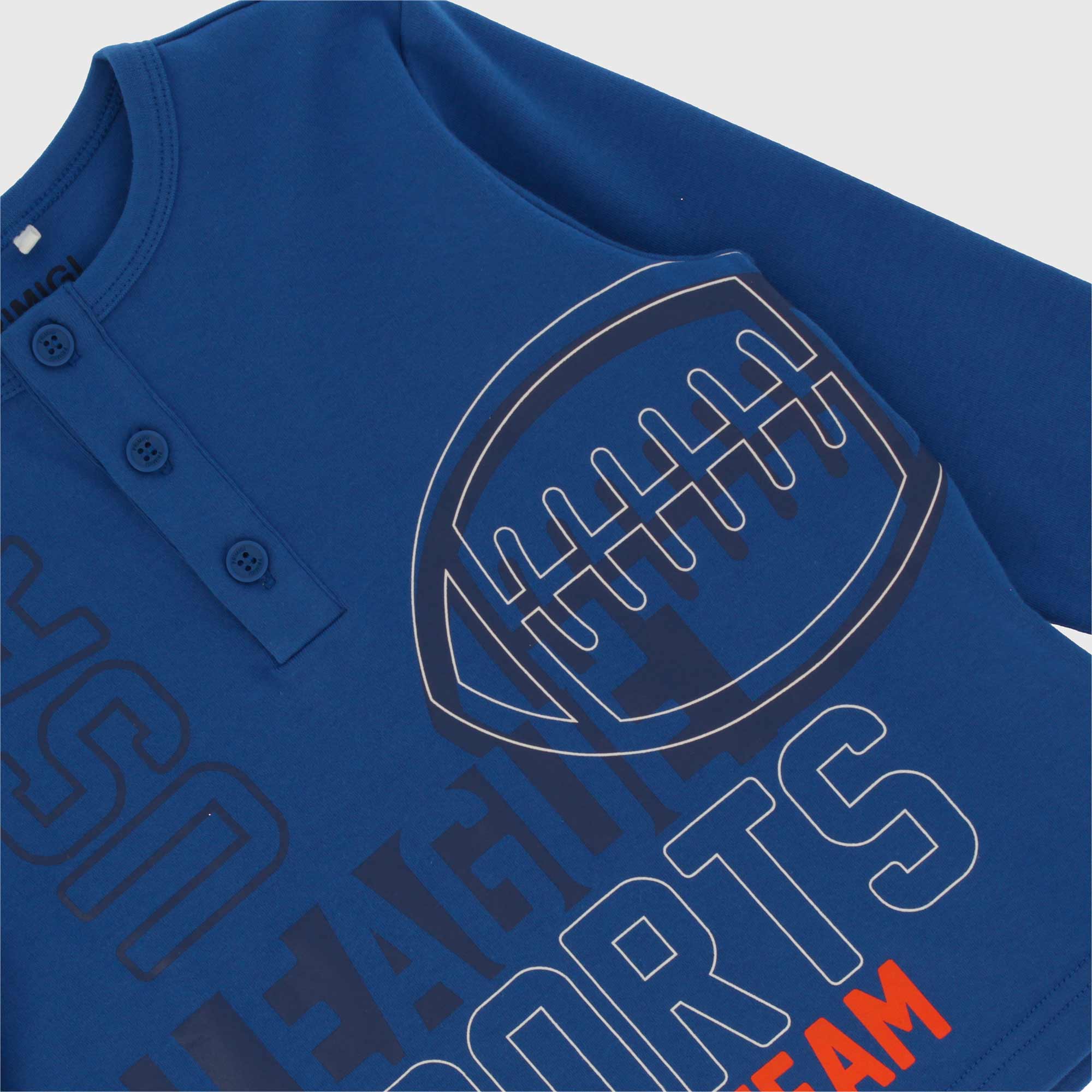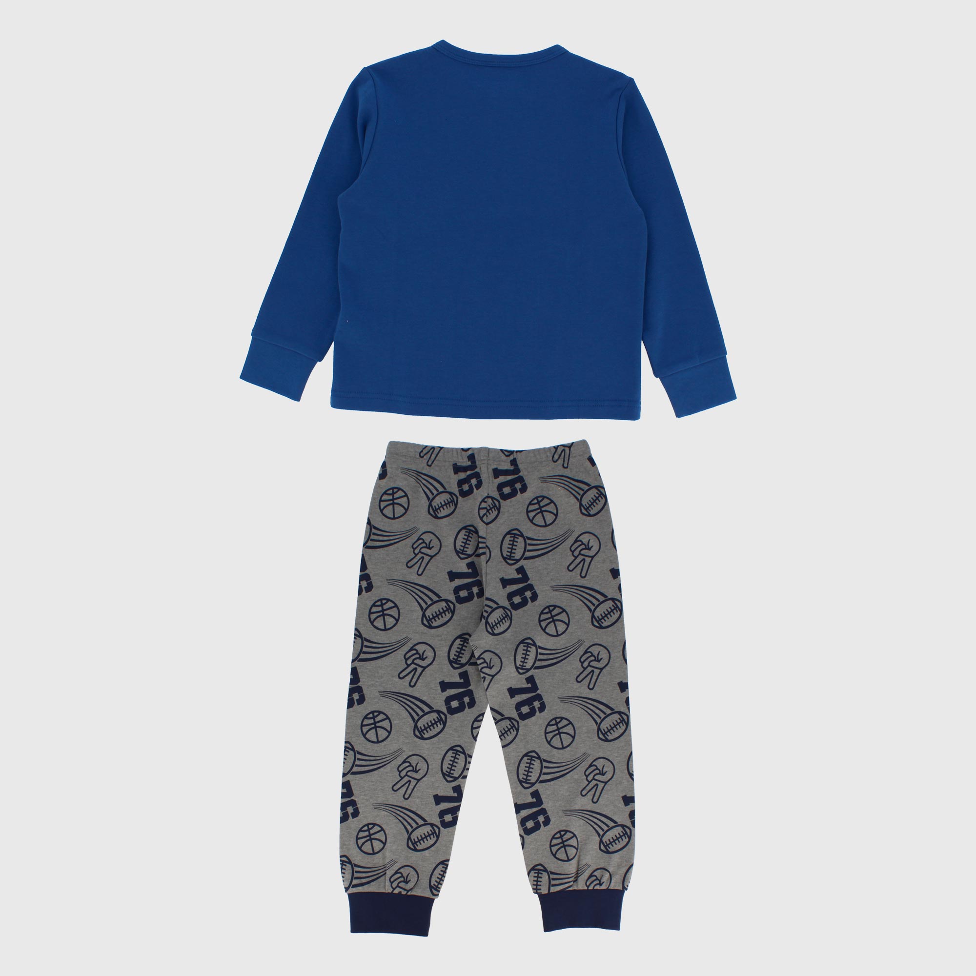 Conjunto de pijama de algodón cálido. Camiseta cuello redondo con botones, mangas largas. Parte delantera estampada. Cierre con botones delanteros. Pantalón con cintura elástica y parte inferior pana en contraste. Tema rugby estampado all over.