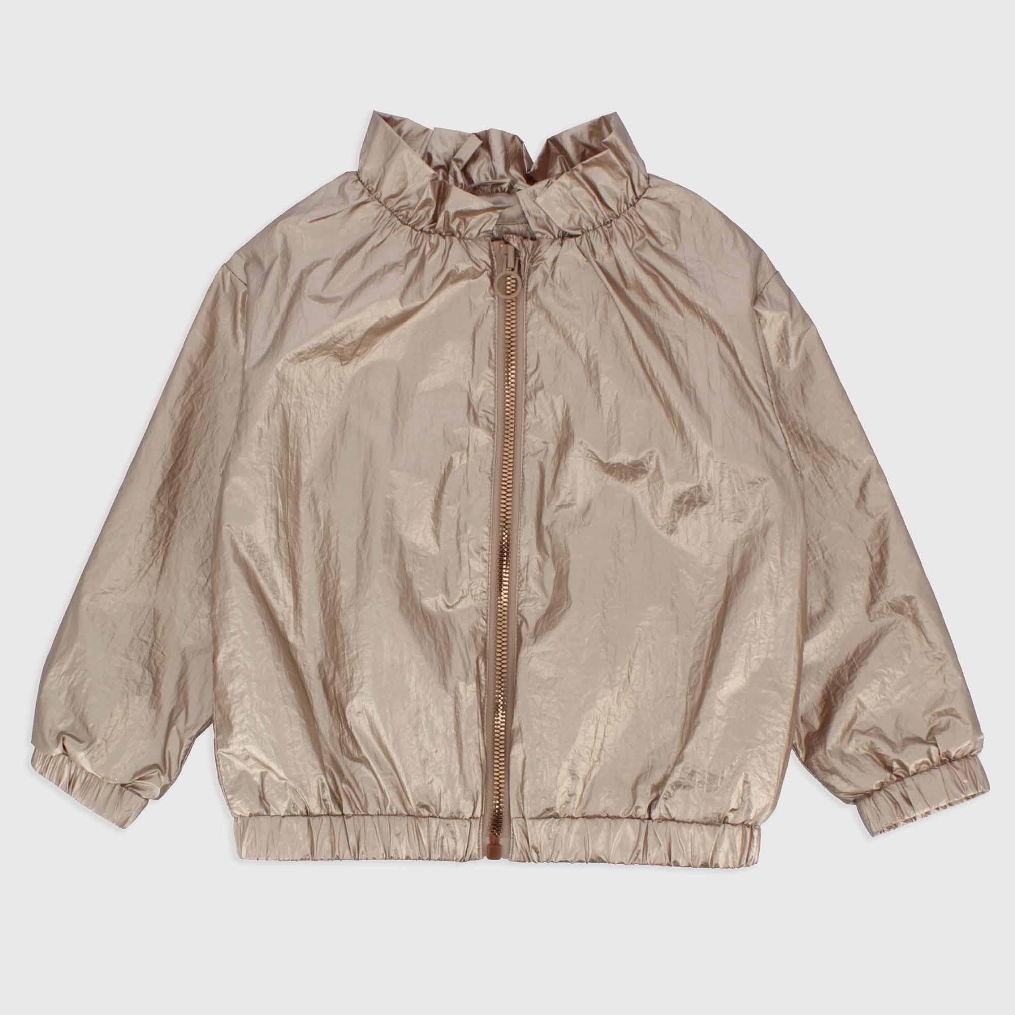 Cazadora de nylon efecto laminado, con volantes en el cuello, mangas largas. Cierre con cremallera en la parte delantera. Puños y parte inferior con elástico. Forro interior.