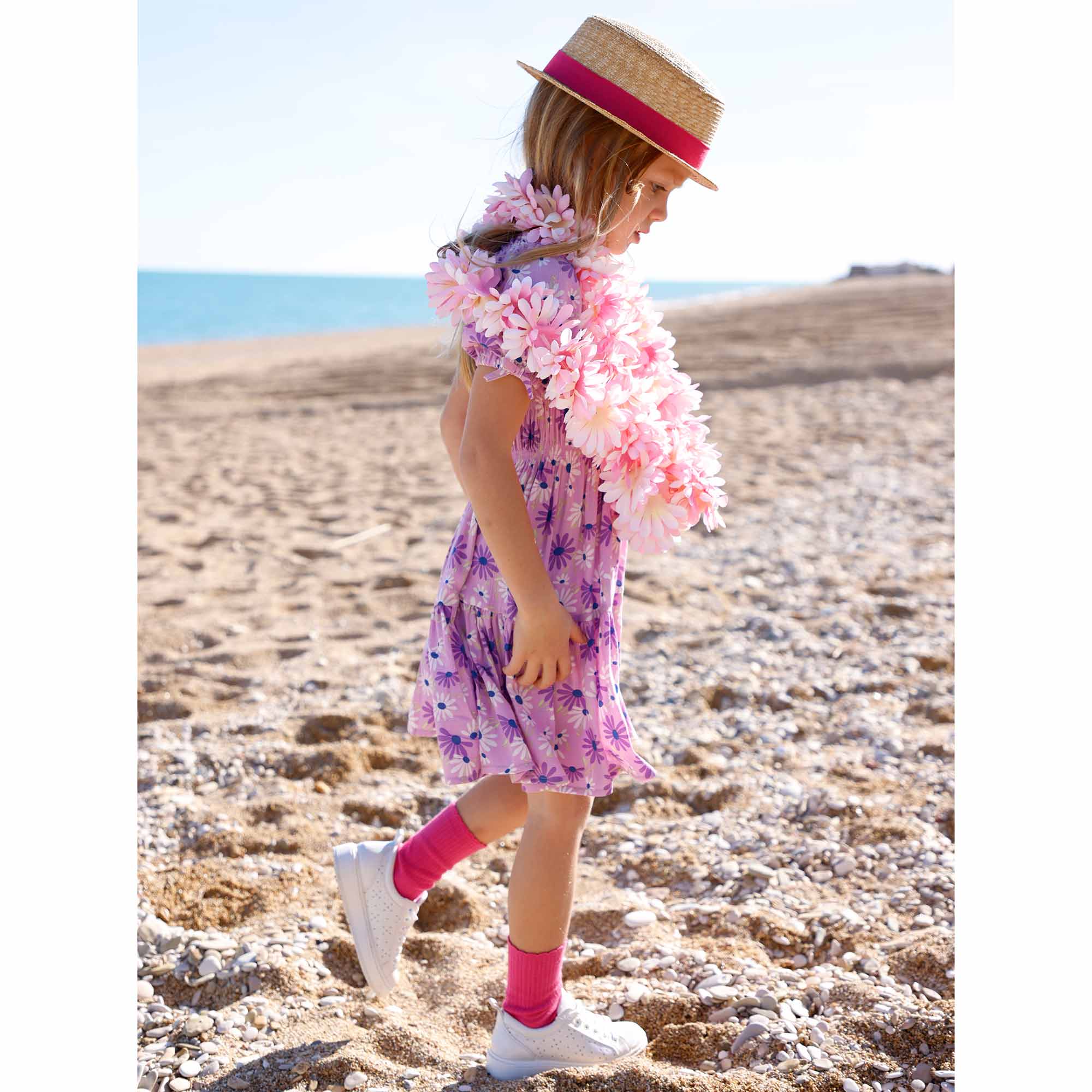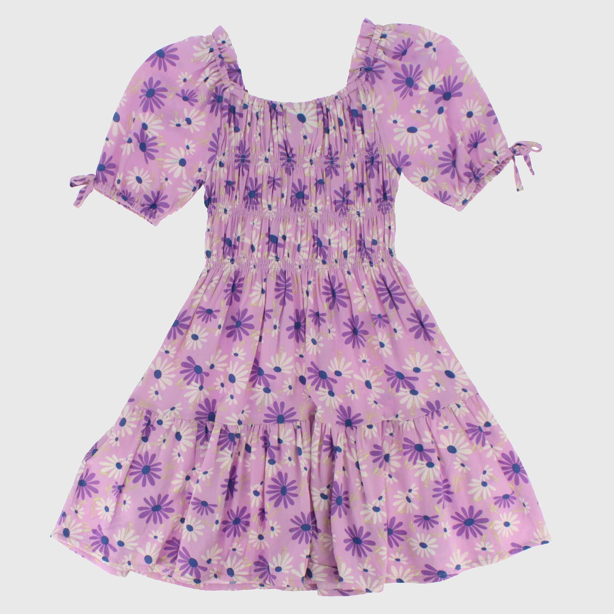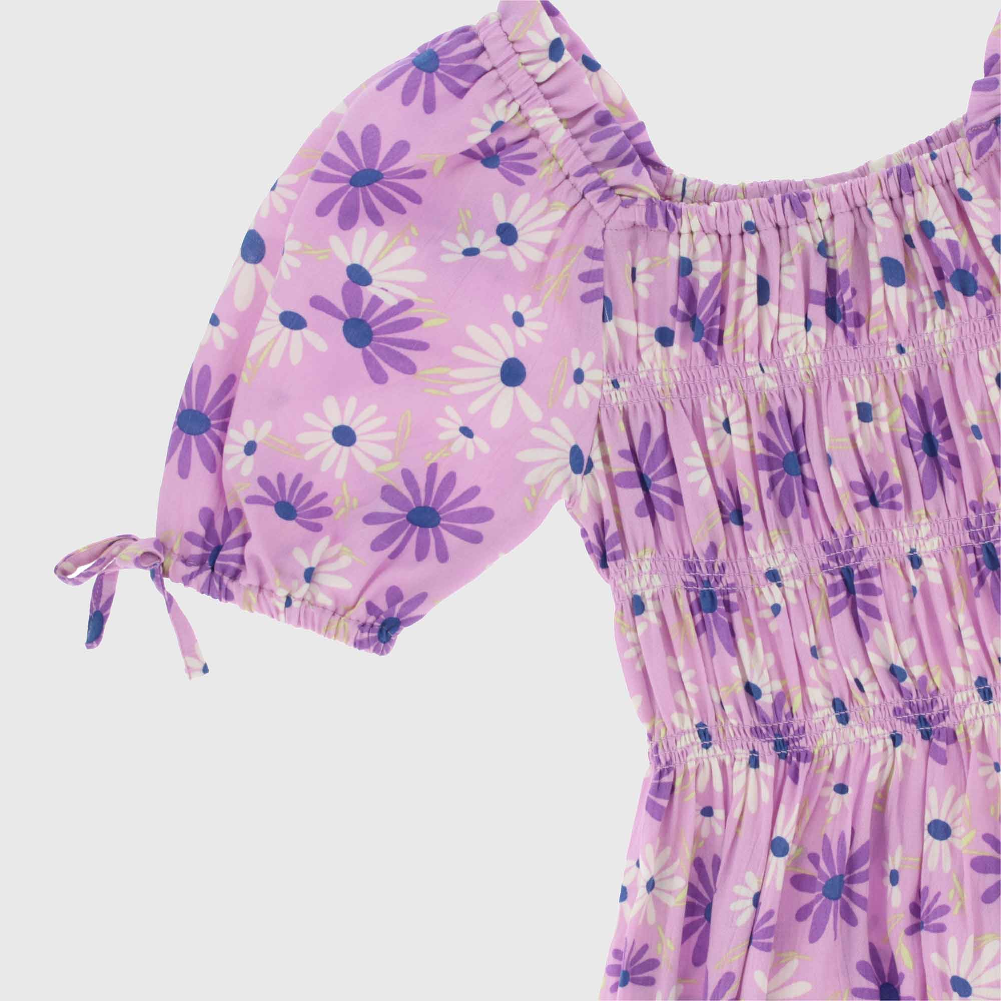 Vestido de crepe de viscosa estampado, cuello cuadrado, con mangas cortas tipo globo. Pespuntes elásticos en la cintura y cuello. Amplia falda con volante.