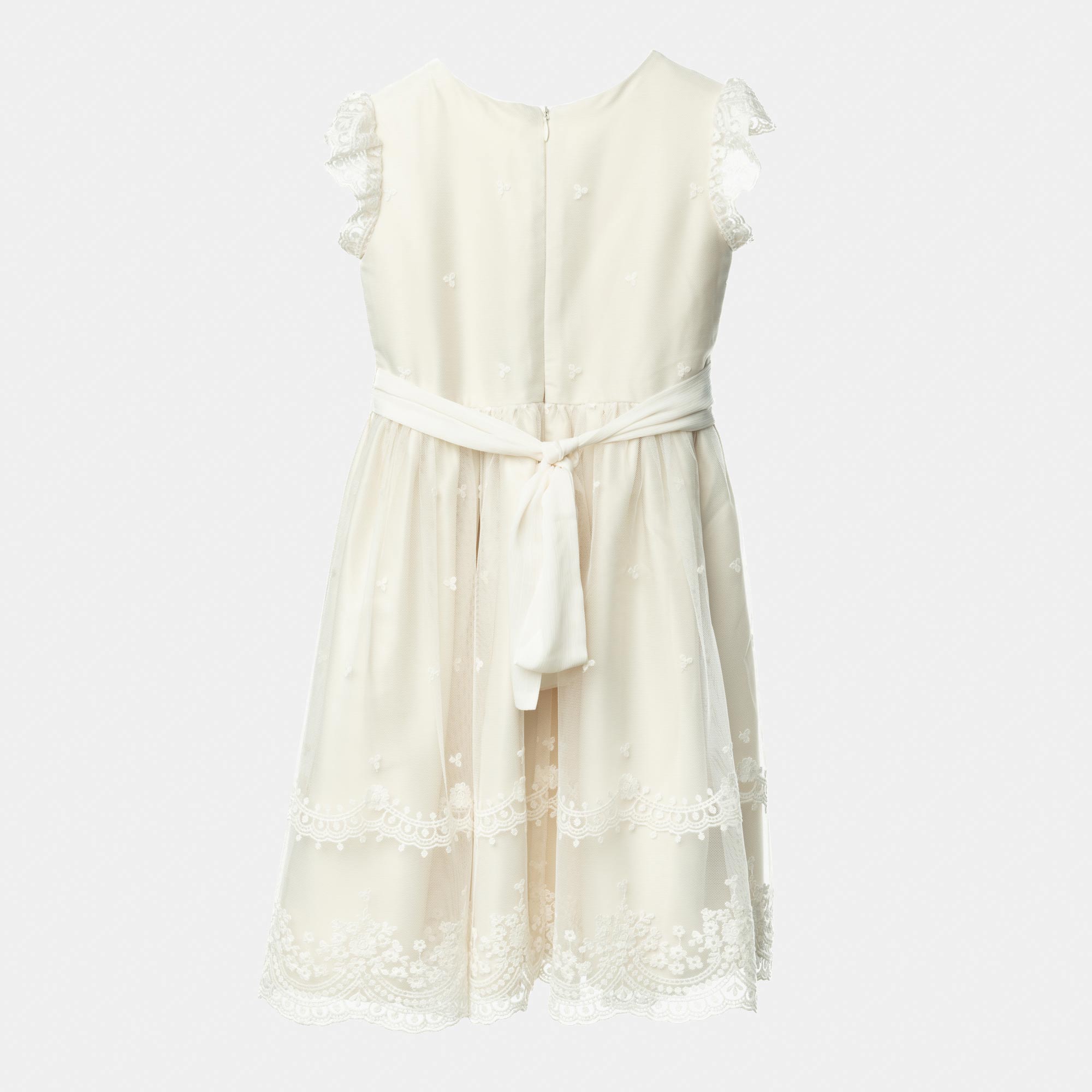Vestido de satén cubierto con tul bordado, cuello redondo, sin mangas con volantes de encaje. Cierre con cremallera oculta en la parte trasera. Corte en la cintura y con pliegues en la parte trasera y delantera. Forro de muselina de algodón. Cinturón despegable de crepe.
