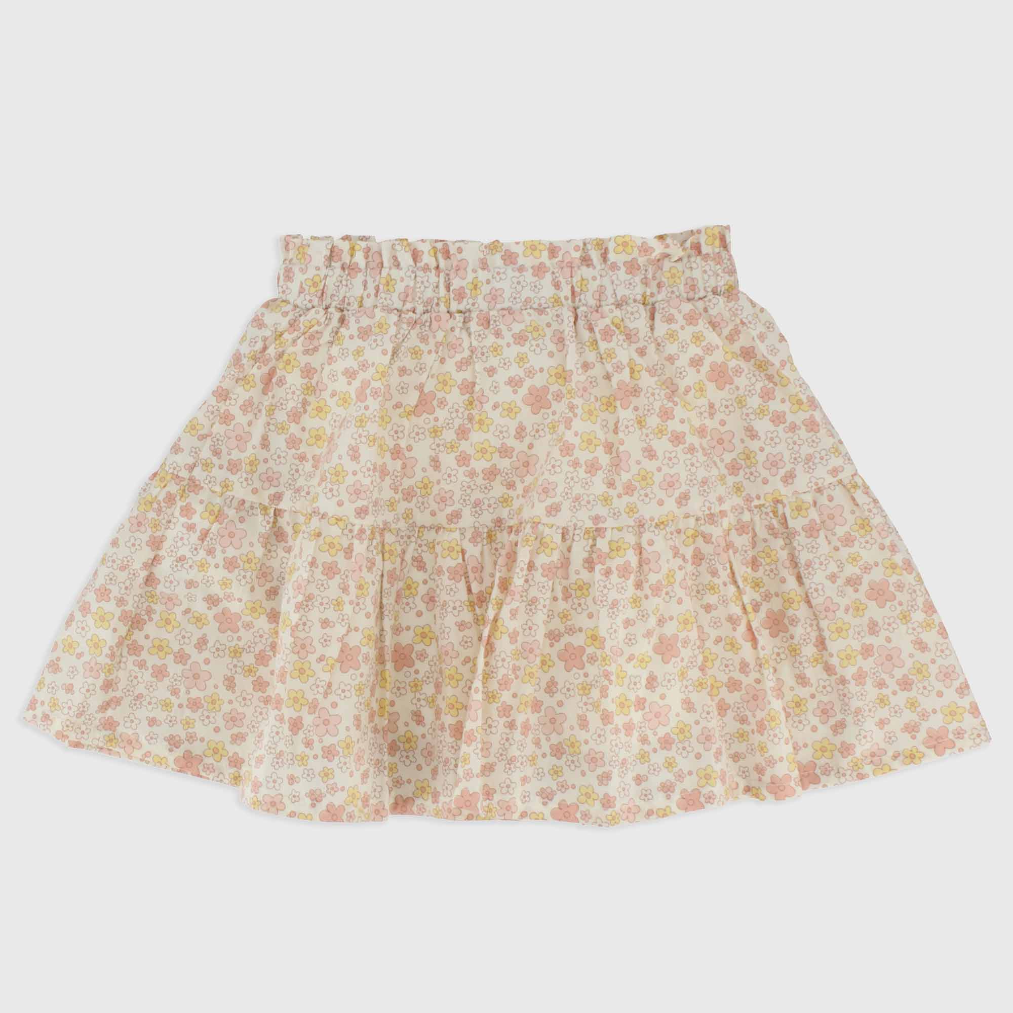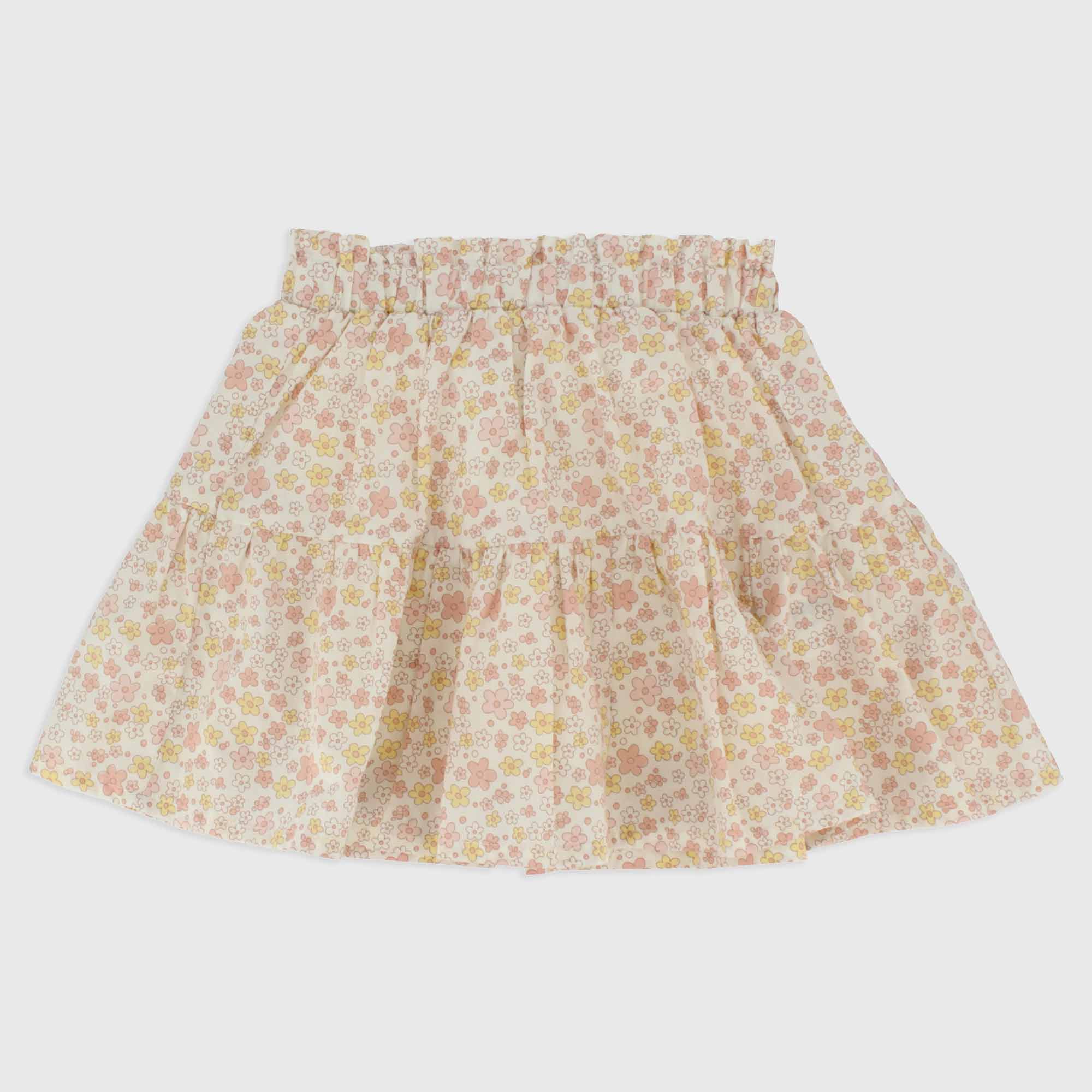Falda de algodón estampado con cintura elástica y volantes. Forro con pantalón corto de tejido tipo jersey.