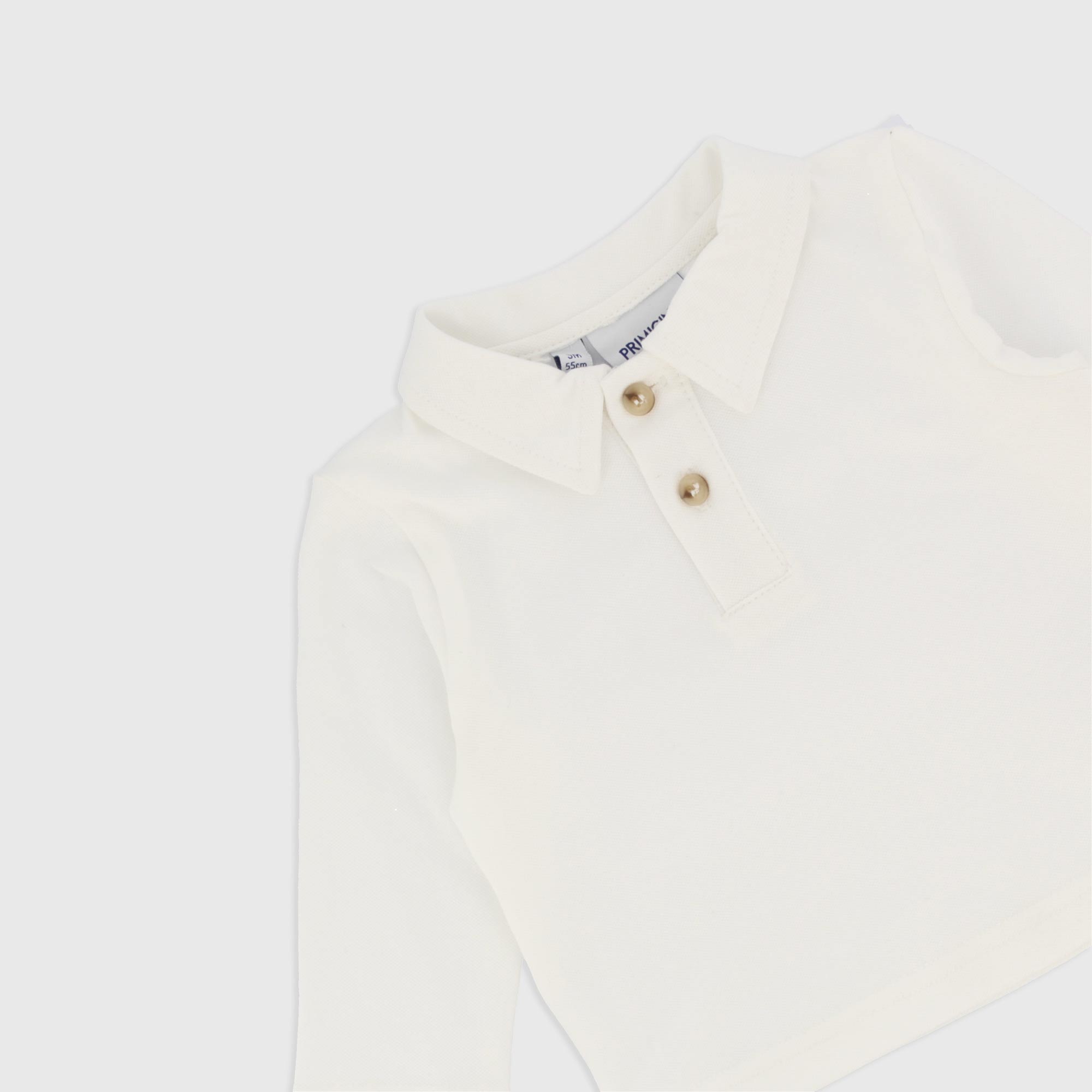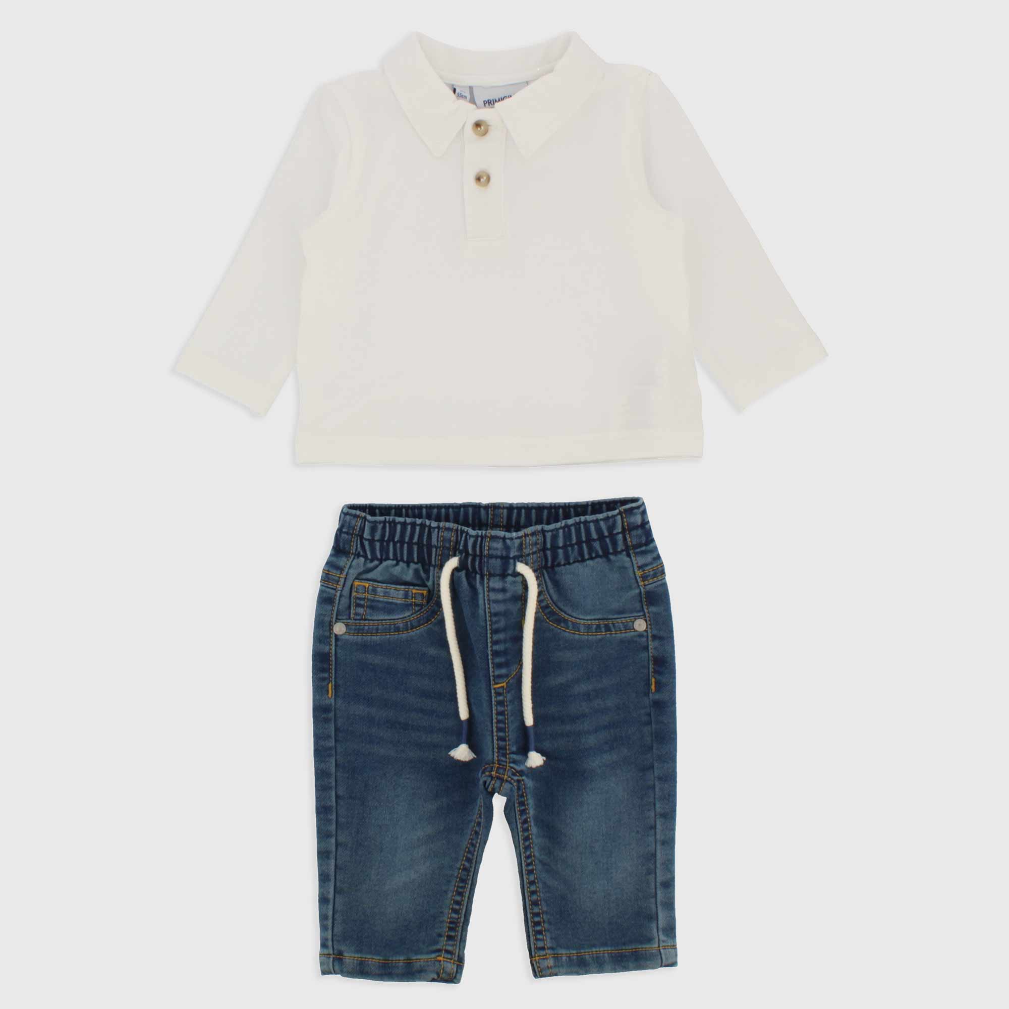 Conjunto formado por dos piezas. Polo piqué, mangas largas. Pantalón vaquero punto, con cintura elástica y cordones delanteros. Bolsillos de parche en la parte trasera.