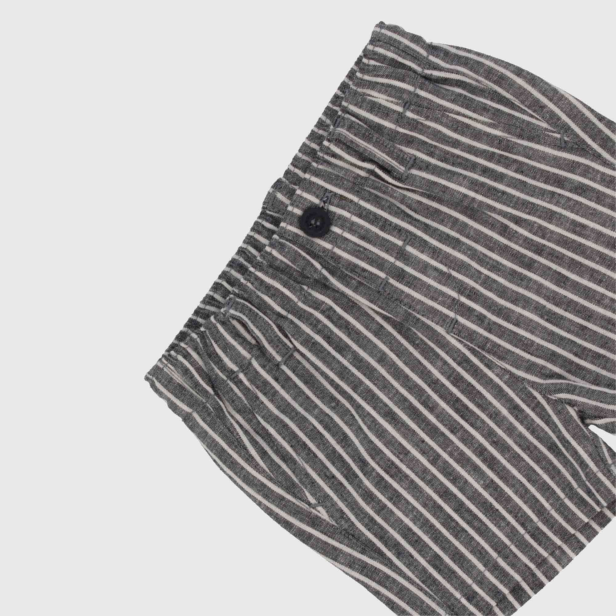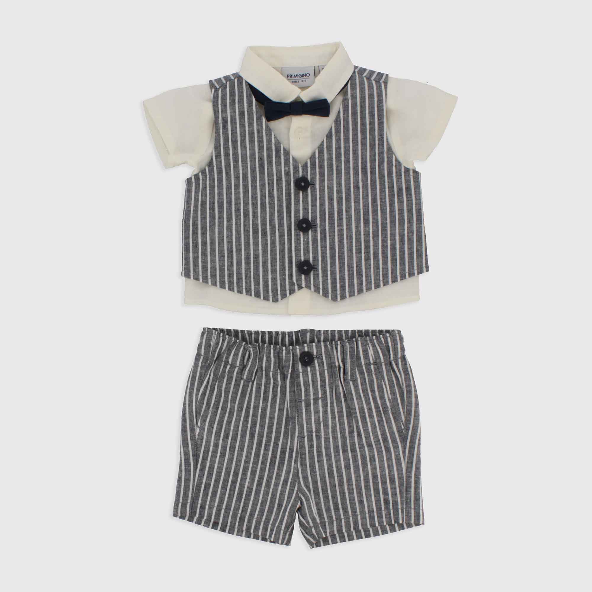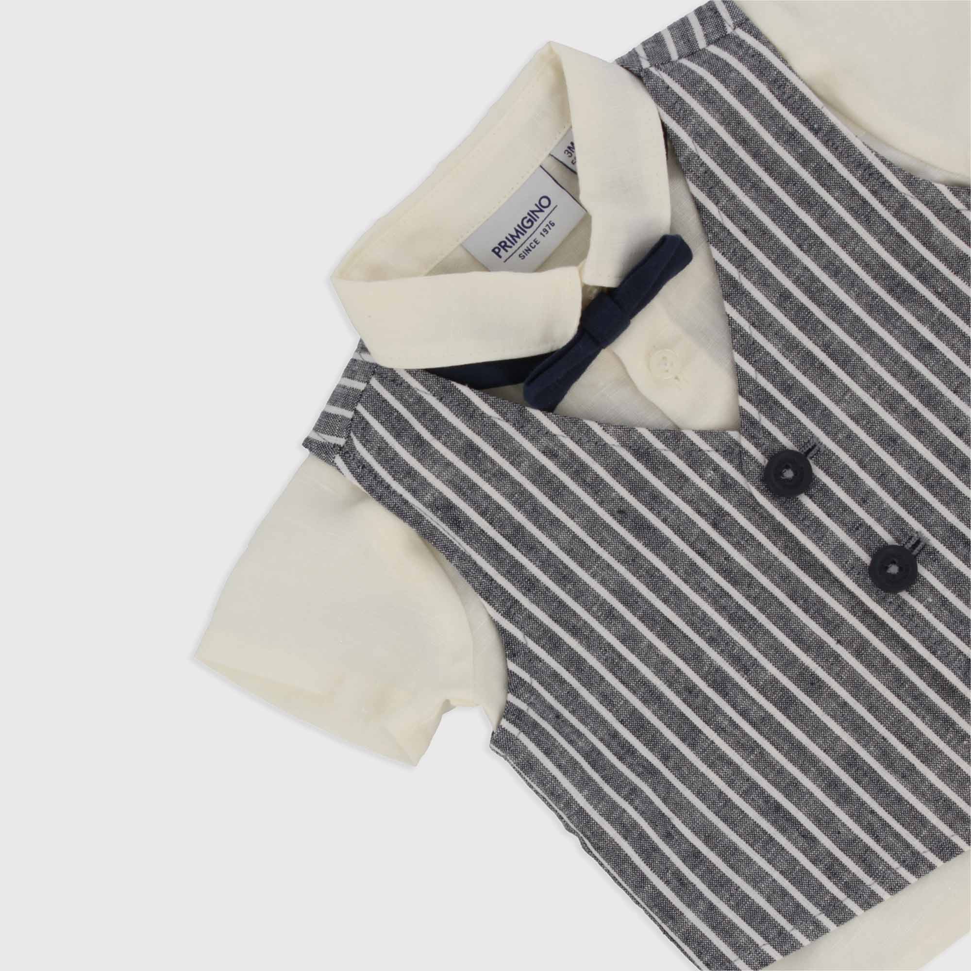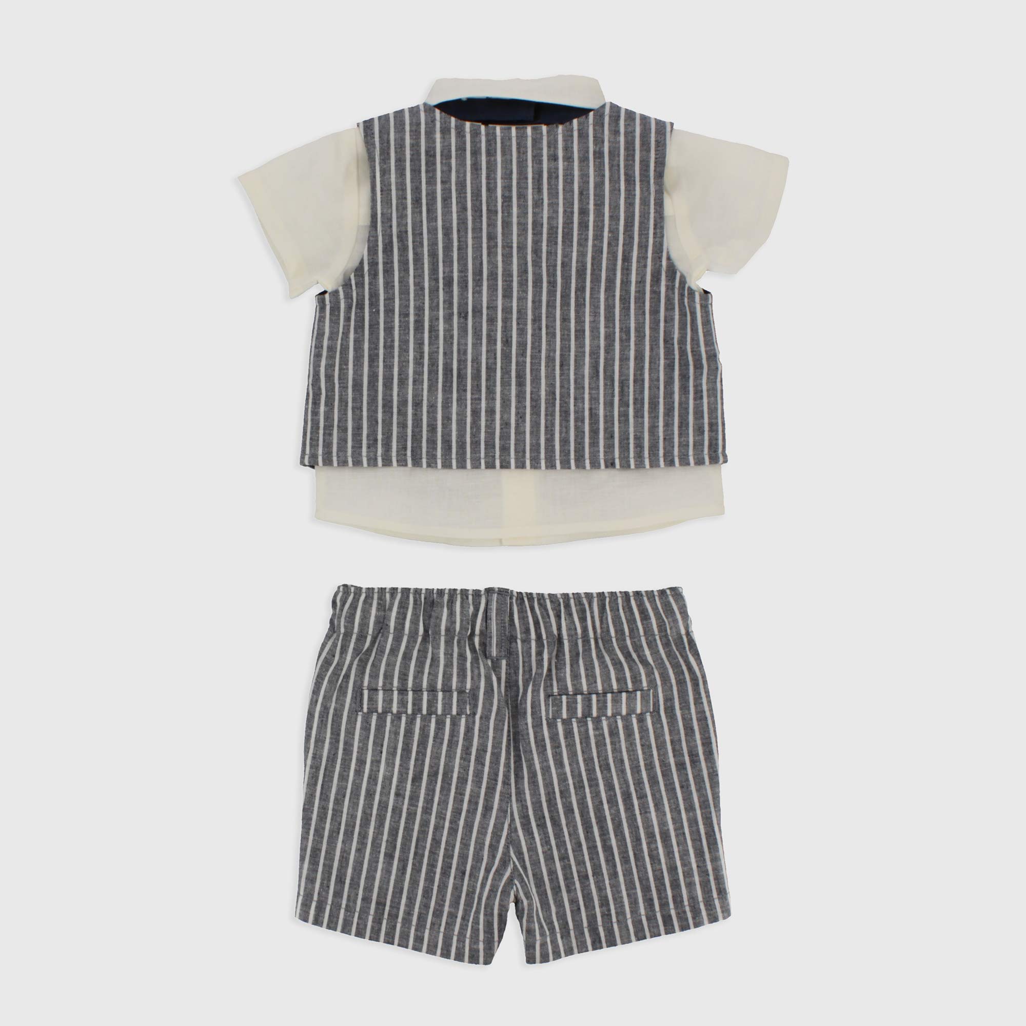 Conjunto de lino-algodón formado por cuatro piezas. Camisa con mangas cortas, con cierre con botones en la parte delantera. Chaleco de rayas con cierre con botones en la parte delantera. Bermuda de rayas, con cintura elástica, botón y trabilla. Pajarita con cierre con velcro.