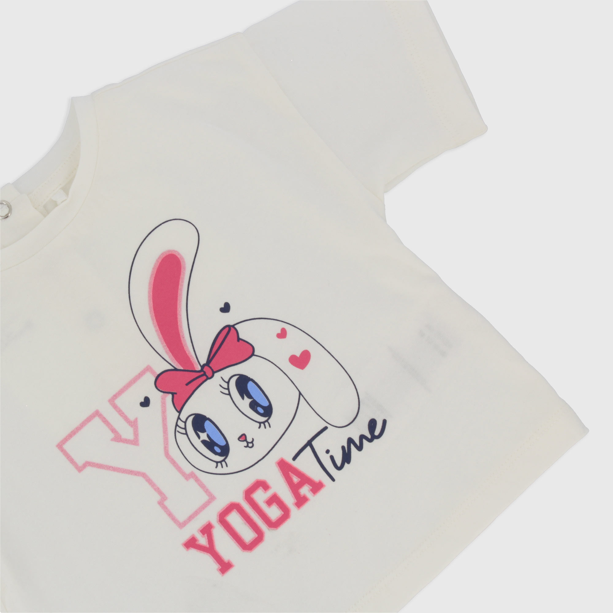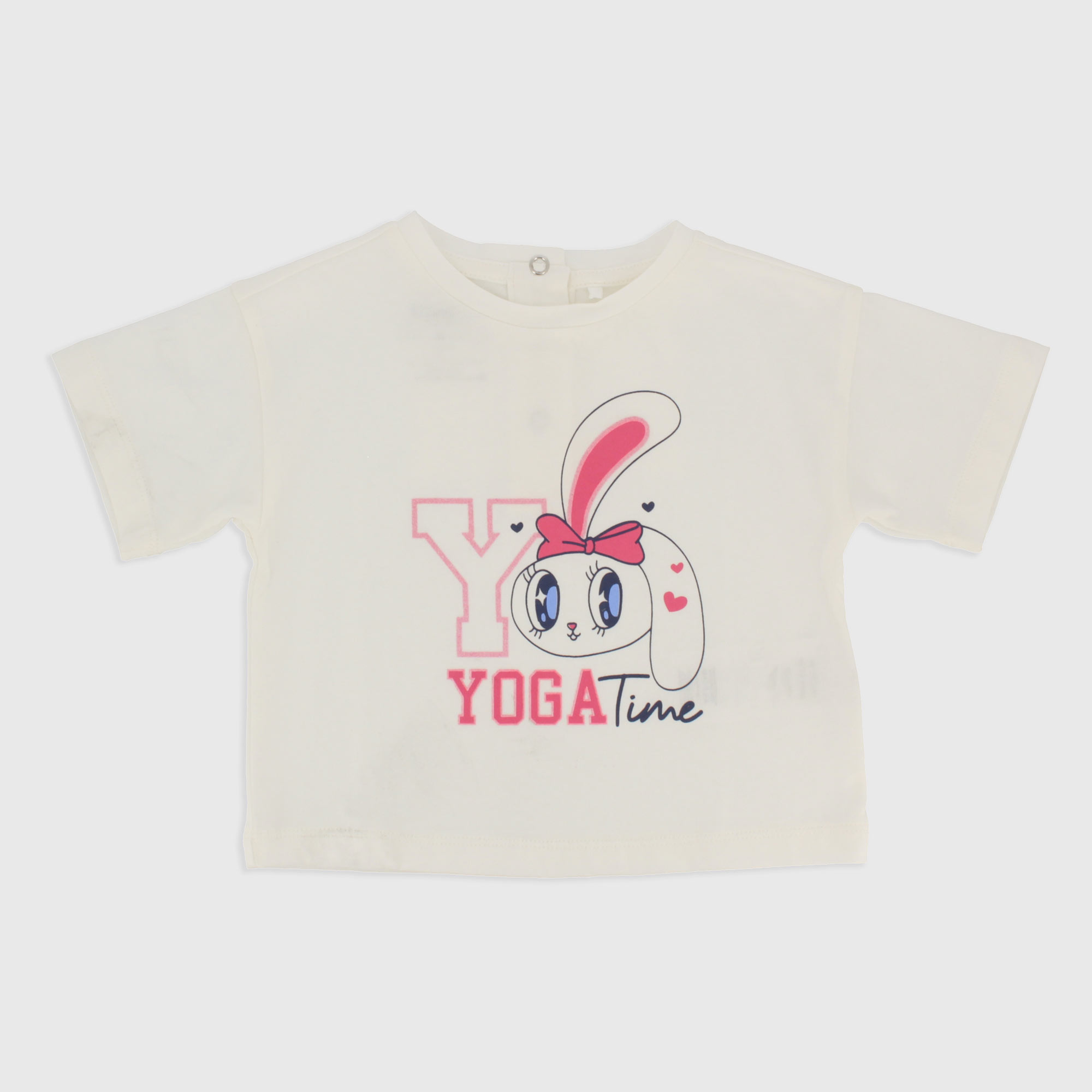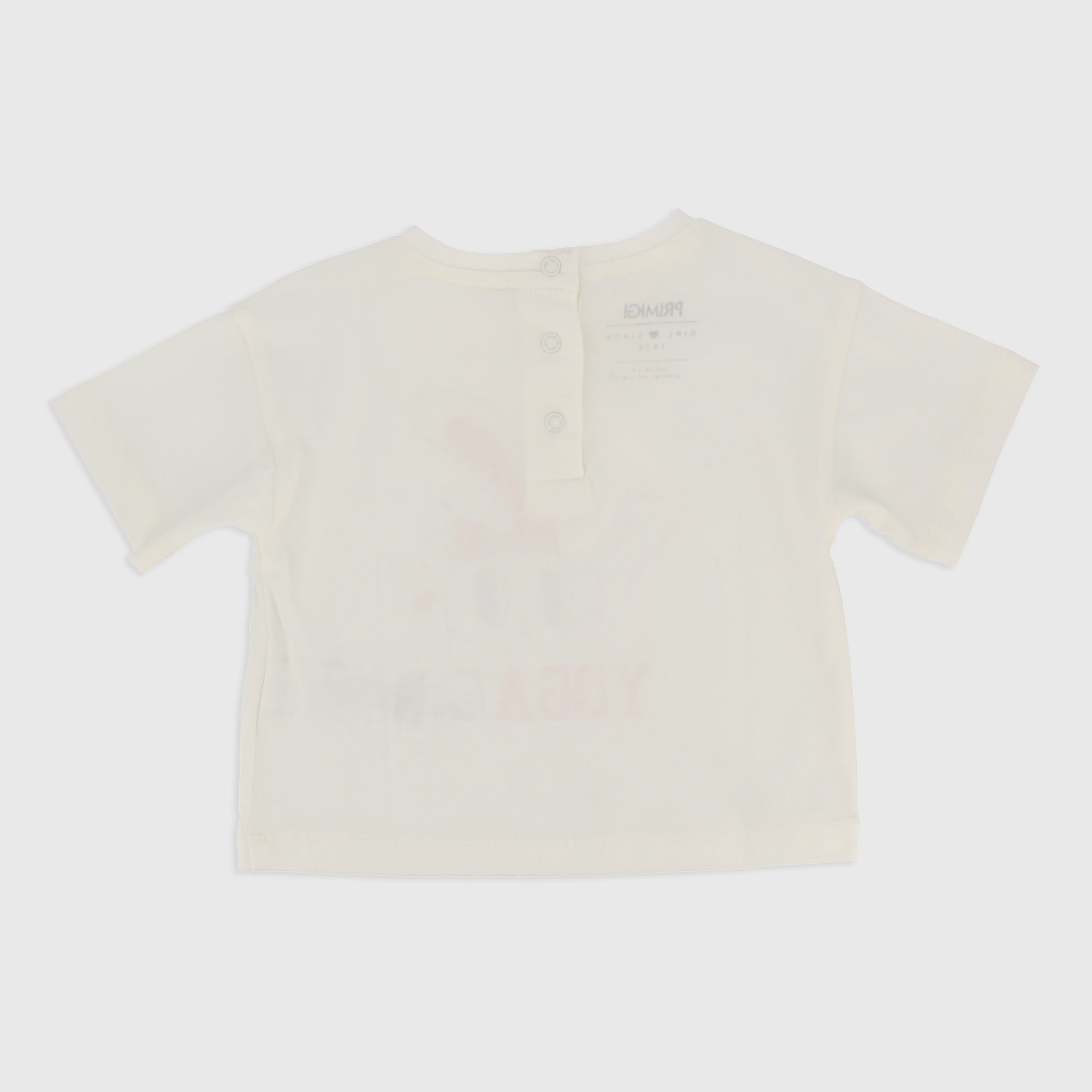 Camiseta oversize de tejido tipo jersey, cuello redondo, mangas cortas. Cierre con botones en la parte trasera. Parte delantera estampada con detalles brillantes.