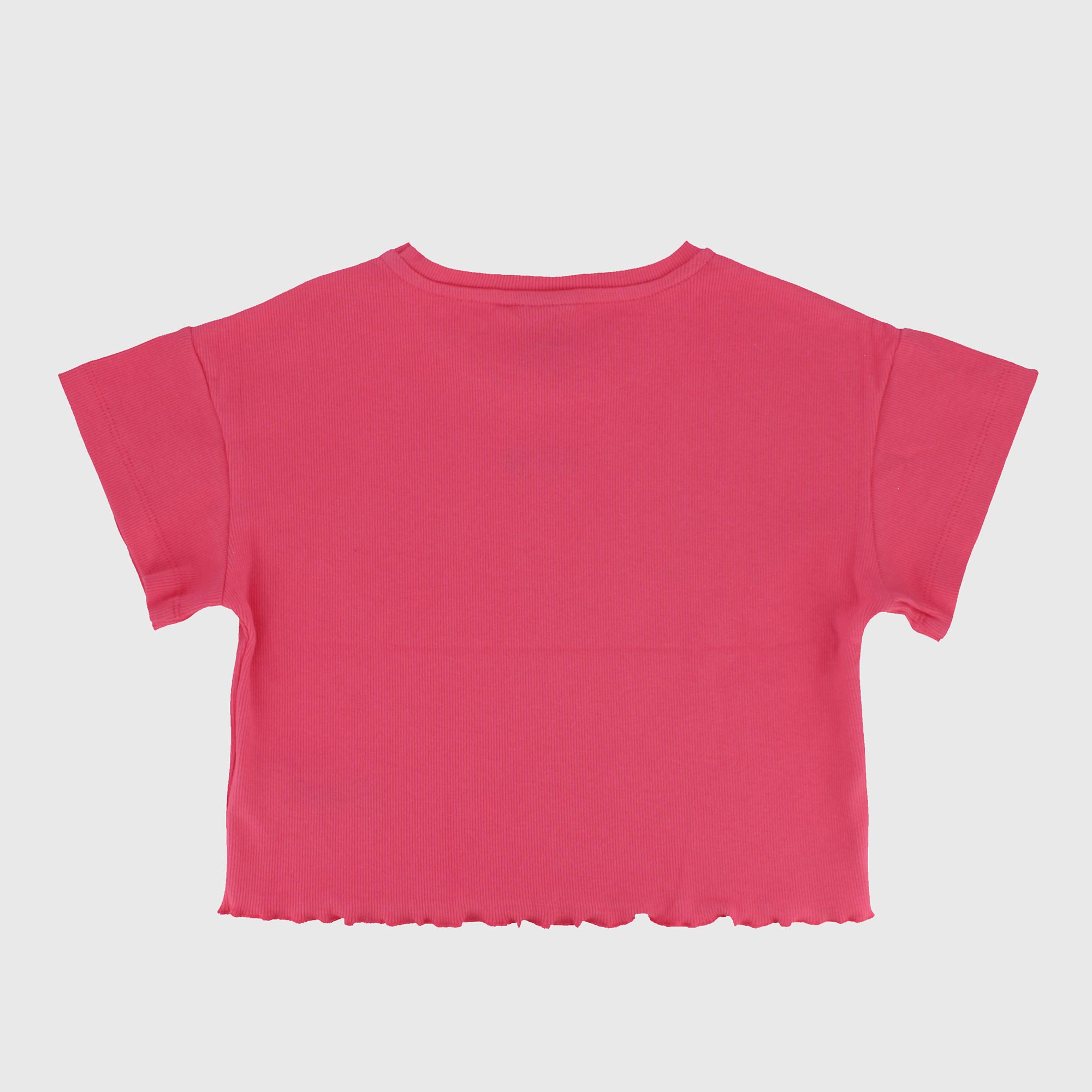 Camiseta pana, cuello redondo, mangas cortas. Corazones bordados en la parte delantera. Perfiles ondulados.