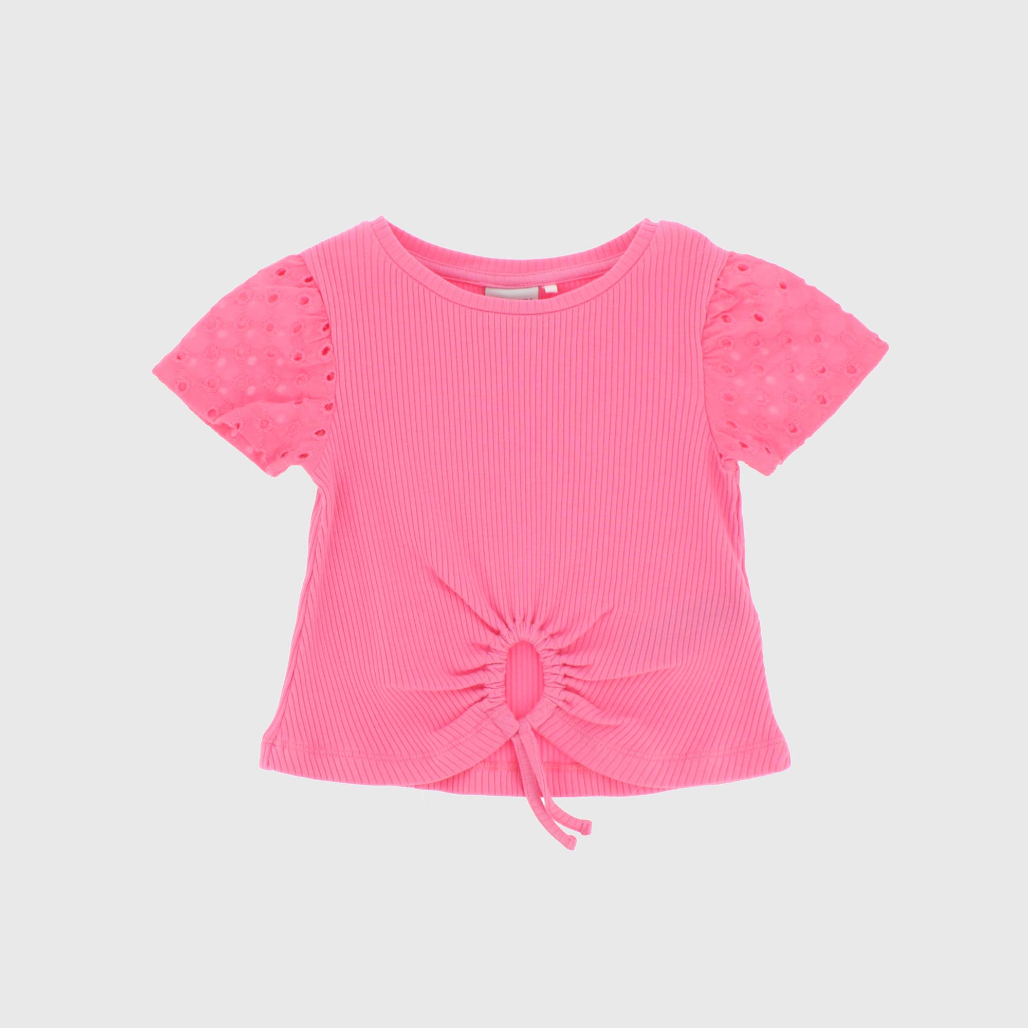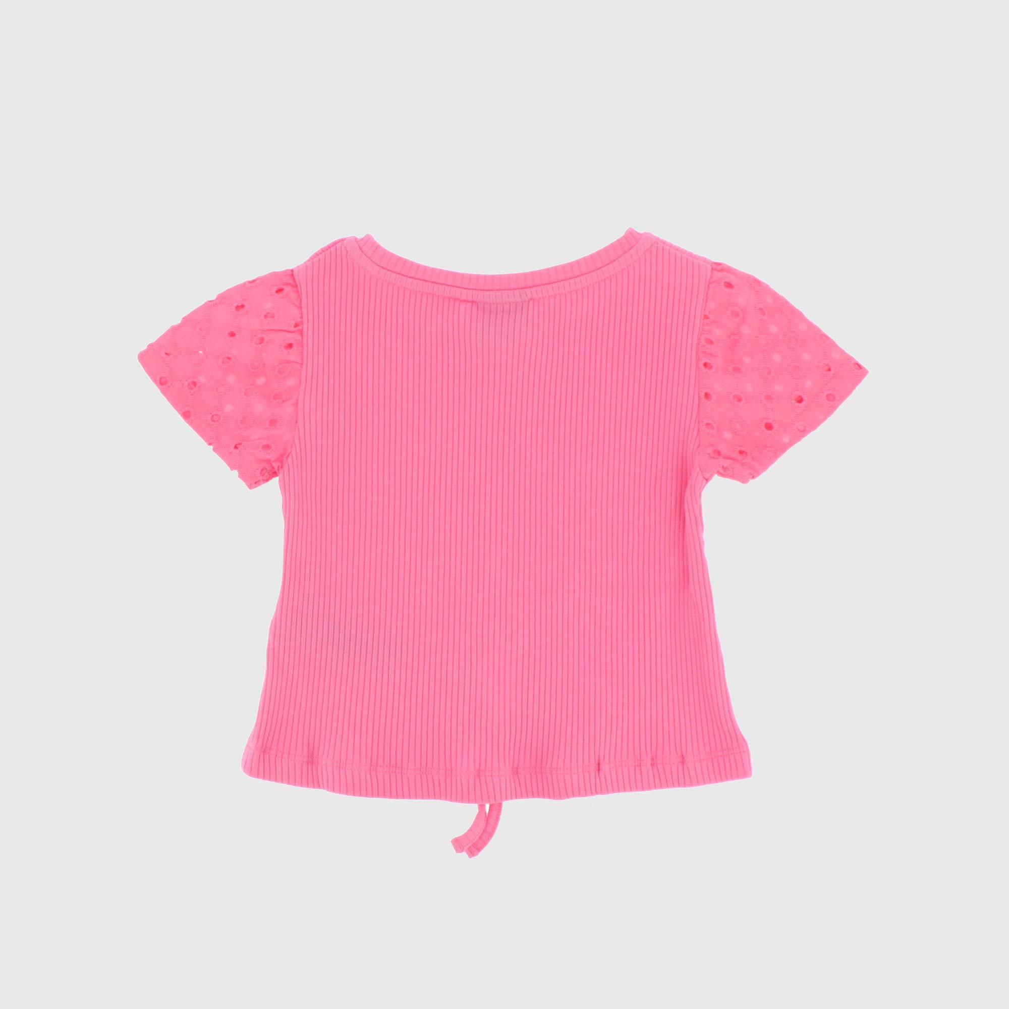 Camiseta pana, cuello redondo, mangas cortas de encaje de sanktgallen. Hueco elástico delantero.