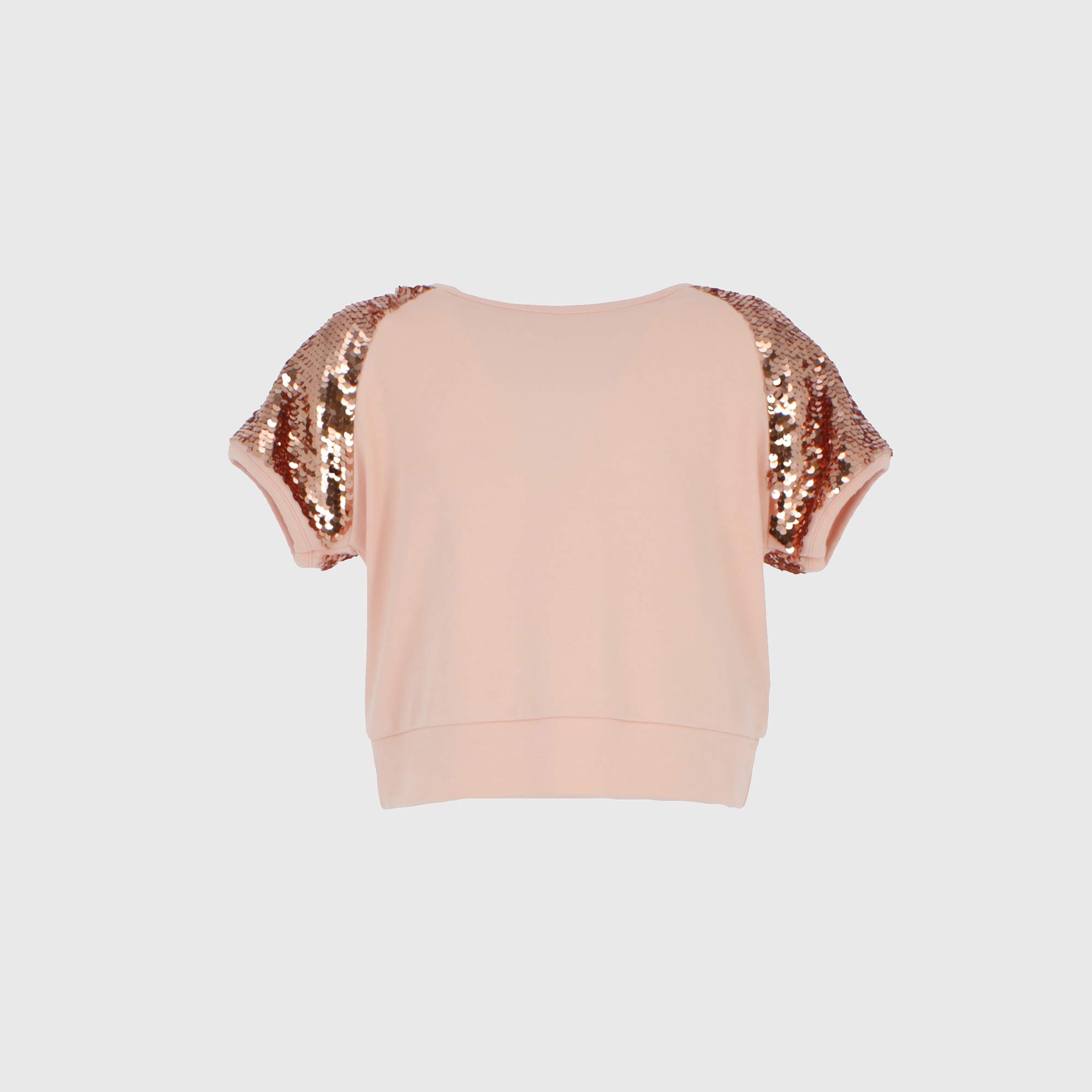 Camiseta de interlock, cuello redondo, con mangas cortas con lentejuelas.