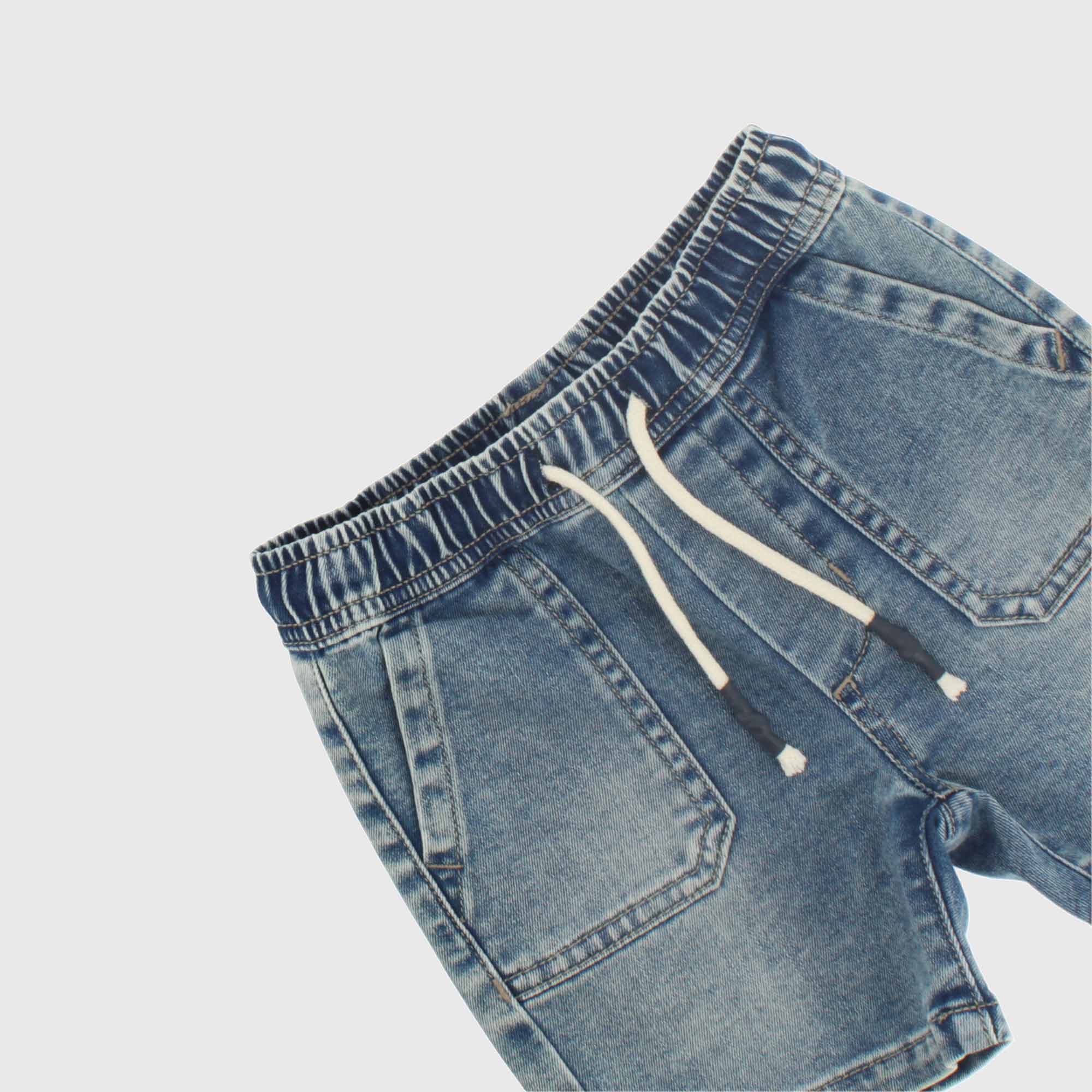 Bermuda vaquera con cordones delanteros. Bolsillos franceses en la parte delantera, bolsillos de parche con pathc en la parte trasera.