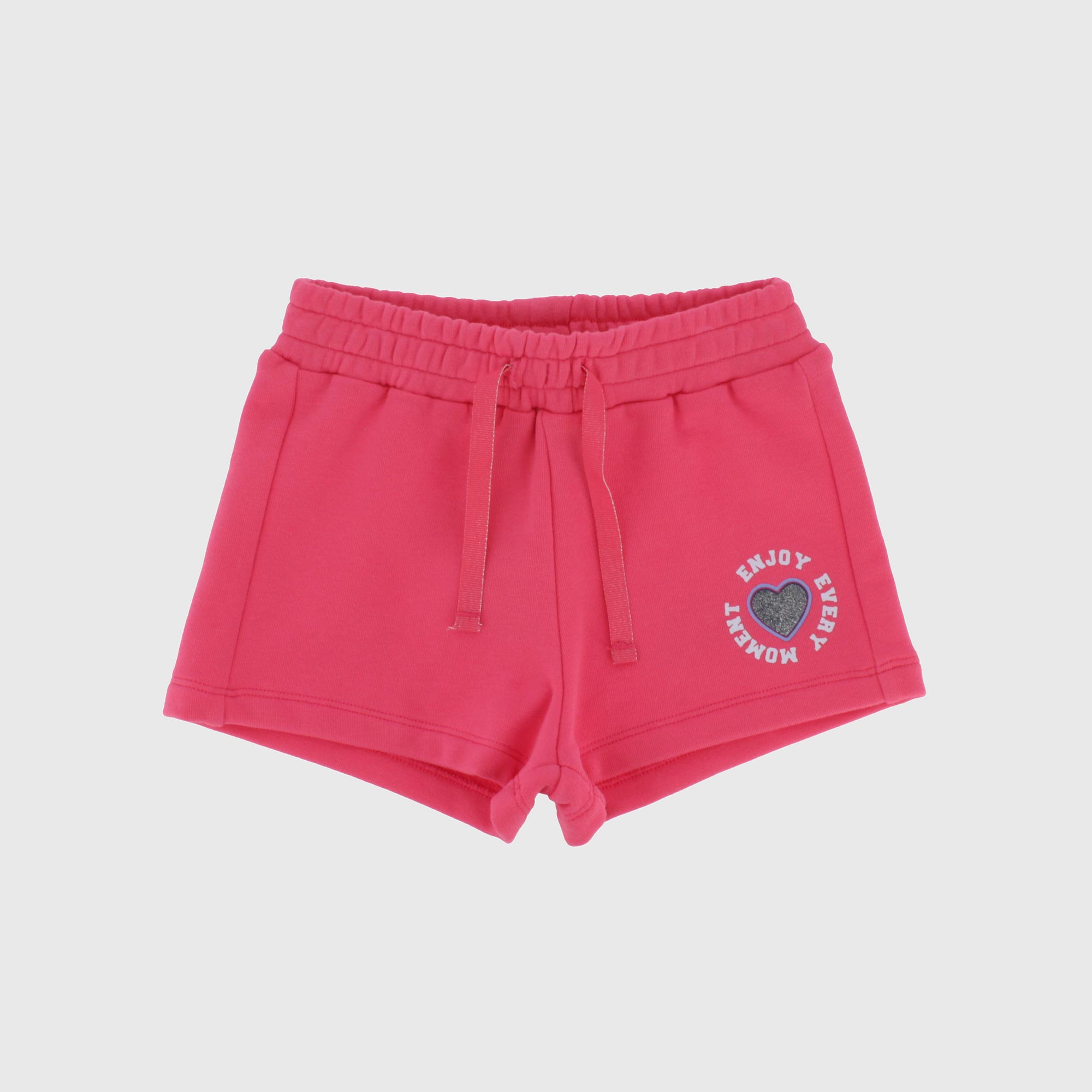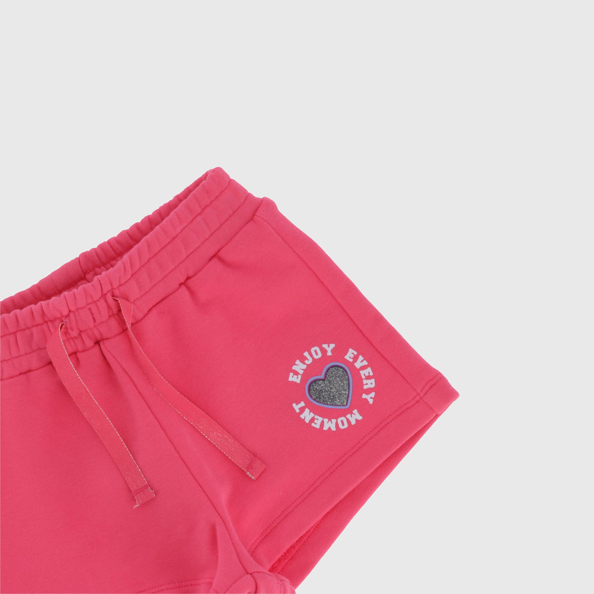 Pantalón corto de tejido tipo sudadera con cintura elástica y cordones delanteros. Parte delantera estampada con detalles brillantes.
