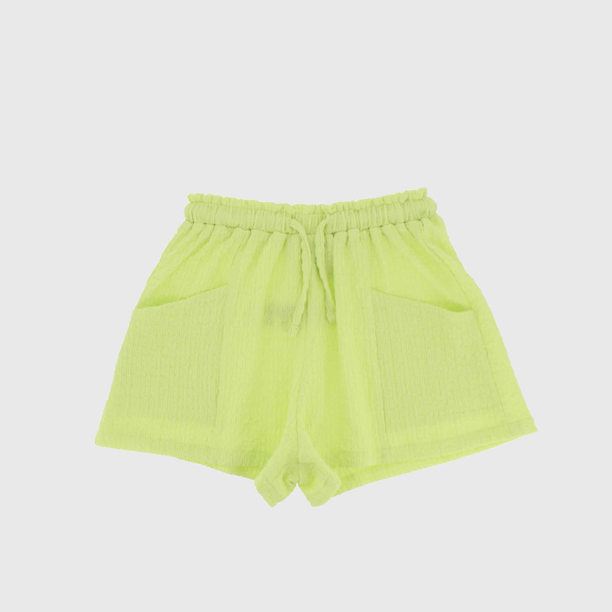 Pantalón corto de seersucker con cintura elástica. Bolsillos horizontales en la parte delantera.