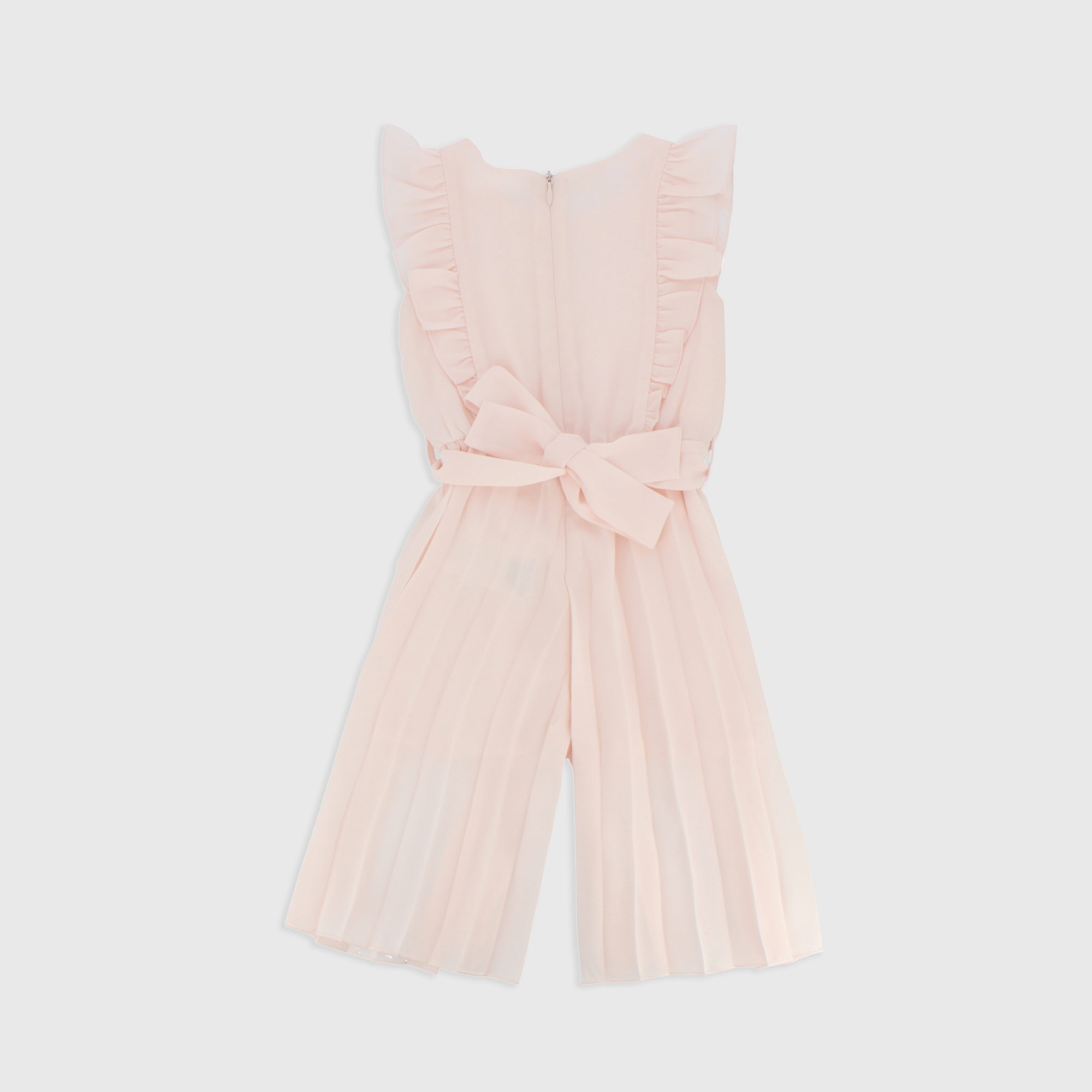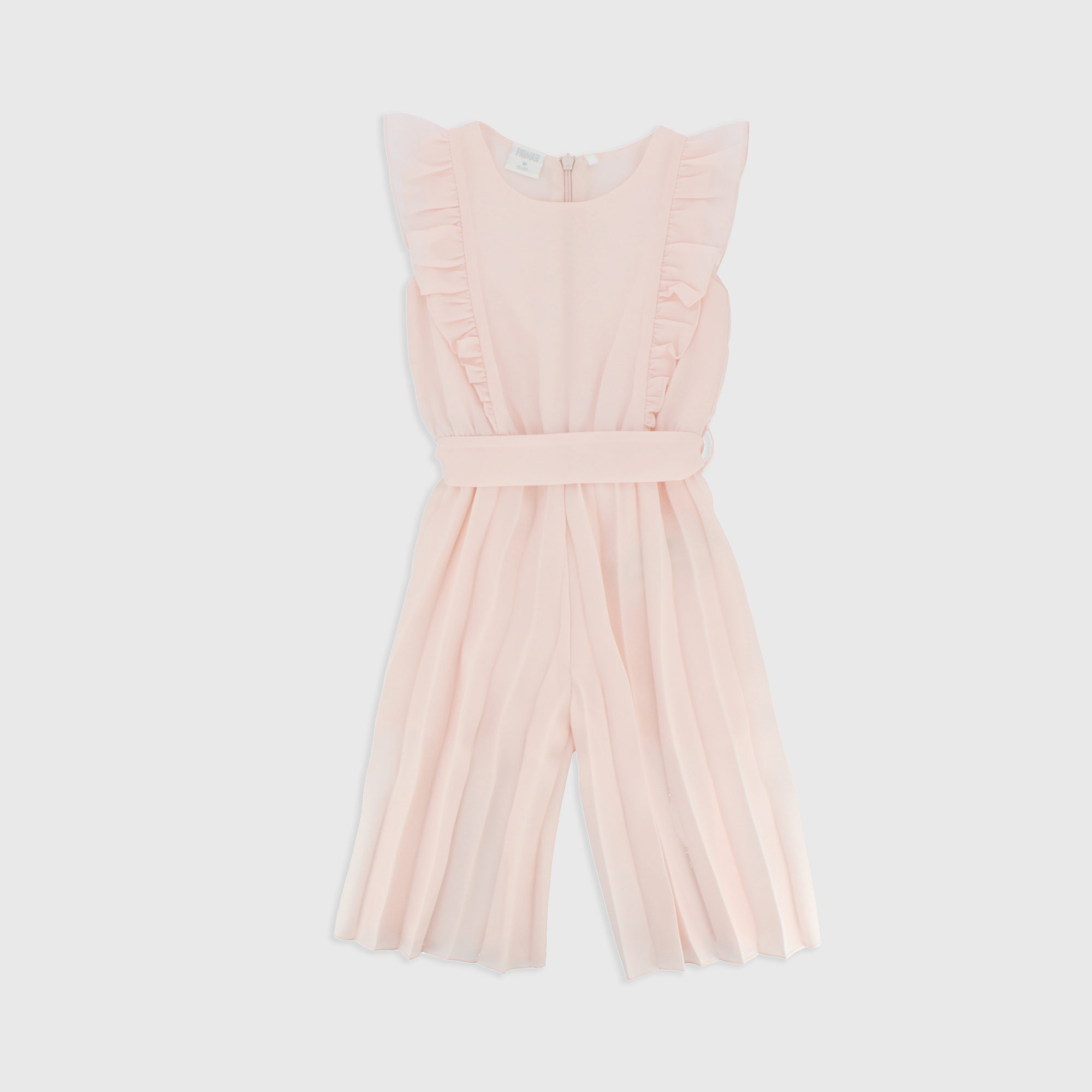 Chándal cuello redondo, sin mangas y pantalón plisado. Volantes aplicados en la parte superior. Elástico en la cintura y cierre con cremallera oculta en la parte trasera. Forro pantalón. Cinturón despegable.