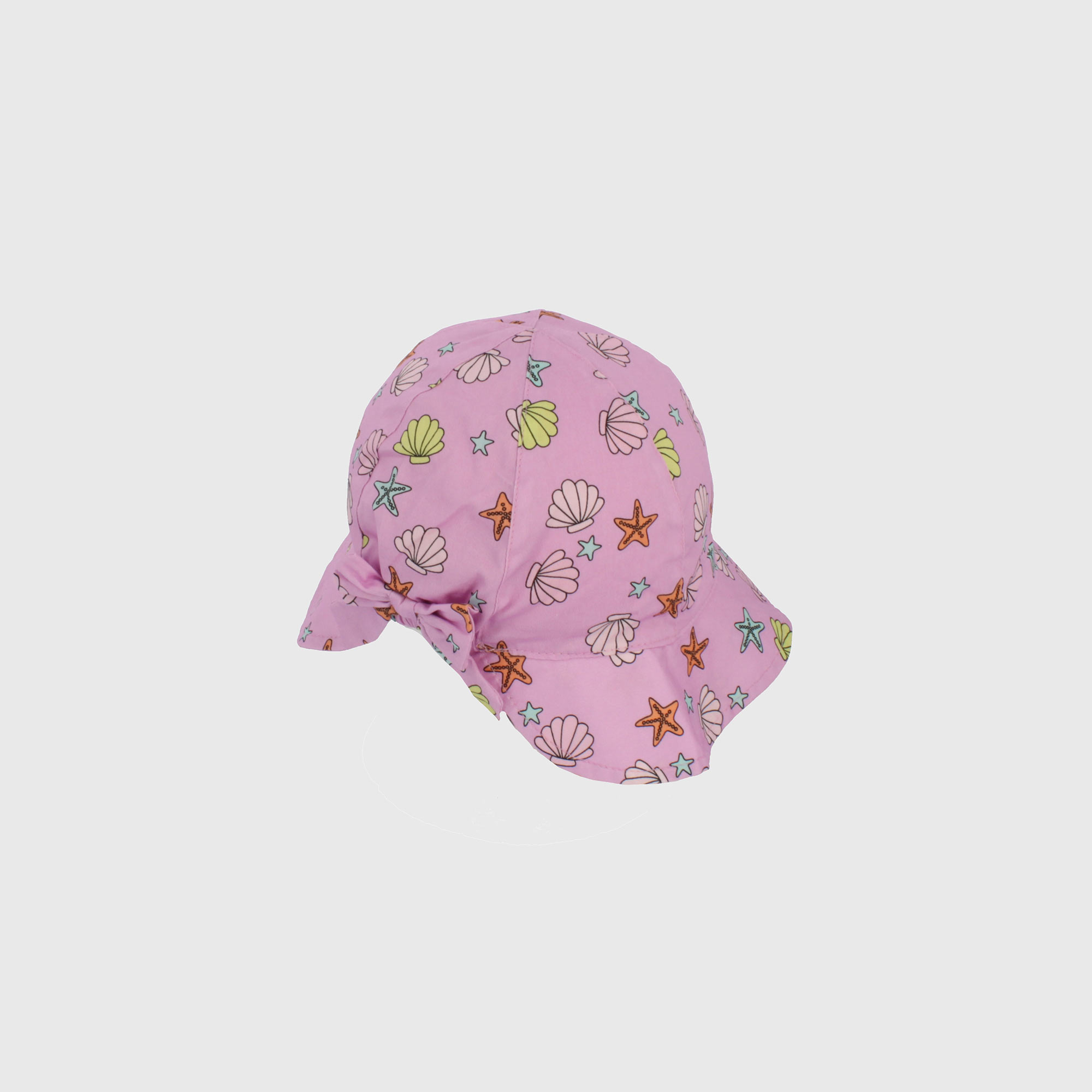 Gorro con tema mar estampado. Lazo aplicado en la parte trasera.