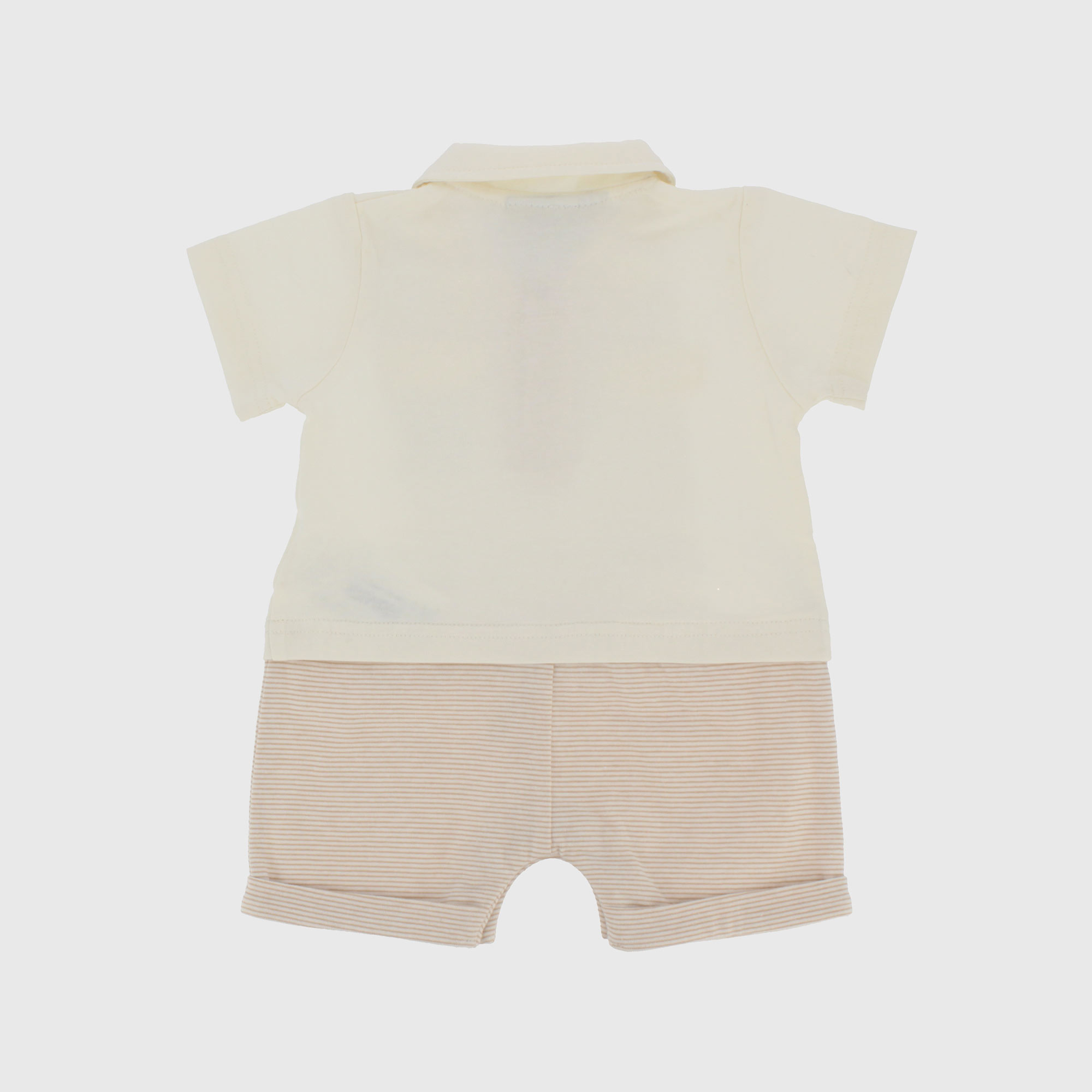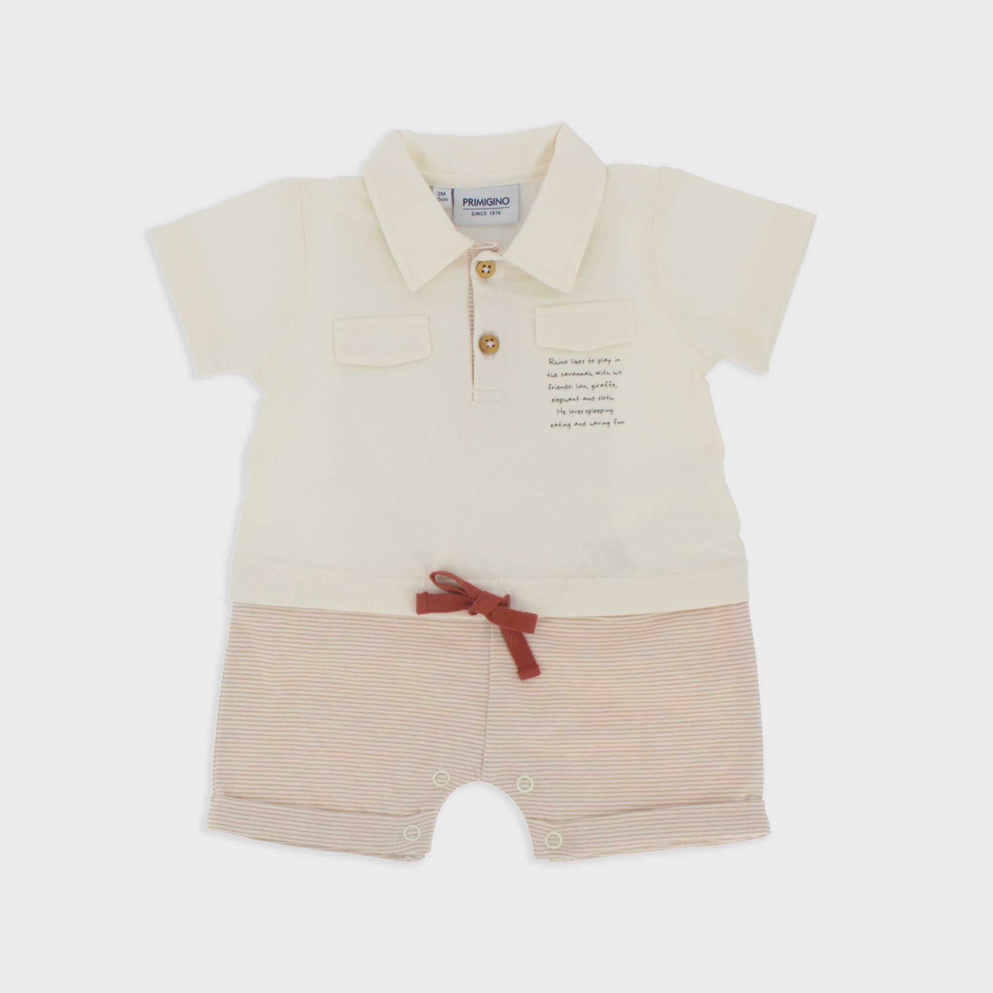 Pelele de tejido tipo jersey, con cuello, mangas cortas. Cierre con botones automáticos en la parte trasera y tiro. Escrita impresas y falsos bolsillos en la parte delantera. Rayas hilo tintado en el pantalón.