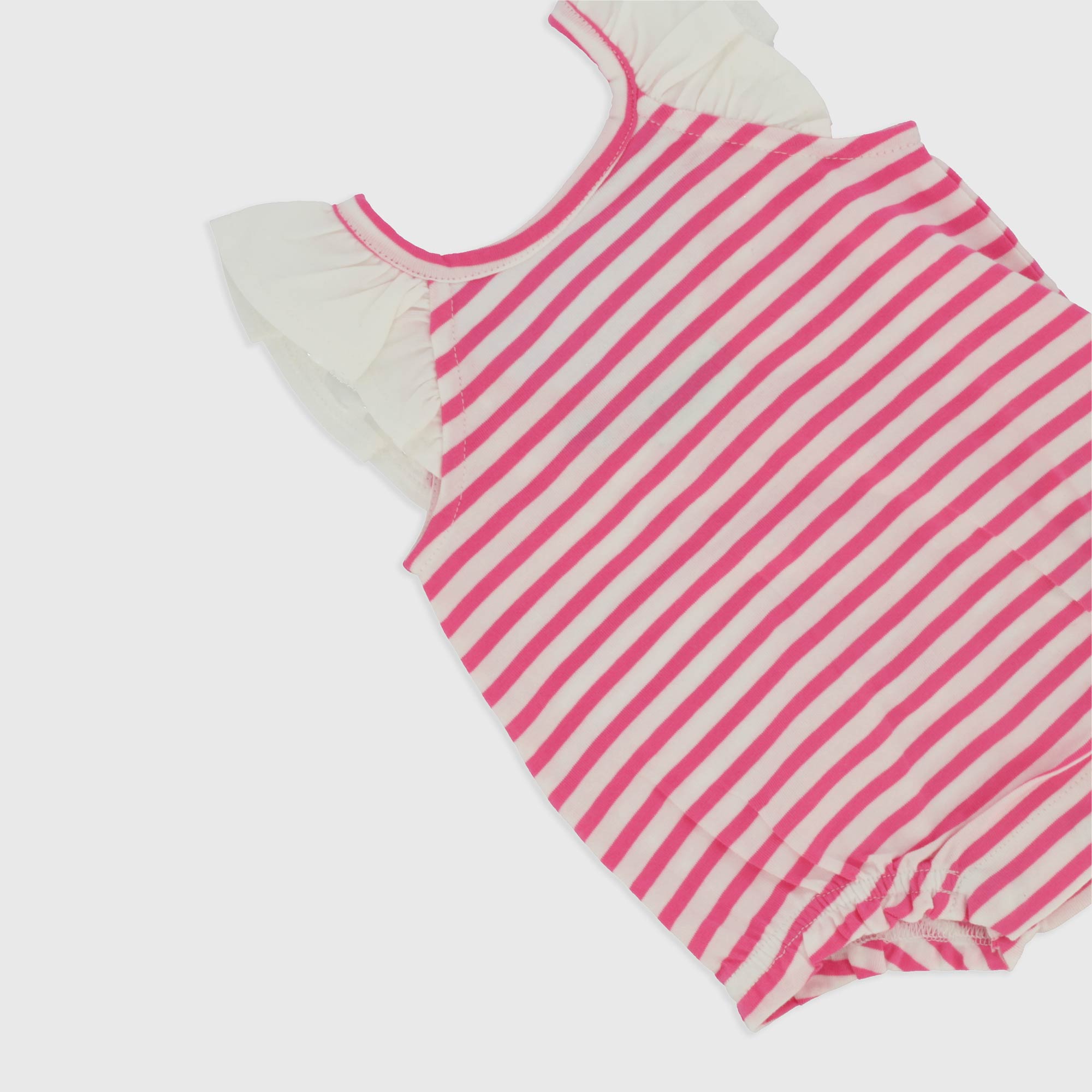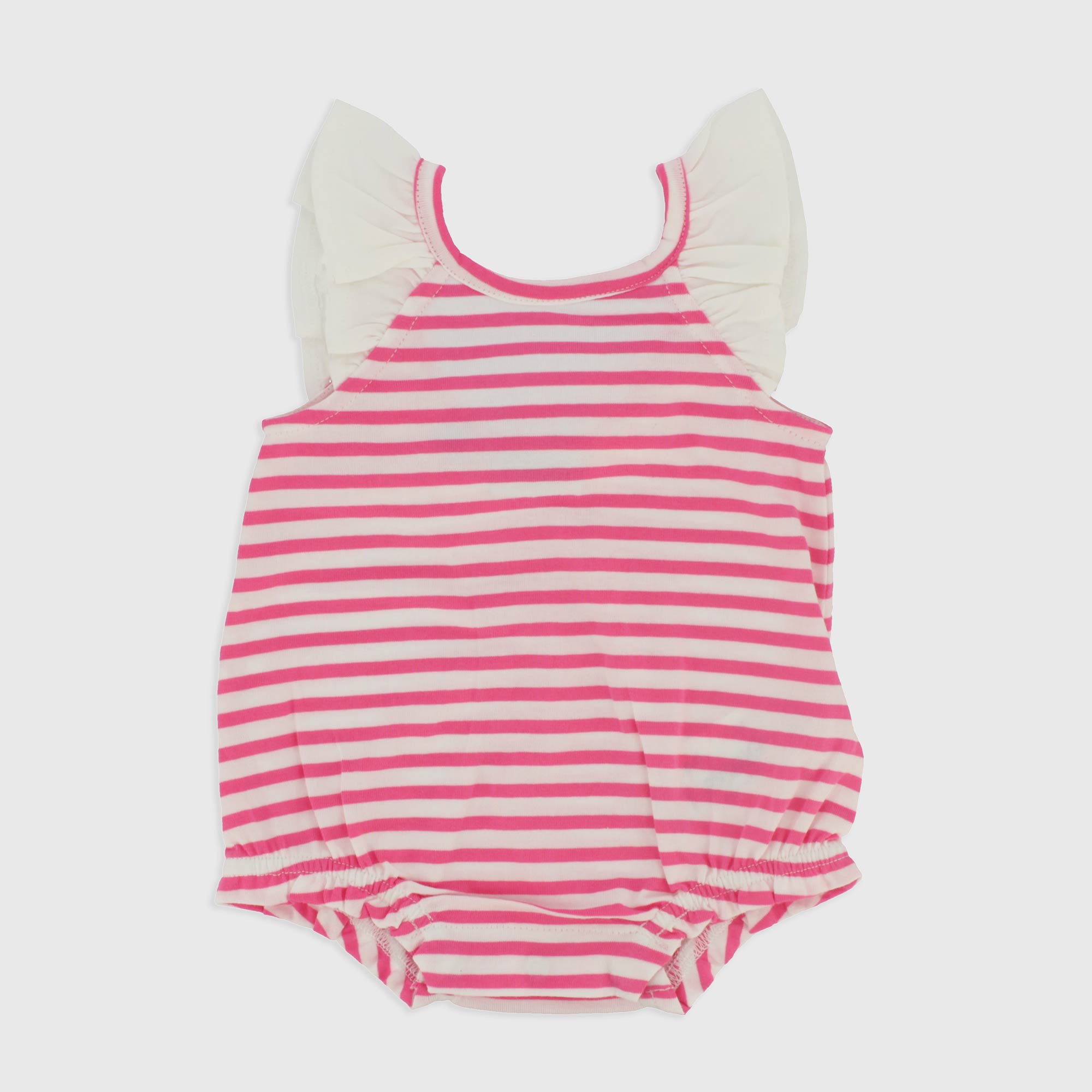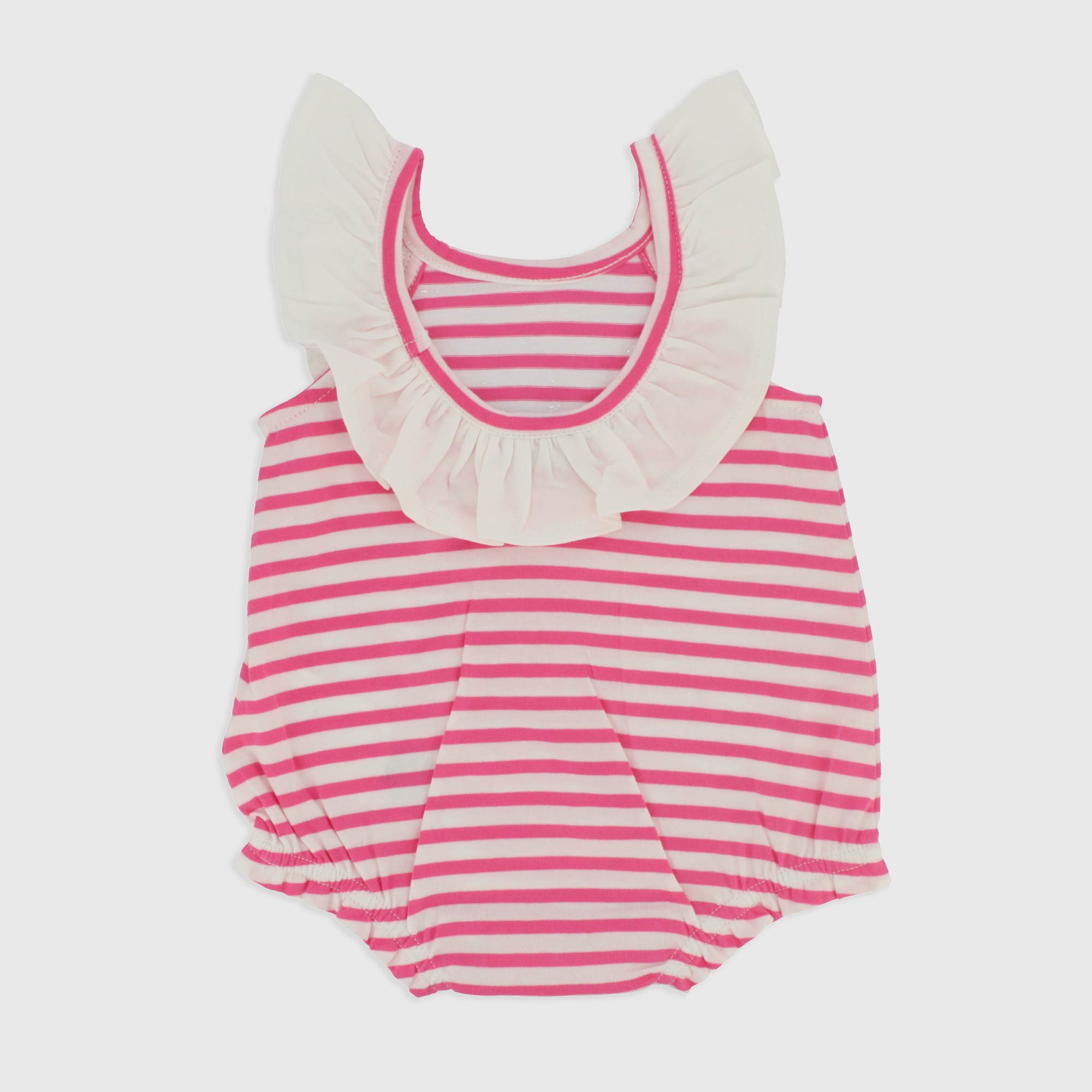 Pelele de tejido tipo jersey, raya hilo tintado, cuello redondo, sin mangas. Cierre con botones automáticos en el tiro. Volantes en los hombros.