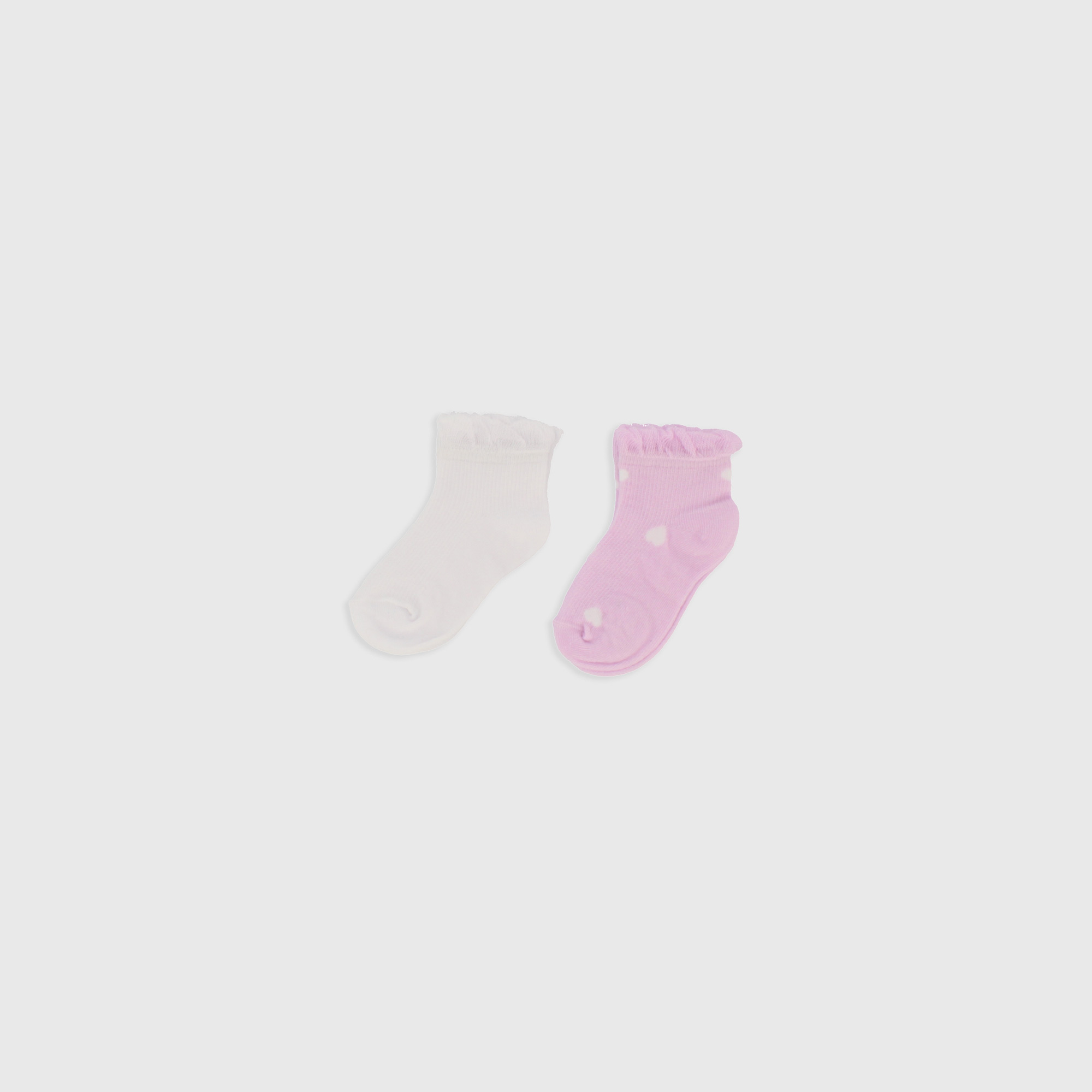 Pack de dos pares de calcetines cortos: un par con coraziones y un par de un solo color. Borde elaborado y bordes elásticos.